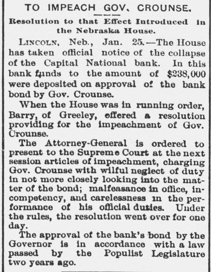 TO IMPEACH GOV. CROUNSE. Resolution to that Effect Introduced in the Nebraska House. LINCOLN, Neb., Jan. 25.-The House has taken official notice of the collapse of the Capital National bank. In this bank funds to the amount of $238,000 were deposited on approval of the bank bond by Gov. Crounse. When the House was in running order, Barry, of Greeley, offered a resolution providing for the impeachment of Gov. Crounse. The Attorney-General is ordered to present to the Supreme Court at the next session articles of impeachment, charging Gov. Crounse with wilful neglect of duty in not more closely looking into the matter of the bond; malfeasance in office, incompetency, and carelessness in the performance of his official duties. Under the rules, the resolution went over for one day. The approval of the bank's bond by the Governor is in accordance with a law passed by the Populist Legislature two years ago.