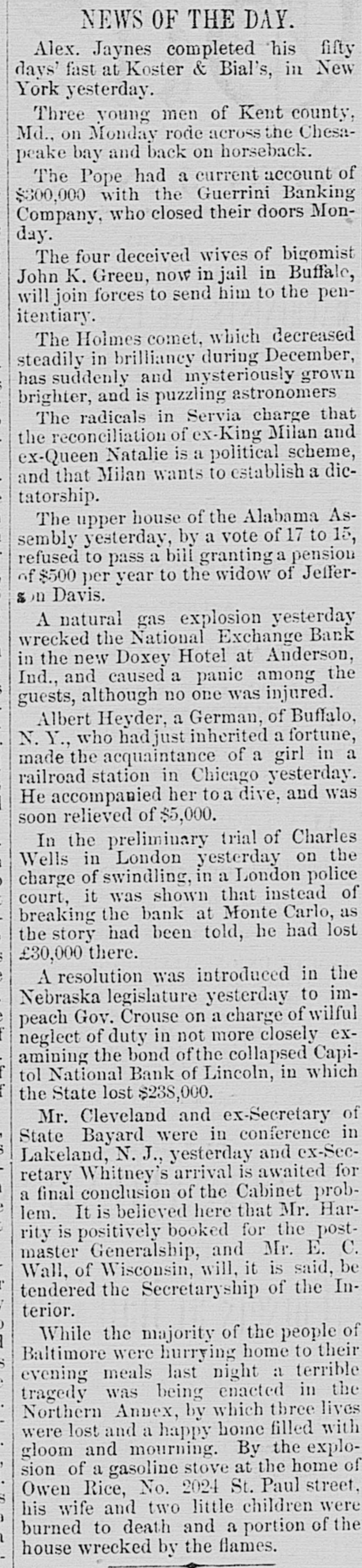 # NEWS OF THE DAY. Alex. Jaynes completed his fifty days' fast at Koster & Bial's, in New York yesterday. Three young men of Kent county, Md., on Monday rode across the Chesapeake bay and back on horseback. The Pope had a current account of $300,000 with the Guerrini Banking Company, who closed their doors Monday. The four deceived wives of bigomist John K. Green, now in jail in Buffale, will join forces to send him to the penitentiary. The Holmes comet, which decreased steadily in brilliancy during December, has suddenly and mysteriously grown brighter, and is puzzling astronomers The radicals in Servia charge that the reconciliation of ex-King Milan and ex-Queen Natalie is a political scheme, and that Milan wants to establish a dictatorship. The upper house of the Alabama Assembly yesterday, by a vote of 17 to 15, refused to pass a bill granting a pension of $500 per year to the widow of Jefferson Davis. A natural gas explosion yesterday wrecked the National Exchange Bark in the new Doxey Hotel at Anderson, Ind., and caused a panic among the guests, although no one was injured. Albert Heyder, a German, of Buffalo, N. Y., who had just inherited a fortune, made the acquaintance of a girl in a railroad station in Chicago yesterday. He accompanied her to a dive, and was soon relieved of $5,000. In the preliminary trial of Charles Wells in London yesterday on the charge of swindling, in a London police court, it was shown that instead of breaking the bank at Monte Carlo, as the story had been told, he had lost £30,000 there. A resolution was introduced in the Nebraska legislature yesterday to impeach Gov. Crouse on a charge of wilful neglect of duty in not more closely examining the bond of the collapsed Capitol National Bank of Lincoln, in which the State lost $238,000. Mr. Cleveland and ex-Secretary of State Bayard were in conference in Lakeland, N. J., yesterday and ex-Secretary Whitney's arrival is awaited for a final conclusion of the Cabinet problem. It is believed here that Mr. Harrity is positively booked for the postmaster Generalship, and Mr. E. C. Wall, of Wisconsin, will, it is said, be tendered the Secretaryship of the Interior. While the majority of the people of Baltimore were hurrying home to their evening meals last night a terrible tragedy was being enacted in the Northern Annex, by which three lives were lost and a happy home filled with gloom and mourning. By the explosion of a gasoline stove at the home of Owen Rice, No. 2024 St. Paul street, his wife and two little children were burned to death and a portion of the house wrecked by the flames.