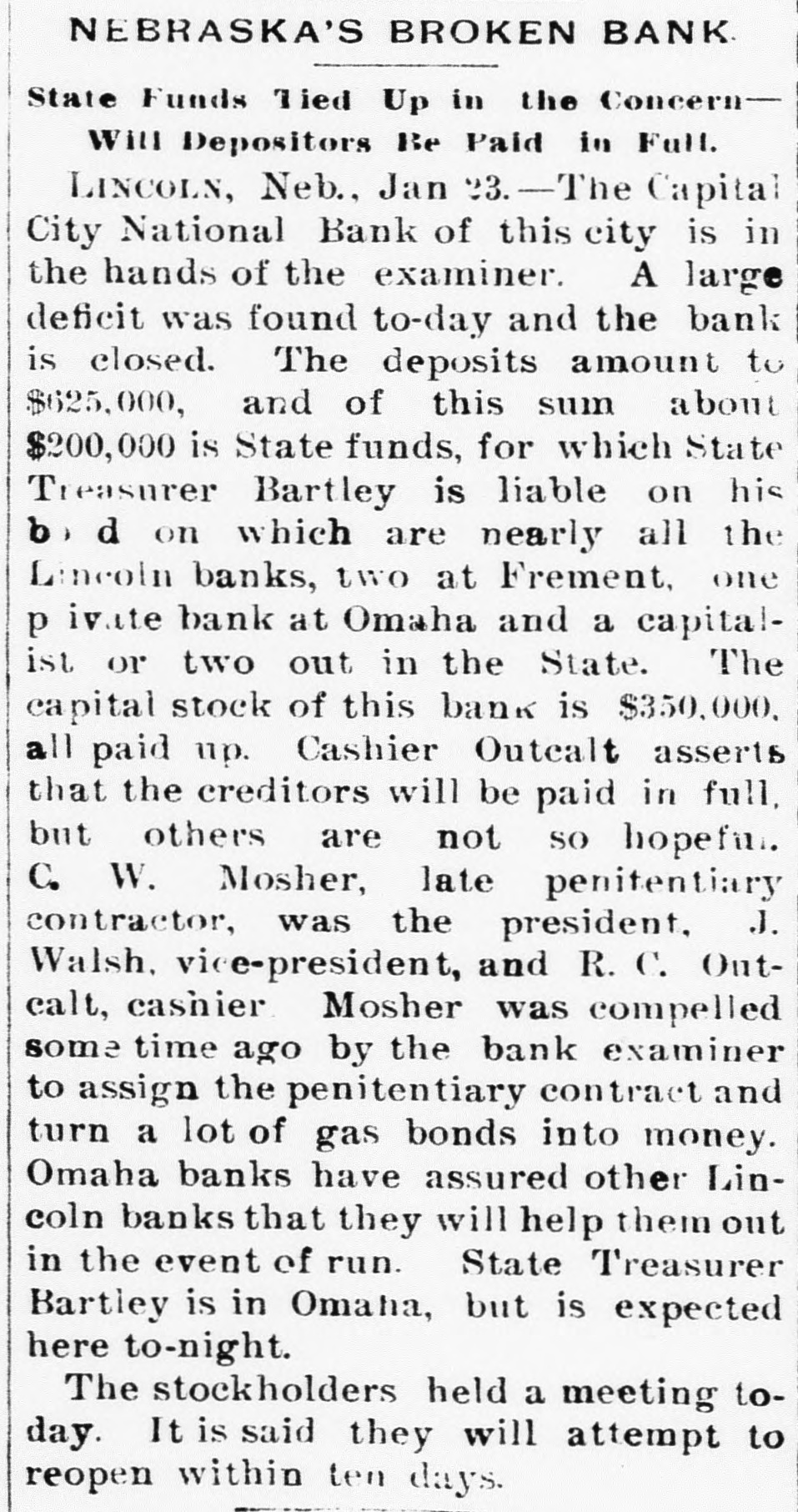 NEBRASKA'S BROKEN BANK State Funds Tied Up in the ConcernWill Depositors Be Paid in Full. LINCOLN, Neb., Jan 25 - -The Capital City National Bank of this city is in the hands of the examiner. A large deficit was found to-day and the bank is closed. The deposits amount to $625,000, and of this sum about $200,000 is State funds, for which State Treasurer Bartley is liable on his bond, on which are nearly all the Lincoln banks, two at Frement, one private bank at Omaha and a capitalist or two out in the State. The capital stock of this bank is $350,000, all paid up. Cashier Outcalt asserts that the creditors will be paid in full, but others are not so hopeful. C. W. Mosher, late penitentiary contractor, was the president, J. Walsh, vice-president, and R. C. Outcalt, cashier Mosher was compelled some time ago by the bank examiner to assign the penitentiary contract and turn a lot of gas bonds into money. Omaha banks have assured other Lincoln banks that they will help them out in the event of run. State Treasurer Bartley is in Omaba, but is expected here to-night. The stockholders held a meeting today. It is said they will attempt to reopen within ten days.
