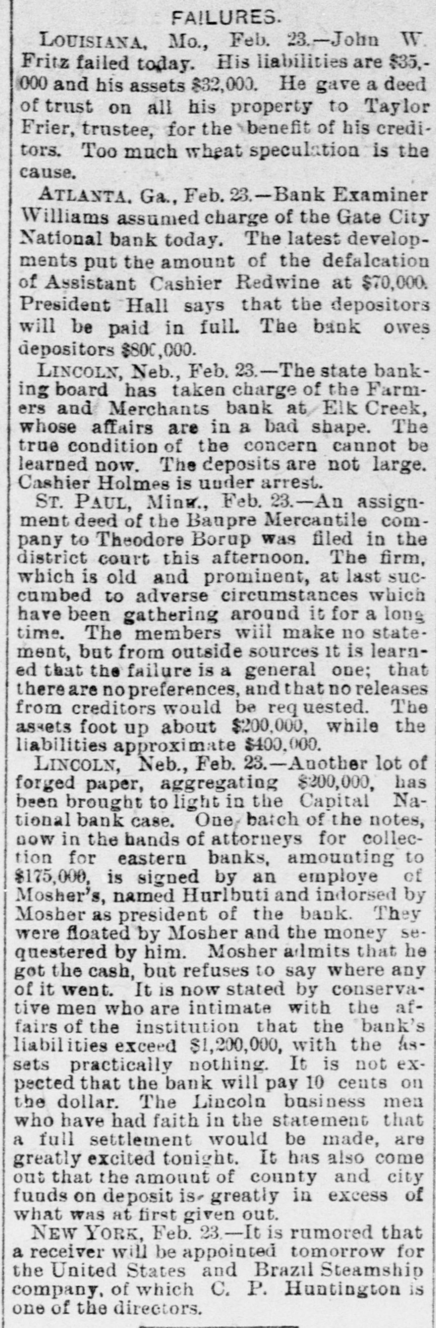 FAILURES. LOUISIANA, Mo., Feb. 23.-John W. Fritz failed today. His liabilities are $35,000 and his assets $32,000. He gave a deed of trust on all his property to Taylor Frier, trustee, for the benefit of his creditors. Too much wheat speculation is the cause. ATLANTA. Ga., Feb. 23. - Bank Examiner Williams assumed charge of the Gate City National bank today. The latest developments put the amount of the defalcation of Assistant Cashier Redwine at $70,000. President Hall says that the depositors will be paid in full. The bank owes depositors $800,000. LINCOLN, Neb., Feb. - -The state banking board has taken charge of the Farmers and Merchants bank at Elk Creek, whose affairs are in a bad shape. The true condition of the concern cannot be learned now. The deposits are not large. Cashier Holmes is under arrest. ST. PAUL, Minw., Feb. 23.-An assignment deed of the Baupre Mercantile company to Theodore Borup was filed in the district court this afternoon. The firm, which is old and prominent, at last succumbed to adverse circumstances which have been gathering around it for a long time. The members will make no state. ment, but from outside sources it is learned that the failure is a general one; that there are nopreferences, and that no releases from creditors would be req uested. The assets foot up about $200,000, while the liabilities approximate $400,000. LINCOLN, Neb., Feb. 23.-Another lot of forged paper, aggregating $200,000, has been brought to light in the Capital National bank case. One batch of the notes, now in the hands of attorneys for collection for eastern banks, amounting to $175,000, is signed by an employer of Mosher's, named Hurlbuti and indorsed by Mosher as president of the bank. They were floated by Mosher and the money sequestered by him. Mosher admits that he got the cash, but refuses to say where any of it went. It is now stated by conservative men who are intimate with the affairs of the institution that the bank's liabilities exceed $1,200,000, with the assets practically nothing. It is not expected that the bank will pay 10 cents on the dollar. The Lincoln business men who have had faith in the statement that a full settlement would be made, are greatly excited tonight. It has also come out that the amount of county and city funds on deposit is- greatly in excess of what was at first given out. NEW YORK, Feb. 23.-It is rumored that a receiver will be appointed tomorrow for the United States and Brazil Steamship company, of which C. P. Huntington is one of the directors.