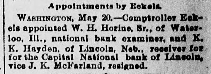 K. K. Hayden, of Lincoln, Neb., receiver for the Capital National bank of Lincoln, vice J. K. McFarland, resigned.