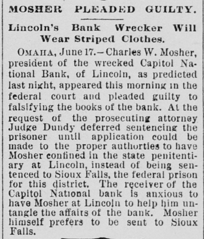 MOSHER PLEADED GUILTY. Lincoln's Bank Wrecker Will Wear Striped Clothes. OMAHA, June 17. Charles W. Mosher, president of the wrecked Capitol National Bank, of Lincoln, as predicted last night, appeared this morning in the federal court and pleaded guilty to falsifying the books of the bank. At the request of the prosecuting attorney Judge Dundy deferred sentencing the prisoner until application could be made to the proper authorities to have Mosher confined in the state penitentiary at Lincoln, instead of being sentenced to Sioux Falls, the federal prison for this district. The receiver of the Capitol National bank is anxious to have Mosher at Lincoln to help him untangle the affairs of the bank. Mosher himself prefers to be sent to Sioux Falls.