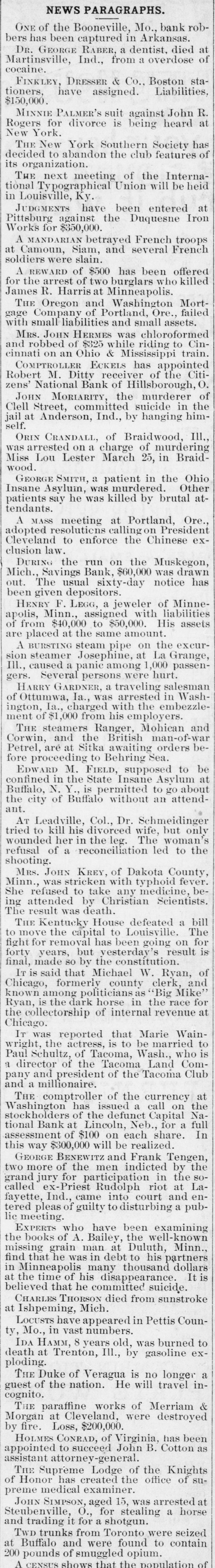 NEWS PARAGRAPHS. ONE of the Booneville, Mo. bank robbers has been captured in Arkansas. DR. GEORGE RABER, a dentist, died at Martinsville, Ind., from a overdose of cocaine. FINKLEY DRESSER & Co., Boston stationers, have assigned. Liabilities, $150,000. MINNIE PALMER'S suit against John R. Rogers for divorce is being heard at New York. THE New York Southern Society has decided to abandon the club features of its organization. THE next meeting of the International Typographical Union will beheid in Louisville, Ky. JUDGMENTS have been entered at Pittsburg against the Duquesne Iron Works for $350,000. A MANDARIAN betrayed French troops at Camoun, Siam, and several French soldiers were slain. A REWARD of $500 has been offered for the arrest of two burglars who killed James R. Harrisat Minneapolis. THE Oregon and Washington Mortgage Company of Portland, Ore., failed with small liabilities and small assets. MRS. JOHN HERMES was chloroformed and robbed of $325 while riding to Cincinnati on an Ohio & Mississippi train. COMPTROLLER ECKELS has appointed Robert M. Ditty receiver of the Citizens' National Bank of Hillsborough, O. JOHN MORIARITY, the murderer of Clell Street, committed suicide in the jail at Anderson, Ind., by hanging himself. ORIN CRANDALL, of Braidwood, Ill., was arrested on a charge of murdering Miss Lou Lester March 25, in Braidwood. GEORGE SMITH, a patient in the Ohio Insane Asylum, was murdered. Other patients say he was killed by brutal attendants. A MASS meeting at Portland, Ore. adopted resolutions calling on President Cleveland to enforce the Chinese exclusion law. DURING the run on the Muskegon, Mich., Savings Bank, $60,000 was drawn out. The usual sixty-day notice has been given depositors. HENRY F. LEGG, a jeweler of Minneapolis, Minn., assigned with liabilities assets of from $40,000 to $50,000. His are placed at the same amount. BURSTING steam pipe on the excursion steamer Josephine, at La Grange, Ill., caused a panic among 1,000 passengers. Several persons were hurt. HARRY GARDNER, a traveling salesman of Ottumwa, Ia., was arrested in Washington, Ia., charged with the embezzlement of $1,000 from his employers. THE steamers Ranger, Mohican and Corwin, and the British man-of-war Petrel, aré at Sitka awaiting orders before proceeding to Behring Sea. EDWARD M. FIELD, supposed to be confined in the State Insane Asylum at Buffalo, N. Y., is permitted to go about the city of Buffalo without an attendant. AT Leadville, Col., Dr. Schmeidinger tried to kill his divorced wife, but only wounded her in the leg. The woman's refusal of a reconciliation led to the shooting. MRS. JOHN KREY, of Dakota County, Minn., was stricken with typhoid fever. She refused to take any medicine, being attended by Christian Scientists. The result was death. THE Kentucky House defeated a bill to move the capital to Louisville. The fight for removal has been going on for forty years, but yesterday's result is final, made SO by the constitution. IT is said that Michael W. Ryan, of Chicago, formerly county clerk, and known among politicians as Big Mike' Ryan, is the dark horse in the race for the collectorship of internal revenue at Chicago. IT was reported that Marie Wainwright, the actress, is to be married to Paul Schultz, of Tacoma, Wash., who is a director of the Tacoma Land Company and president of the Tacoma Club and a millionaire. THE comptroller of the currency at Washington has issued a call on the stockholders of the defunct Capital National Bank at Lincoln, Neb., for a full In assessment of $100 on each share. this way $300,000 will be realized. GEORGE BENEWITZ and Frank Tengen, two more of the men indicted by the grand jury for participation in the socalled ex-Priest Rudolph riot at Lafayette, Ind. came into court and entered pleas of guilty to disturbing a public meeting. EXPERTS who have been examining the books of A. Bailey, the well-known missing grain man at Duluth, Minn., find that he was in debt to his partners in Minneapolis many thousand dollars is at the time of his disappearance. It believed that he committed suicide. CHARLES THORSON died from sunstroke at Ishpeming, Mich. LOCUSTS appeared in Pettis County, Mo., in vast numbers. IDA HAMM, 8 years old, was burned to death at Trenton, Ill., by gasoline exploding. THE Duke of Veragua is no longer a guest of the nation. He will travel incognito. THE paraffine works of Merriam & Morgan at Cleveland, were destroyed by fire. Loss, $200,000. HOLMES CONRAD, of Virginia, has been appointed to succeed John B. Cotton as assistant attorney-general. THE Supreme Lodge of the Knights of Honor has created the office of supreme medical examiner. JOHN SIMPSON, aged 15, was arrested at Steubenville, O., for stealing a horse and trading it for a shotgun. TWD trunks from Toronto were seized at Buffalo and were found to contain pounds of smuggled opium.