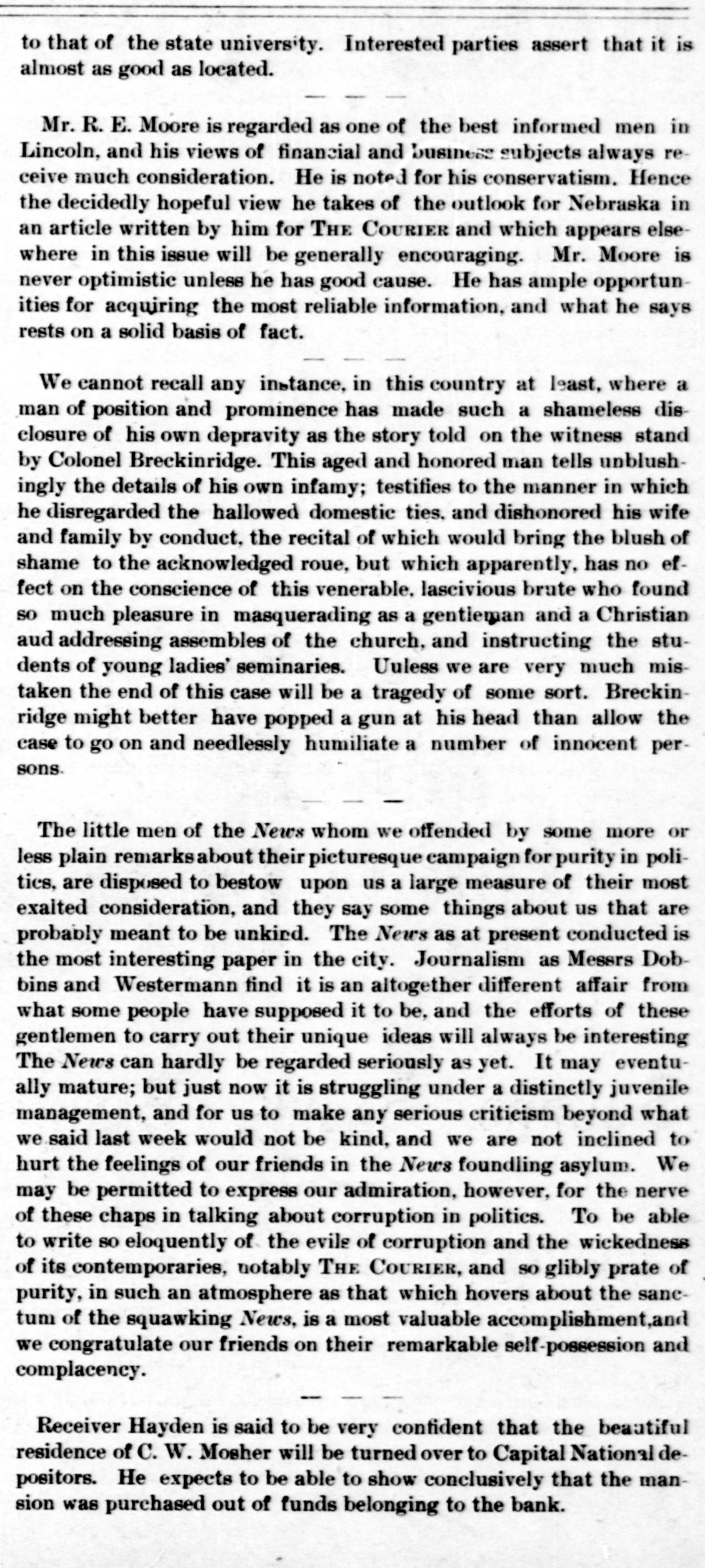 Mr. R. E. Moore is regarded as one of the best informed men in Lincoln, and his views of financial and business subjects always receive much consideration. He is noted for his conservatism. Hence the decidedly hopeful view he takes of the outlook for Nebraska in an article written by him for THE COURIER and which appears elsewhere in this issue will be generally encouraging. Mr. Moore is never optimistic unless he has good cause. He has ample opportunities for acquiring the most reliable information, and what he says rests on a solid basis of fact. We cannot recall any instance, in this country at least, where a man of position and prominence has made such a shameless disclosure of his own depravity as the story told on the witness stand by Colonel Breckinridge. This aged and honored man tells unblushingly the details of his own infamy; testifies to the manner in which he disregarded the hallowed domestic ties, and dishonored his wife and family by conduct, the recital of which would bring the blush of shame to the acknowledged roue, but which apparently, has no effect on the conscience of this venerable, lascivious brute who found so much pleasure in masquerading as a gentleman and a Christian aud addressing assembles of the church, and instructing the students of young ladies' seminaries. Uuless we are very much mistaken the end of this case will be a tragedy of some sort. Breckinridge might better have popped a gun at his head than allow the case to go on and needlessly humiliate a number of innocent persons. The little men of the News whom we offended by some more or less plain remarks about their picturesque campaign for purity in politics, are disposed to bestow upon us a large measure of their most exalted consideration, and they say some things about us that are probably meant to be unkind. The News as at present conducted is the most interesting paper in the city. Journalism as Messrs Dobbins and Westermann find it is an altogether different affair from what some people have supposed it to be, and the efforts of these gentlemen to carry out their unique ideas will always be interesting The News can hardly be regarded seriously as yet. It may eventually mature; but just now it is struggling under a distinctly juvenile management, and for us to make any serious criticism beyond what we said last week would not be kind, and we are not inclined to hurt the feelings of our friends in the News foundling asylum. We may be permitted to express our admiration, however, for the nerve of these chaps in talking about corruption in politics. To be able to write so eloquently of the evils of corruption and the wickedness of its contemporaries, notably THE COURIER, and so glibly prate of purity, in such an atmosphere as that which hovers about the sanctum of the squawking News, is a most valuable accomplishment,and we congratulate our friends on their remarkable self-possession and complacency. Receiver Hayden is said to be very confident that the beautiful residence of C. W. Mosher will be turned over to Capital National depositors. He expects to be able to show conclusively that the mansion was purchased out of funds belonging to the bank.