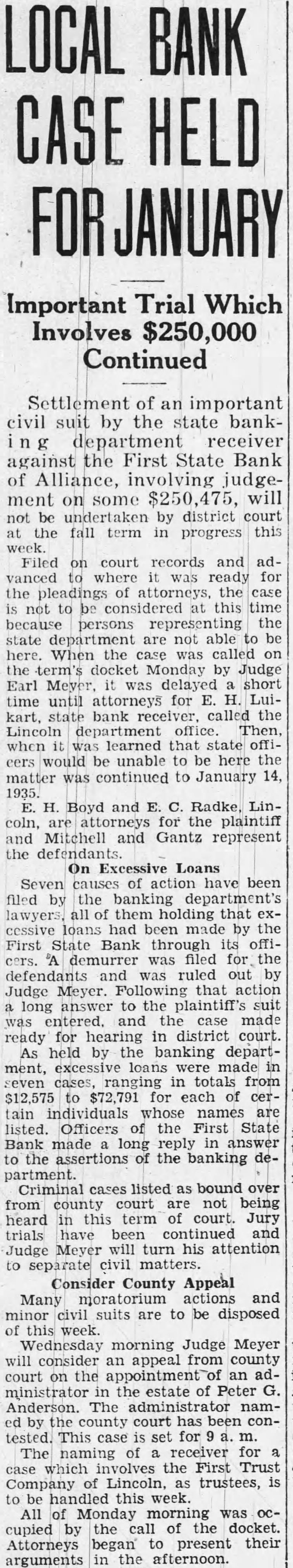 BANK CASE Important Trial Which Continued Settlement of important civil suit by the state bankdepartment receiver against the First State Bank of Alliance, involving ment on some will by district court the fall term in progress this Filed court records and advanced where was ready for the pleadings attorneys, not to considered this time because representing the persons department able be here. When the case was called the term's docket Monday by Judge Earl Meyer. delayed short until attorneys for Luibank receiver, called the Lincoln department office. when learned that state would unable to be here the matter continued to January Boyd Radke, Linfor the plaintiff Mitchell and Gantz represent the defendants. On Excessive Loans Seven causes action have been filed by department's them that had made by the First Bank through its offiwas filed for the defendants and ruled out Judge Meyer. that long answer to the and made ready for hearing in district court. As held the banking department, made ranging in from $12,575 to for each whose names listed. Officers the First State Bank made long reply answer the assertions the banking partment. Criminal cases listed bound from county court not heard in term court. Jury trials have been continued Judge Meyer turn his attention separate civil matters. Consider County Appeal Many actions and minor suits are to be disposed this Wednesday morning Judge Meyer will consider appeal from county court on the the estate Peter Anderson. The administrator court has been tested. This case for The naming receiver the First Trust Company Lincoln, trustees, this week. All of Monday morning was cupied the of docket. Attorneys began present their arguments in the afternoon.