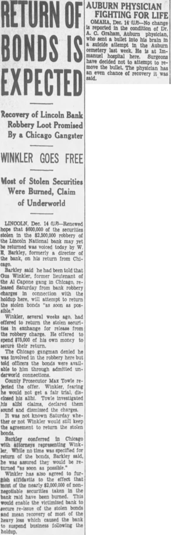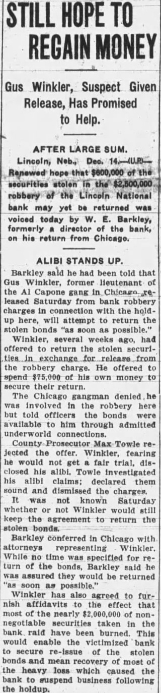 "Three banks failed because of this robbery," said Mr. Barkley, but I am happy to say that now the depositors in those banks will get a much larger dividend. Six or seven other correspondent banks of the Lincoln National are now safe and their securities, representing chiefly; capital stock deposited in the Lincoln National, will be returned to them. "As for the Lincoln National itself, its assets have been sold, but its stockholders and depositors who had securities deposited for safe keeping in its vaults will get them back." Mr. Barkley estimated the stockholders and depositors had stood to lose about equally, and that altogether there were perhaps one hundred individuals affected. He could make no estimate of the number of depositors in the correspondent banks which will be benefited. Intermittent jets of drama flared up during the 16 months since the raid on the bank in Lincoln, throwing bold light at times on the quiet determined investigation chiefly by Steffens and the "Secret Six." The inquiry has gone forward in many states of the middle west, police of Nebraska, Iillinois, Michigan, Iowa and a number of other states pooling their resources to trail the robber band and uncover the loot. Throughout the intervening months Winkler has loomed as the chief figure in the investigation. Captured near Benton Harbor, Mich., after an auto accident that cost him the sight of one eye, the gangster-aviator vowed his innocence but was "identi fied" and taken to Nebraska, where Pop Lee and Tommy O'Connor of East St. Louis already had been convicted and sentenced to 25 years each in the pen.