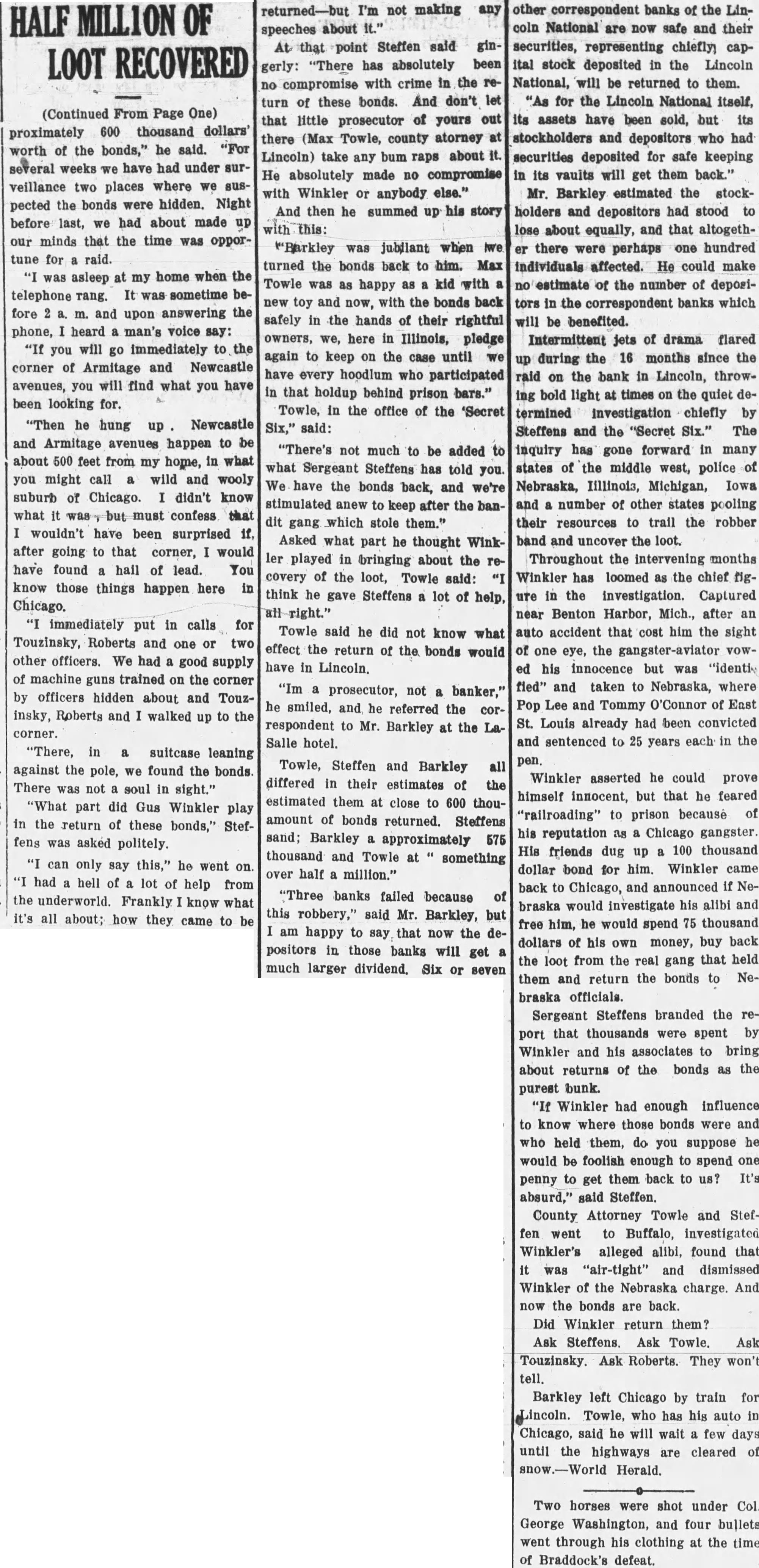 Winkler asserted he could prove himself innocent, but that he feared "railroading" to prison because of his reputation as a Chicago gangster. His friends dug up a 100 thousand dollar bond for him. Winkler came back to Chicago, and announced if Nebraska would investigate his alibi and free him, he would spend 75 thousand dollars of his own money, buy back the loot from the real gang that held them and return the bonds to Nebraska officials. Sergeant Steffens branded the report that thousands were spent by Winkler and his associates to bring about returns of the bonds as the purest bunk. "If Winkler had enough influence to know where those bonds were and who held them, do you suppose he would be foolish enough to spend one penny to get them back to us? It's absurd," said Steffen. County Attorney Towle and Steffen went to Buffalo, investigated Winkler's alleged alibi, found that it was "air-tight" and dismissed Winkler of the Nebraska charge. And now the bonds are back. Did Winkler return them? Ask Steffens. Ask Towle. Ask Touzinsky. Ask Roberts. They won't tell.