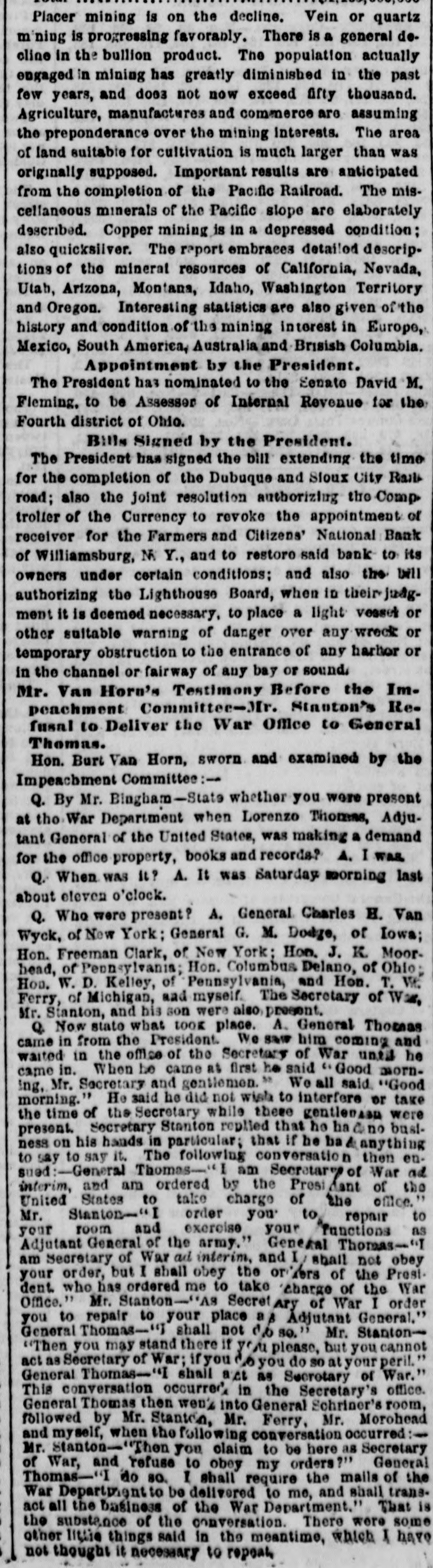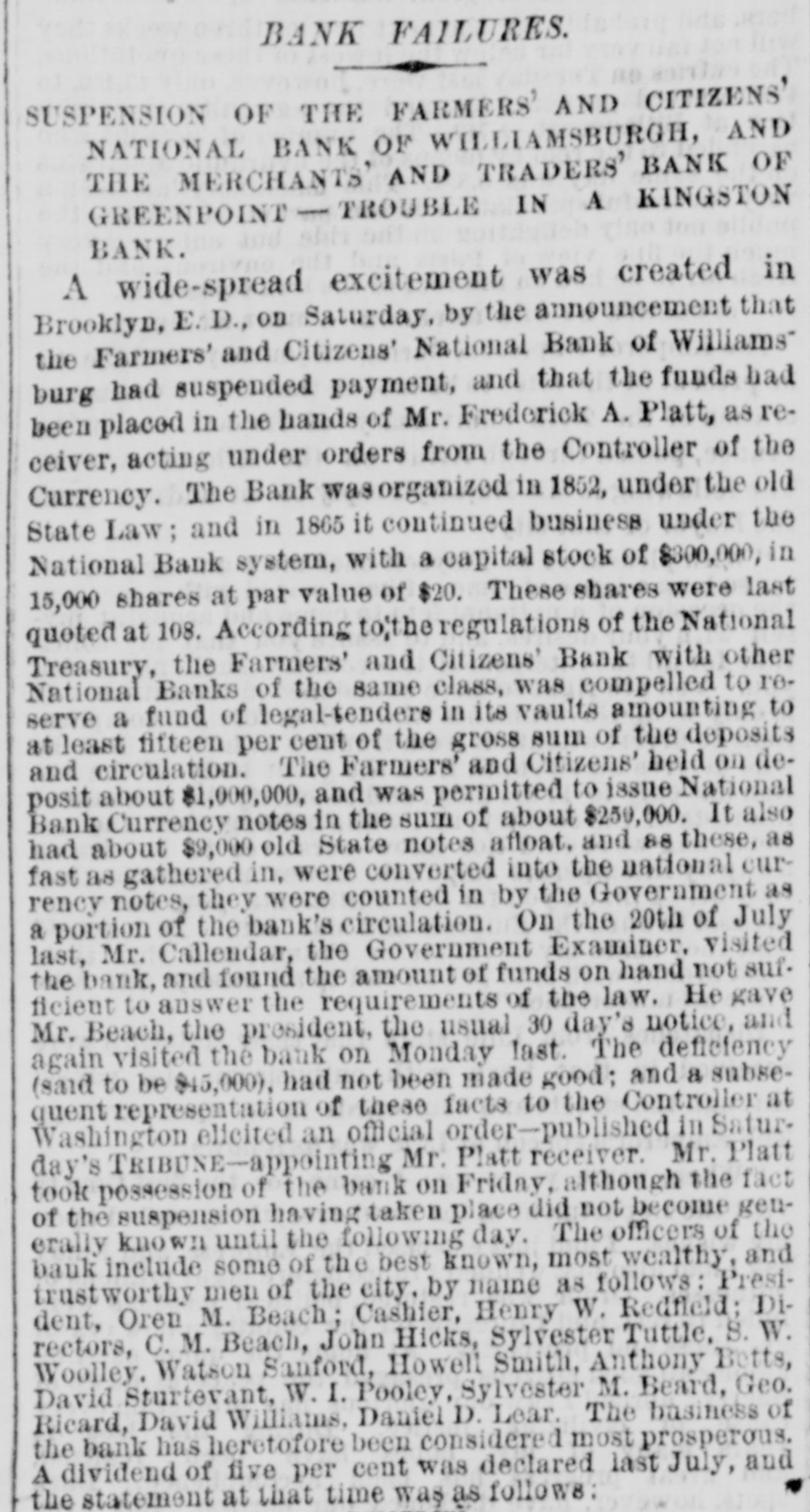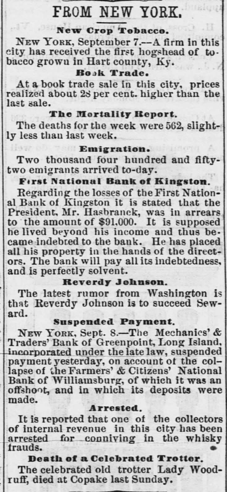 EUROPE The news report by the Atlantic cable is dated yesterday evening. September 7. The Prussian government issued a peace circular in which it 18 stated that the pacific declarations of the Marquis de Moustier, the French Foreign Minister, are "highly satisfactory." General Garibaldi dined with the Prussian Minister in Florence, by special invitation, when on his way to the Peace Congress of the revolutionists in Geneva The Austrian cabinet has been reconstructed. A number of Irish policemen have been dec. orated with English medals for action in the Fenian campaign. The little American schooner John T. Ford drifted to the coast of Ireland after being capsized. Valuable papers have been found on the wreck and se. cured. The Turkish naval authorities on the coast of Candia compelled an American vessel to desist from shipping insurrectionary refugees. Consols closed at 943. for money. in London. Five. twenties were at 73% and firmer in London, and at 77 in Frankfort. The Liverpool cotton market was easier, with middling uplands at 10d. Breadstuffs firm. Provisions and produce without material change. MISCELLANEOUS. Further particulars of the Naugatuck railroad accident disclose the fact that a passenger car was also precipitated from the bridge but without injury to the passengers. or the sixteen inmates of the baggage car which was swept with wonderful rapidity down the stream by the swollen current, eight lost their lives and four bodies have been recovered. A coroner's jury rendered a verdict stating that the bridge was an " insufficient struc. ture." Intense excitement prevailed among the depositors in the Farmers' and Citizens' National Bank, of Brooklyn, yesterday on receipt of the information that the institution bad been placed in the hands of a receiver. Heavy losses are experienced by this blow among the merchants of Williamsburg. The doors of the building were sealed yesterday, and no admittance was given to any of the numerous unfortunate ones who crowded about it demanding some redress. It is stated that the president of the bank kept his knowledge of the notification received from the Treasury Department for nearly a month from the directors. and the collapse was as adden to them as to the stockholders. No statement of the affairs of the bank has yet been put forth by the directors. The Merchants' and Traders' Bank, of Greenpoint, also suspended payment yesterday, as all its deposits were in the hands of the defunct institution. Several of the banks suffered slight losses by this double failure. An inquest was held on the body of John O'Flynn yesterday at Bellevue Hospital, and a verdict was ren. dered that he came to ha death from the effects of a fracture of the skull produced by a blow from the fist of William McKenzie, who has been arrested. General Griffin has assumed command at New Orleans, and in his initial order directs that all existing orders will remain is force. The Montreal riots have ceased and the town is again quiet. One man killed and thirty serious wounds from gunshots and stones are the sum total of casualties on rough estimation. Several of the alleged rineleaders were discharged from custody by the court yesterday. Middleton. an oil merchant, whose stores in Montreal were recently destroyed by fire, is reported to have absconded, leaving behind 3 deficiency of $43,000 on his books. General Sheridan arrived in Cairo yesterday, and started immediately by rail for St. Louis, no time being given for a demonstration in Cairo, beyond firing a salute. The population of San Francisco is now 130,000, an increase of 74,000 in seven years. A defaulting cashier in San Francisco recently ab. seconded for China with $100,000 worth of "misapproprinted" funds. The California election, it is claimed, was carried solely through the apathy of republicans. Some of the strong republican counties showed a heavy falling off in the vote polled, and even went strongly democratic. M. Alphonse Dano, the late French Minister in Mexico, sailed from this port yesterday for France. Frederick Horricks, the late Belgian Charge d'Affaires in Mexico, accompanied him. A Washington correspondent of a Boston paper states that the President's friends have telegraphed to General McClelian to come on to Washington, if he will attach himself to the President's cause. Abraham Myers, the conservative candidate for Mayor of Nashville, was killed by a fall from a staircase yes. serday. It was rumored in Washington yesterday that Secretary Seward had resigned. and that Reverdy Johnson was to be appointed Secretary of State. Secretary McCulloch is about preparing a revised and corrected statement of the public debt, in which he will show that the debt has been reduced nearly $265,000,000 within the last two years. Forty-three deaths from yellow fever occurred in New Orienas vesterday. Boats from that city are placed under quarantine at Vicksburg. The Newburg boat race was again postponed yesterday owing to the roughness of the water; this timel until Monday. The Fenian Congress at Cleveland yeaterday appolated . committee to confer with a committee from the Savage