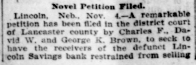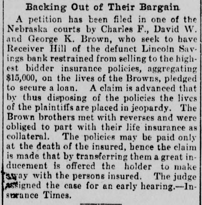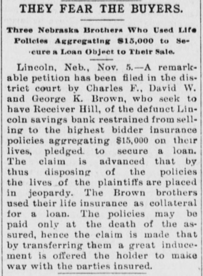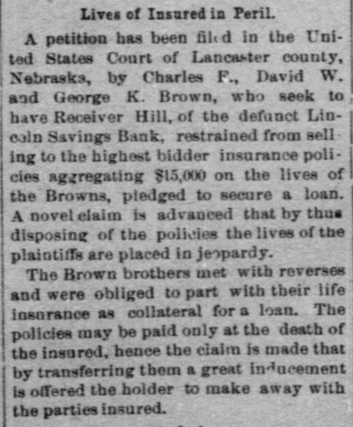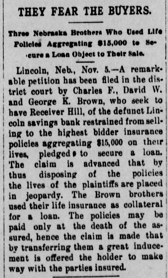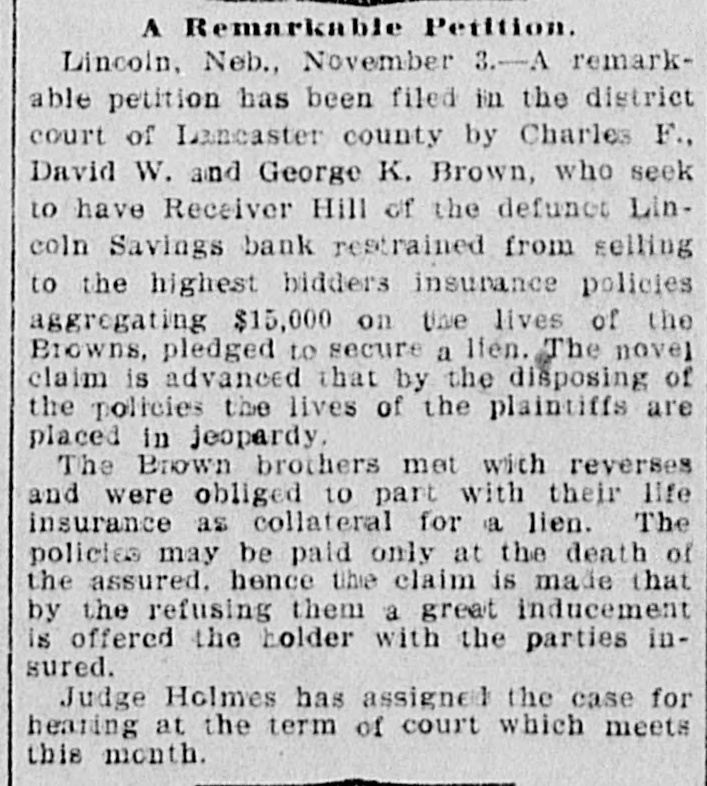 A Remarkable Petition. Lincoln, Neb., November 3.-A remarkable petition has been filed in the district court of Lancaster county by Charles F., David W. and George K. Brown, who seek to have Receiver Hill of the defunet Lincoln Savings bank restrained from selling to the highest bidders insurance policies aggregating $15,000 on the lives of the Browns, pledged to secure a lien. The novel claim is advanced that by the disposing of the policies the lives of the plaintiffs are placed in jeopardy. The Brown brothers met with reverses and were obliged to part with their life insurance as collateral for a lien. The policies may be paid only at the death of the assured. hence the claim is made that by the refusing them a great inducement is offered the holder with the parties insured. Judge Holmes has assigned the case for hearing at the term of court which meets this month.