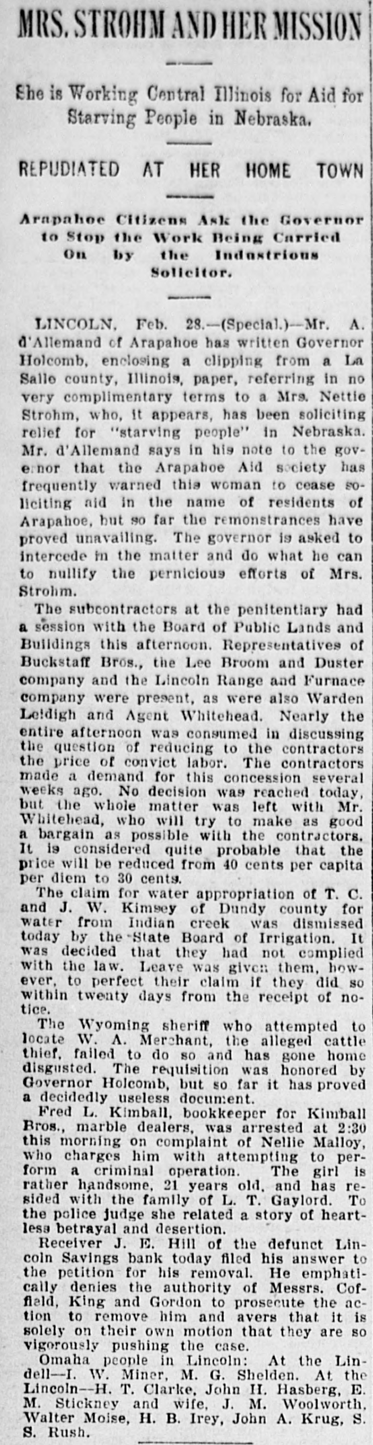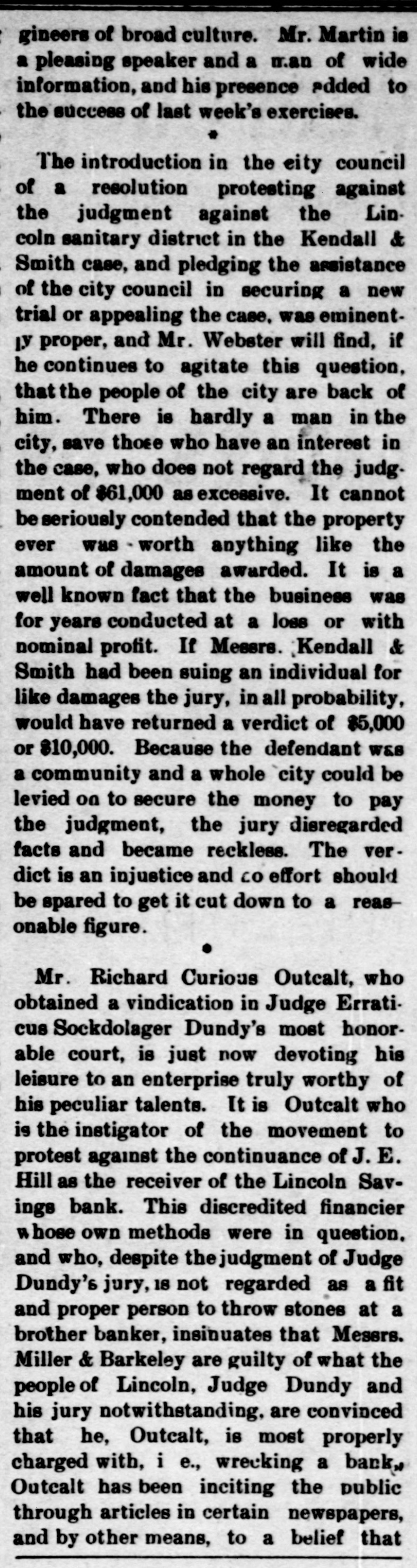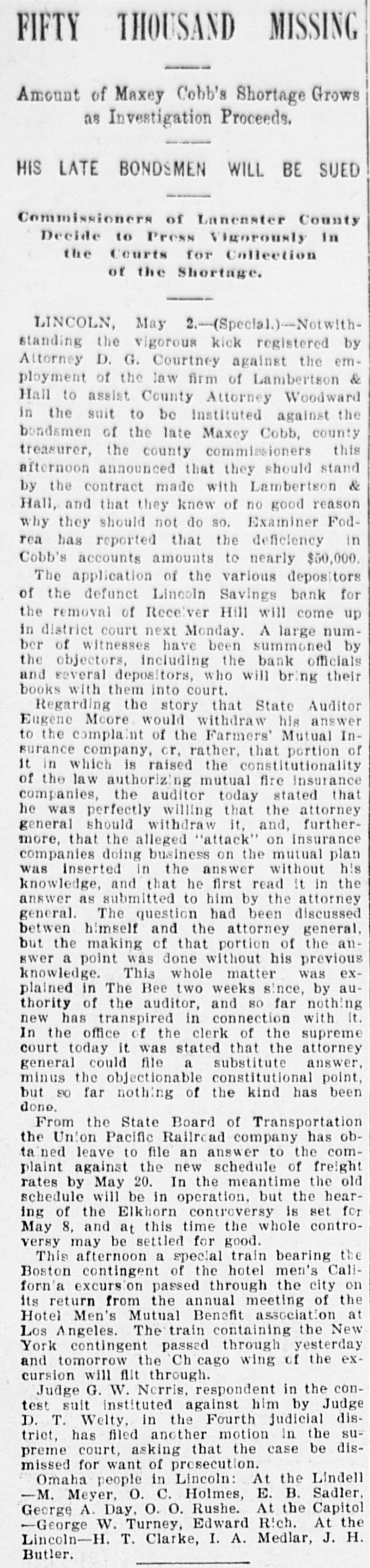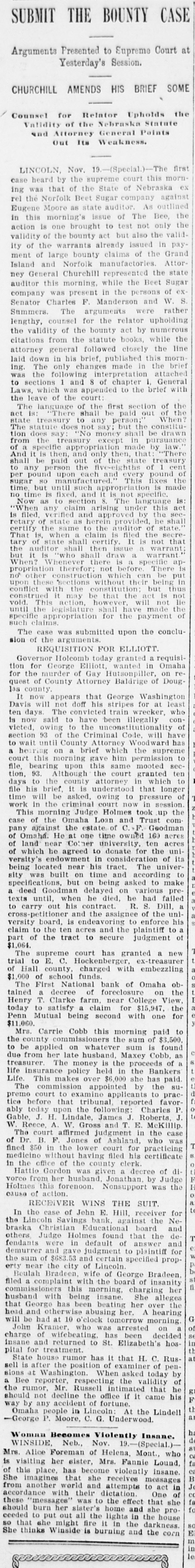 SUBMIT THE BOUNTY CASH Arguments Presented to Supreme Court a Yesterday's Session. CHURCHILL AMENDS HIS BRIEF SOMI Counsel for Relator Upholds the Validity of the Nebraska Statute and Attorney General Points Out Its Weakness. LINCOLN, Nov. 19.-(Special.)-The firs case heard by the supreme court this morn ing was that of the State of Nebraska ex rel the Norfolk Beet Sugar company agains Eugene Moore as state auditor As outlined in this morning's issue of The Bee, the action is one brought to test not only the validity of the bounty act but also the valid ity of the warrants already issued in pay ment of large bounty claims of the Grand Island and Norfolk manufactories. Attor ney General Churchill represented the state auditor this morning, while the Beet Sugar company was present in the persons of ex Senator Charles F. Manderson and W. S Summers. The arguments were rather lengthy, counsel for the relator upholding the validity of the bounty act by numerous citations from the statute books, while the attorney general followed closely the line laid down in his brief, published this morn ing. The only changes made in the brief was the following interpretation attached to sections 1 and 8 of chapter 1. General Laws, which was appended to the brief with the leave of the court: The language of the first section of the act is: "There shall be paid out of the state treasury to any person; When The statute does not say; but the constitution does say: "No money shall be drawn from the treasury except in pursuance of a specific appropriation made by law And it is then, and only then, that "There shall be paid out of the state treasury to any person the five-eighths of 1 cent per pound upon each and every pound of sugar SO manufactured.' This fixes the time but until such appropriation is made no time is fixed. and it is not specific. Now as to section 8. The language is "When any claim arising under this act is filed, verified and approved by the secretary of state as herein provided, he shall certify the same to the auditor of state. That is, when a claim is filed the secretary of state shall certify. It is not that the auditor shall then issue a warrant; but it is "who shall draw a warrant When? Whenever there is a specific appropriation therefor: not before There is no other construction which can be put upon these sections without their being in conflict with the constitution: but thus construed it may be that the act is not void. This action, however, will not lie until the legislature shall have made the specific appropriation for the payment of such claims. The case was submitted upon the conclusion of the arguments. REQUISITION FOR ELLIOTT. Governor Holcomb today granted a requisition for George Elliott, wanted in Omaha for the murder of Gay Hutsonpiller, on request of County Attorney Baldrige of Douglas county. It now appears that George Washington Davis will not doff his stripes for at least ten days. The convicted train wrecker, who is now said to have been illegally convicted, owing to the unconstitutionality of section 93 of the Criminal Code, will have to wait until County Attorney Woodward has a heiring on a brief which the supreme court this morning gave him permission to file, bearing upon this same mooted section, 93. Although the court granted ten days to the county attorney in which to file his brief, it is understood that longer time will be asked, owing to pressure of work in the criminal court now in session This morning Judge Holmes took up the case of the Omaha Loan and Trust com pany against the estate of F. Goodman of Omaha. He at one time owned 160 acres of land near Cother university, ten acres of which he agreed to donate for the university's endowment in consideration of its being located near his tract. The university was built on time and according to specifications, but on being asked to make a deed Goodman delayed on various pretexts until, when he died, he had failed to carry out his contract. R. S. Dill, a cross-petitioner and the assignee of the university board, is endeavoring to enforce his claim to the ten acres and the plaintiff to a part of the tract to secure judgment of $1,064. The supreme court has granted a new trial to E. C. Hockenberger, ex-treasurer of Hall county, charged with embezzling $1,000 of school funds. The First National bank of Omaha obtained a decree of foreclosure on the Henry T. Clarke farm. near College View, today to satisfy a claim for $15,947. the Penn Mutual being second with one for $11,060. Mrs. Carrie Cobb this morning paid to the county commissioners the sum of $3,500, to be applied on whatever sum is found due from her late husband, Maxey Cobb, as treasurer. The money is the proceeds of a life insurance policy held in the Bankers Life. This makes over $6,000 she has paid. The commission appointed by the supremo court to examine applicants to practice before that tribunal, reported favorably today upon the following: Charles P. Gable, J. H. Lindale, James J. Roberts, J. W. Reece, A. W. Gross and T. E. McKillip. The court affirmed judgment in the case of Dr. B. F. Jones of Ashland, who was fined $50 in the lower court for practicing medicino without having filed his certificate in the office of the county clerk. Hattio Gordon was given a decree of divorce from her husband, Jonathan, by Judge Holmes this forenoon. Nonsupport was the cause of action. RECEIVER WINS THE SUIT. In the case of John E. Hill, receiver for the Lincoln Savings bank, against the Nebraska Christian Educational board and others Judge Holmes found that the de-