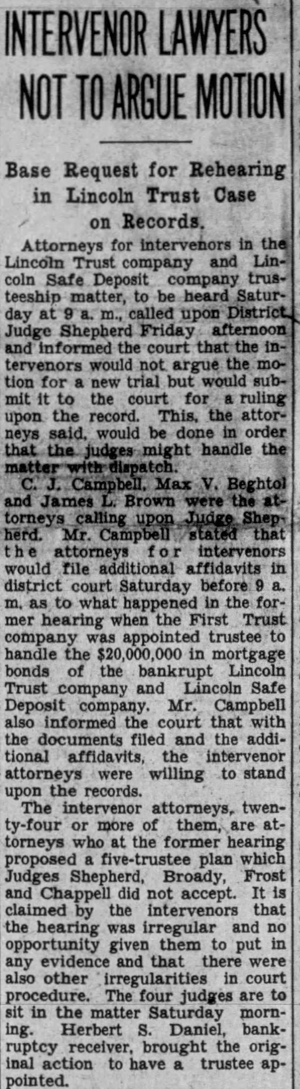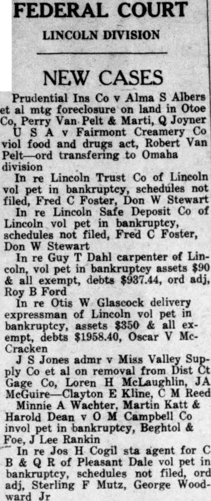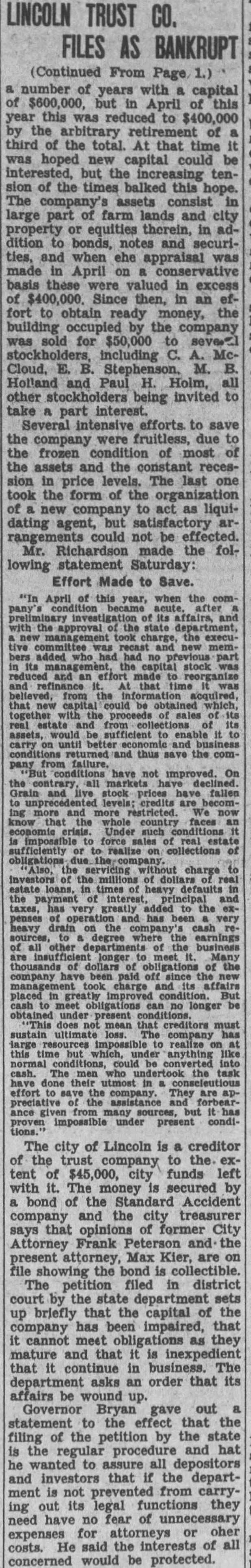 LINCOLN TRUST CO. FILES AS BANKRUPT (Continued From Page 1.) number of years with capital of $600,000, but April of was reduced to $400,000 by the arbitrary of third of the total. At that time it was hoped new capital could be but the increasing tenof the times balked this hope. The assets consist large part of farm lands and city or equities in addition to bonds, notes and securities, and when ehe appraisal was made in April on conservative basis these were valued in excess of $400,000. Since then, in an effort to obtain ready money, the by the company was sold for $50,000 to seve%! including C. McCloud, B. M. Holland and Paul H. Holm, all other stockholders being invited to take part interest efforts to save the company were fruitless, due the frozen of most of the and the sion in price levels. The last one took the form of the of to act as liquidating agent, but arcould not be effected. Mr. Richardson made the following statement Effort Made to Save. "In April this year, when the with the approval the the tive was and new added had stock made the the sales from and the have not improved. On have credits and faces the of of added the has degree where earnings longer of the have took charge and its no not creditors mean but under anything who the task save company. They the assistance but The city of Lincoln is a creditor of the the extent of $45,000, city funds left with The money is secured by bond of the Standard Accident company and the treasurer says that opinions of City Attorney Frank Peterson and the present attorney, Max Kier, are on file showing the bond is The petition filed in district court by the state department sets up briefly that the capital the has impaired, that it cannot meet obligations as mature and that it is inexpedient that it continue in business. The asks an order that its affairs be wound up. Bryan gave out statement to the effect that the filing of the petition the state is the procedure and hat he wanted to assure all depositors and investors that if the department not from carry ing out its legal functions they need have no fear of for attorneys or oher costs. He said the of all would be protected.