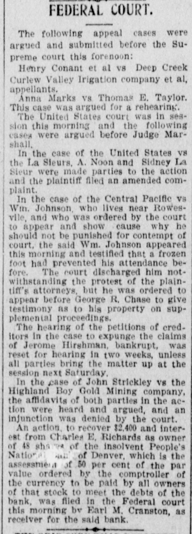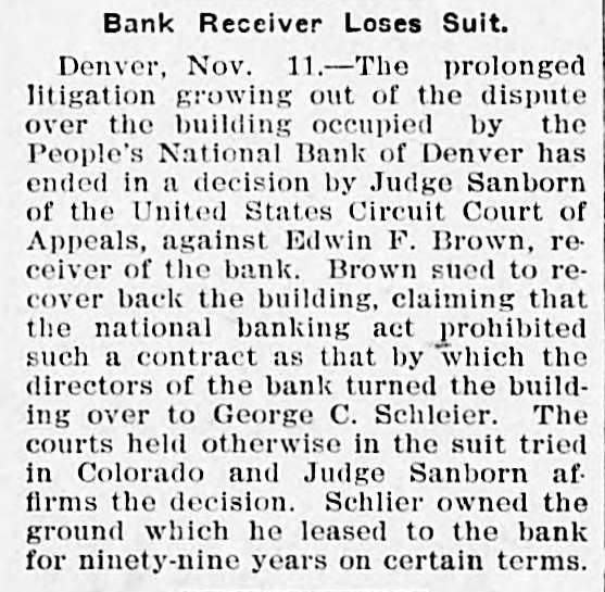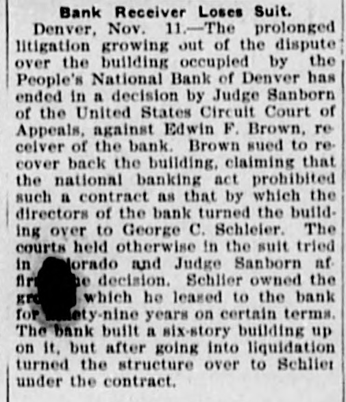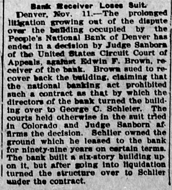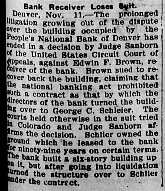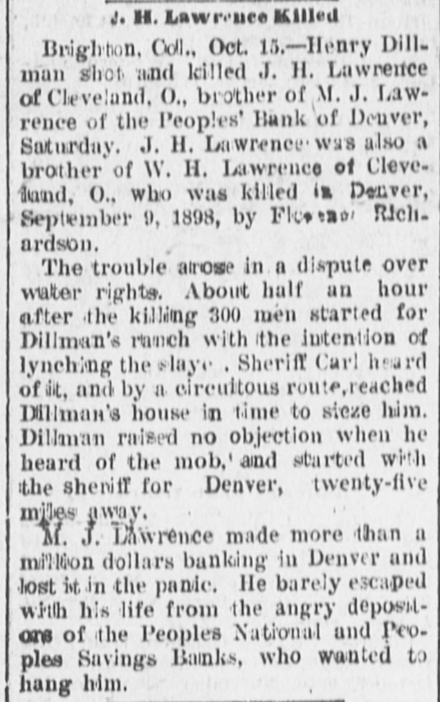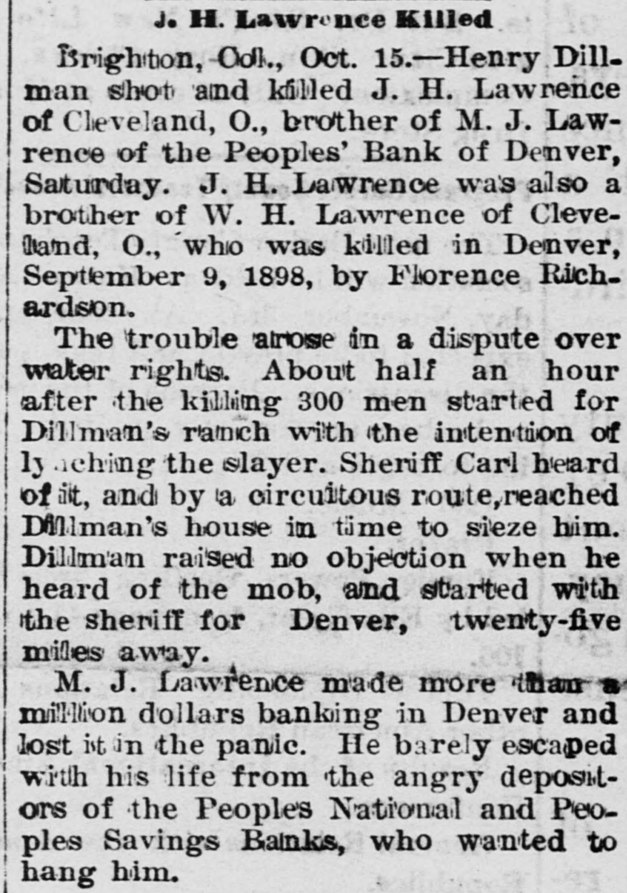 :- H. Lawrence Killed Brightion, Coll., Oct. 15.-Henry Dillman shot and killed J. H. Lawrence of Cleveland, O., brother of M. J. Lawrence of the Peoples' Bank of Denver, Saturday. J. H. Lawrence was also a brother of W. H. Lawrence of Cleveland, O., who was killed im Denver, September 9, 1898, by Flowers: Richardson. The trouble airosse in a dispute over water rights. About half an hour after the killing 300 mén started for Dillman's ramch with the intention of lynching the slaye Sheriff Carl heard of iit, and by a circuitous route, reached Diliman's house in time to sieze him. Dillaman raised no objection when he heard of the mob,¹ and started with the sheriff for Denver, twenty-five miles away. M. J. Lawrence made more than a million dollars banking in Denver and lost ist in the panic. He barely escaped with his life from the angry depositone of the Peoples National and Peoples Savings Banks, who wanted to hang him.