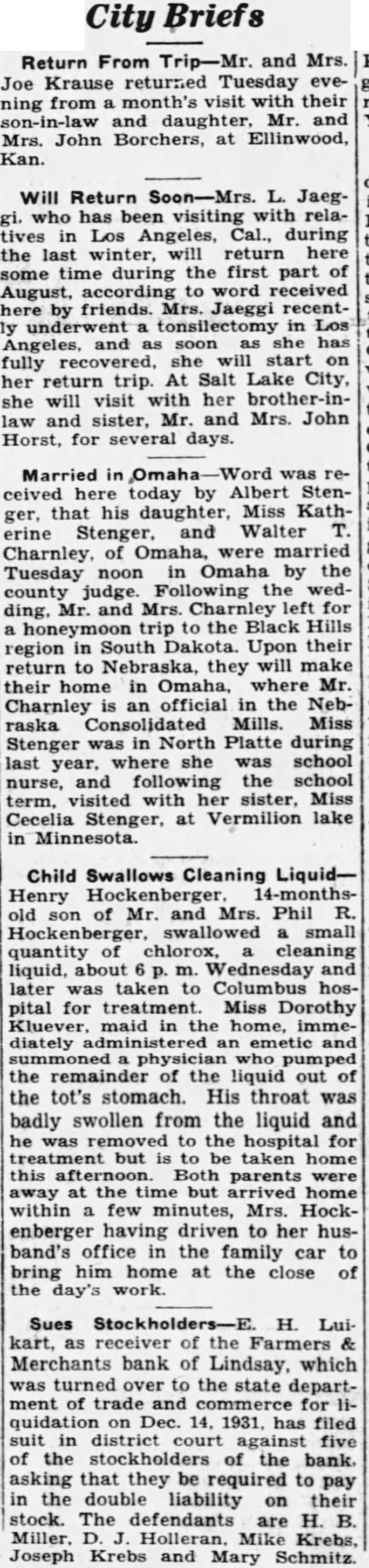 Child Swallows Cleaning LiquidHenry of Mr. and Mrs. Phil R. swallowed small quantity cleaning liquid, about Wednesday and later taken to Columbus hospital for treatment Miss Dorothy Kluever, maid in the home, diately the remainder of the liquid the tot's stomach. His throat was badly swollen from the liquid and he was to the hospital for treatment but taken home this Both parents away the but arrived home within few minutes, Mrs. enberger having driven to her husband's office the family car to bring him home at the close of the day's work.
