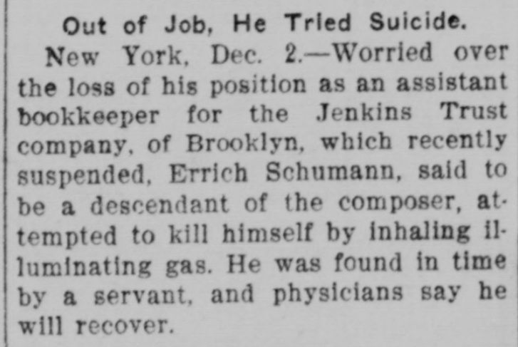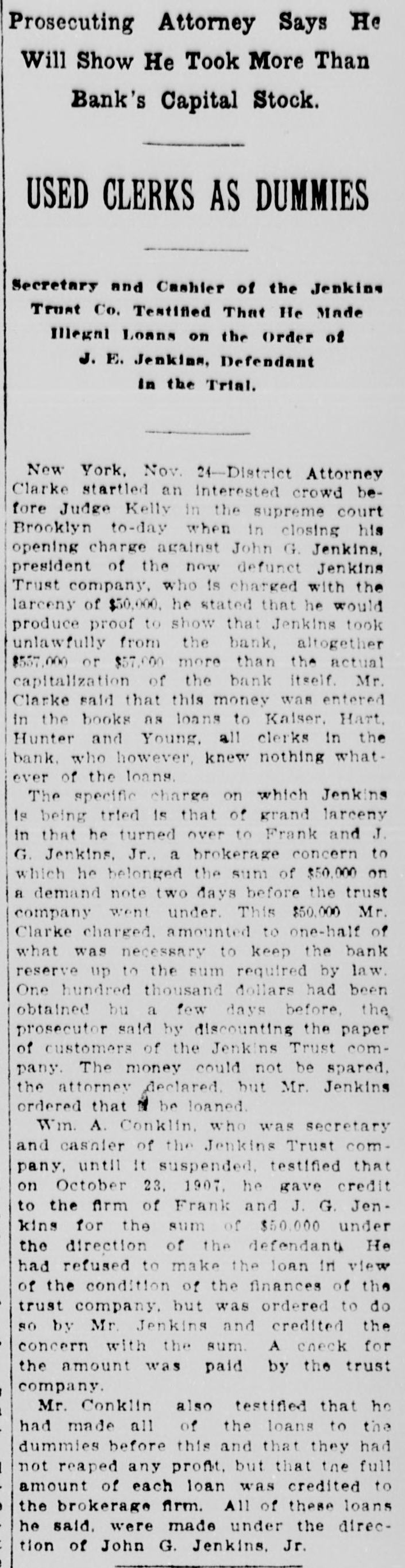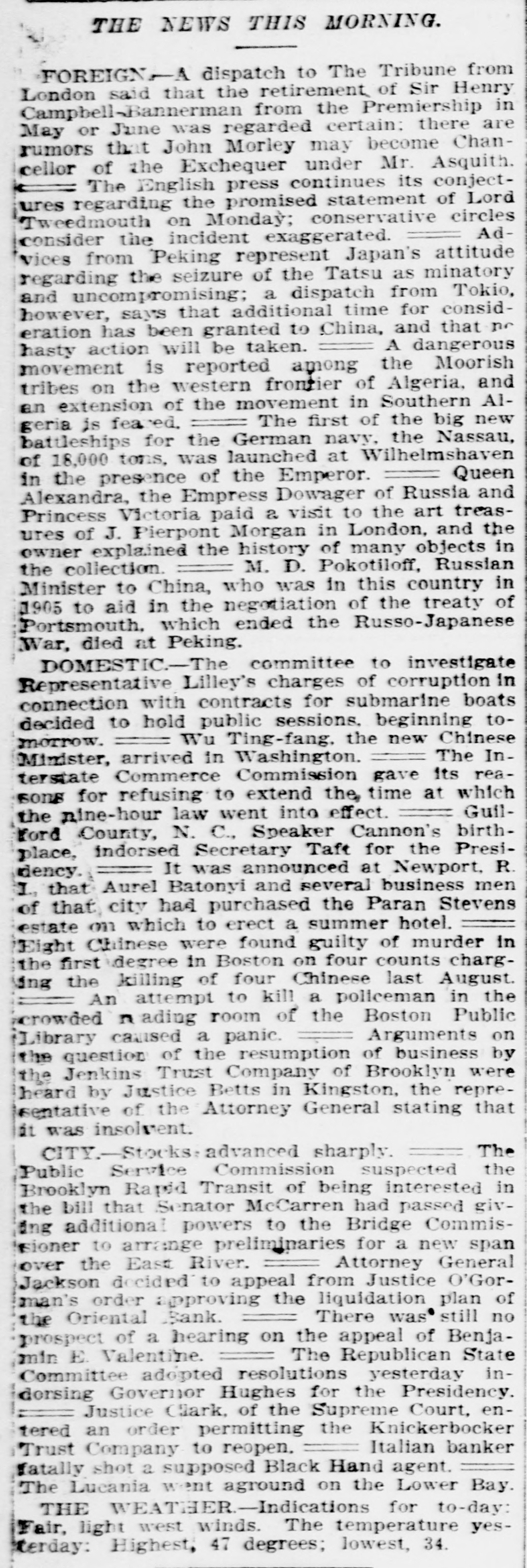 News of the Day. Nearly 1,000 women of Mobile, A's, have petitioned the Lugislature against the enactment of a prohibition bill. Mexico has ceded Magdalena Bay, Lower California, to be used for a coaling station by the United States navy. J. E. Sherman, broker on the Consolidate Exchange, New York, today announced his suspension on that exchange. Four severe earthquake shocks were felt in Manila and surrounding provinces Saturday night and yesterday morn. ing. There was no damage. About four thousand men were laid off at the plant of the Lackawanna Steel Company at West Seneca, N. Y., Saturday. A small run on a Buffalo bank followed. In official circles in Berlin it is believed the visit of Emperor William to King Edward will result in the termination of the 10-year estrangement between Germany and Great Britain. Governor Warfield has appointed Mr. Glenn H. Worthington, of Frederick county, as chief judge of the Sixth judicial circuit of Maryland to succeed the late Chief Justice McSherry. Twenty men participated last night in a fight in front of the Mariett, an Italian theatre in Union street, Brooklyn, in which one man was killed, another fatally wounded and probably a half dozen less seriously hurt. Count Giolio Senni, of Italy, and Miss Mary Gayley, formerly of -Maryland, who met when the Count saved Miss Gayley's life in a runaway accident, were married in New York Saturday, the Count having pressed his suit four years. President Roosevelt has written a letter to Gov. Swanson inviting hin to attend a conference to be held in Washington May 13-15 of next year, to discuss measures for conserving the natural resources of the country and to preserve some of the sources of revenue and profit for the coming generations. General discussion in Wall street today followed the announcement from Washington of the government plans to releave the financial situation. Fome doubt was expressed of the success of the three per cent. treasury certificates though the strengthening tendency of the announcement was powerful in the early market operations. Cardinal Gibbons, as chancellor of the Catholic University of America, has issued a circular letter relative to the income of the institution. He expresses satisfaction with the result of last year's collection, which amounted to $100,000, but points out that, in order for the university to become what its name implies, at least $2,000,000 will be required. Justice Betts, of the New York Supreme Court, has appointed receivers for the Hamilton Bank and the International Trust Company, of Manhattan, and the Jenkins Trust Company, the Williams burg Trust Company, the Brooklyn Bank and the Borough Bank of Brooklyn, all of which were closed by the State Banking Department in the recent financial flurry. For the first time in the legal history of Georgia the writ of injunction has been used to prevent & wedding, Judge Whipple, of the Superior Court of Fitzgerald, Ga., having temporarily enjoined A. L. Reeves, a prominent young business man, from marrying Miss Tinna White, daughter of a wealthy merchant. White objects to his daughter's marriage on account of her age, sbe being only sixteen yearsold. Henry L. Saur, 8 Southern Railway employe, twenty-three years old, of Washington, was found dead in his room yesterday morning. Gas was escaping from an open jet just above his bed. Deputy Coroner Glazebrook, after an investigation, issued a certificate of death from accidental asphyxiation. Mr. Saur spent Saturday evening with his fiancee, Miss Annie whom he was to have married on Thanksgiving.