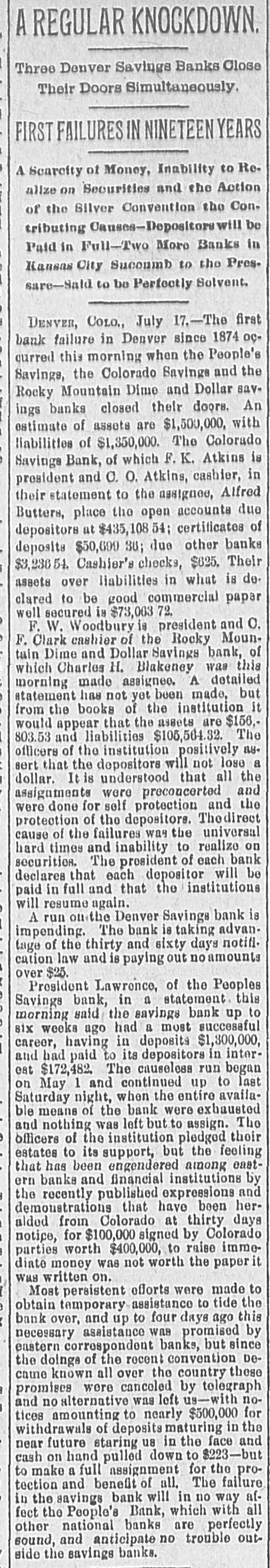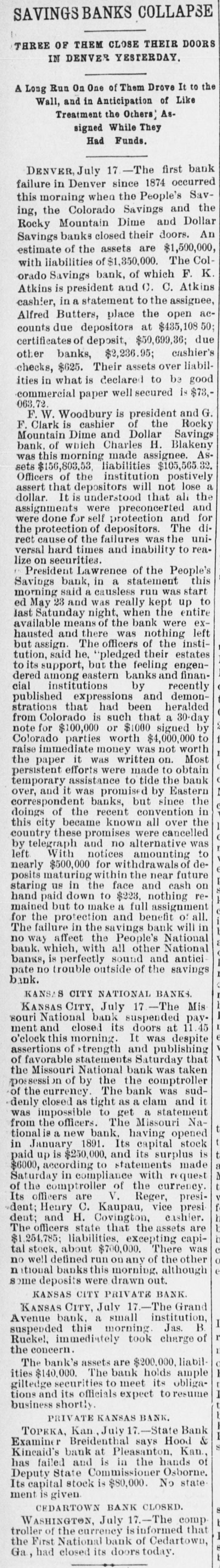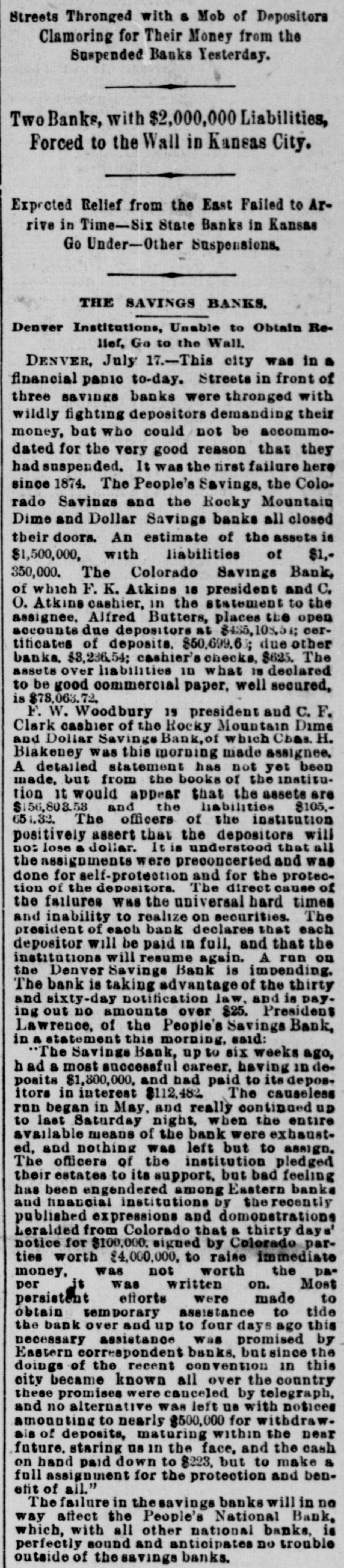 Streets Thronged with a Mob of Depositors Clamoring for Their Money from the Suspended Banks Yesterday. Two Banks, with $2,000,000 Liabilities, Forced to the Wall in Kansas City. Expected Relief from the East Failed to Arrive in Time-Six State Banks in Kansas Go Under-Other Suspensions. THE SAVINGS BANKS. Denver Institutions, Unable to Obtain Relief, Go to the Wall. DENVER, July 17.-This city was in a financial panic to-day. Streets in front of three savings banks were thronged with wildly fighting depositors demanding their money, but who could not be accommodated for the very good reason that they had suspended. It was the first failure here since 1874. The People's Savings, the Colo. rado Savings and the Rocky Mountain Dime and Dollar Savings banks all closed their doors. An estimate of the assets is $1,500,000, with liabilities of $1,350,000. The Colorado Savings Bank, of which F. K. Atkins 16 president and C. O. Atkins cashier, in the statement to the assignee. Alfred Butters, places the open accounts due depositors at $435,108.5 certiticates of deposits. $50,699.6 due other banks. $3,236.54; cashier's checks, $625. The assets over liabilities in what 18 declared to be good commercial paper, well secured, is $78,063.72. F. W. Woodbury 19 president and C. F. Clark cashier of the Rocky Mountain Dime and Dollar Savings Bank, of which Cbas. H. Blakeney was this morning made assignee. A detailed statement has not yet been made, but from the books of the institution it would appear that the assets are $156,803.58 and the liabilities $105,65.13 The officers of the institution positively assert that the depositors will no: lose a dollar. It is understood that all assignments were preconcerted and was done for self-protection and for the protection of the depositors. The direct cause of the failures WHS the universal hard times and inability to realize on securities. The president of each bank declares that each depositor will be paid ID full, and that the institutions will resume again. A run on the Denver Savings Bank is impending. The bank is taking advantage of the thirty and sixty-day notification law, and is Day. ing out no amounts over $25. President Lawrence, of the People's Savings Bank, in a statement this morning, said: The Savings Bank, up six weeks ago, had a most successful career. having in deposits $1,800,000. and had paid to its depositors in interest $112,482 The causeless run began in May, and really continued up to last Saturday night, when the entire available means of the bank were exhausted, and nothing was left but to assign. The officers of the institution pledged their estates to its support. but bad feeling has been engendered among Eastern banks and financial institutions by the recently published expressions and domonstrations Leralded from Colorado that a thirty days' notice for $100,000. signed by Colorado parties worth $4,000,000, to raise immediate money, was not worth the D& per it was written on. Most persistent efforts were made to obtain temporary assistance to tide the bank over and up to four days ago this necessary assistance was promised by Eastern correspondent banks. butsince the doings of the recent convention in this city became known all over the country these promises were cauceled by telegraph, and no alternative was left us with notices amounting to nearly $500,000 for withdrawais of deposits, maturing within the near future. staring us in the face, and the cash on hand paid down to $223, but to make & full assignment for the protection and ben. efit of all." The failure in the savings banks will in no way affect the People's National Bank, which, with all other national banks, is perfectly sound and anticipates no trouble outside of the savings banks.