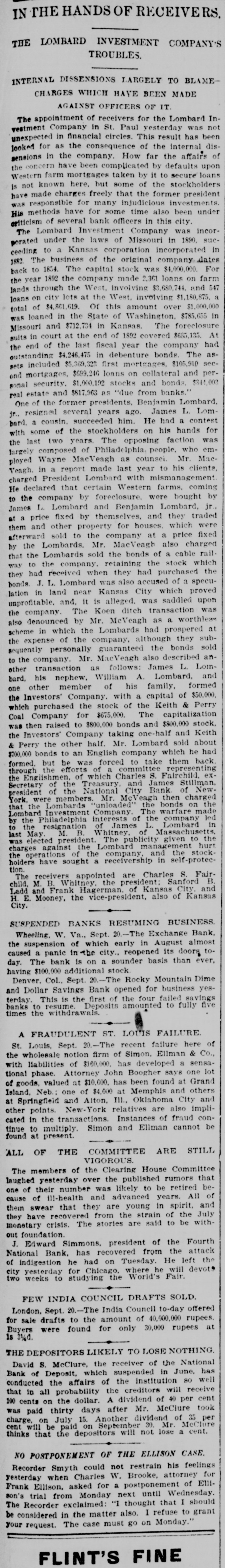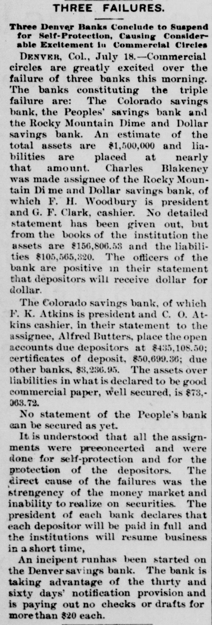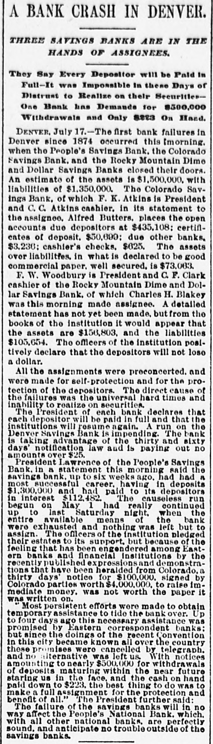 Streets Thronged with a Mob of Depositors Clamoring for Their Money from the Suspended Banks Yesterday. Two Banks, with $2,000,000 Liabilities, Forced to the Wall in Kansas City. Expected Relief from the East Failed to Arrive in Time-Six State Banks in Kansas Go Under-Other Suspensions. THE SAVINGS BANKS. Denver Institutions, Unable to Obtain Relief, Go to the Wall. DENVER, July 17.-This city was in a financial panic to-day. Streets in front of three savings banks were thronged with wildly fighting depositors demanding their money, but who could not be accommodated for the very good reason that they had suspended. It was the first failure here since 1874. The People's Savings, the Colo. rado Savings and the Rocky Mountain Dime and Dollar Savings banks all closed their doors. An estimate of the assets is $1,500,000, with liabilities of $1,350,000. The Colorado Savings Bank, of which F. K. Atkins 16 president and C. O. Atkins cashier, in the statement to the assignee. Alfred Butters, places the open accounts due depositors at $435,108.5 certiticates of deposits. $50,699.6 due other banks. $3,236.54; cashier's checks, $625. The assets over liabilities in what 18 declared to be good commercial paper, well secured, is $78,063.72. F. W. Woodbury 19 president and C. F. Clark cashier of the Rocky Mountain Dime and Dollar Savings Bank, of which Cbas. H. Blakeney was this morning made assignee. A detailed statement has not yet been made, but from the books of the institution it would appear that the assets are $156,803.58 and the liabilities $105,65.13 The officers of the institution positively assert that the depositors will no: lose a dollar. It is understood that all assignments were preconcerted and was done for self-protection and for the protection of the depositors. The direct cause of the failures WHS the universal hard times and inability to realize on securities. The president of each bank declares that each depositor will be paid ID full, and that the institutions will resume again. A run on the Denver Savings Bank is impending. The bank is taking advantage of the thirty and sixty-day notification law, and is Day. ing out no amounts over $25. President Lawrence, of the People's Savings Bank, in a statement this morning, said: The Savings Bank, up six weeks ago, had a most successful career. having in deposits $1,800,000. and had paid to its depositors in interest $112,482 The causeless run began in May, and really continued up to last Saturday night, when the entire available means of the bank were exhausted, and nothing was left but to assign. The officers of the institution pledged their estates to its support. but bad feeling has been engendered among Eastern banks and financial institutions by the recently published expressions and domonstrations Leralded from Colorado that a thirty days' notice for $100,000. signed by Colorado parties worth $4,000,000, to raise immediate money, was not worth the D& per it was written on. Most persistent efforts were made to obtain temporary assistance to tide the bank over and up to four days ago this necessary assistance was promised by Eastern correspondent banks. butsince the doings of the recent convention in this city became known all over the country these promises were cauceled by telegraph, and no alternative was left us with notices amounting to nearly $500,000 for withdrawais of deposits, maturing within the near future. staring us in the face, and the cash on hand paid down to $223, but to make & full assignment for the protection and ben. efit of all." The failure in the savings banks will in no way affect the People's National Bank, which, with all other national banks, is perfectly sound and anticipates no trouble outside of the savings banks.