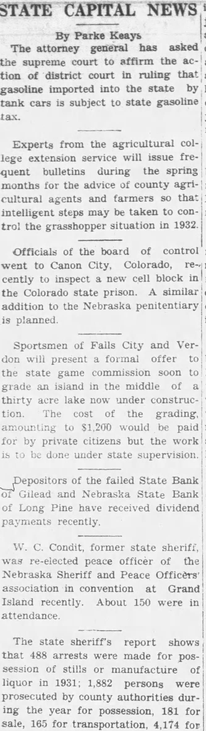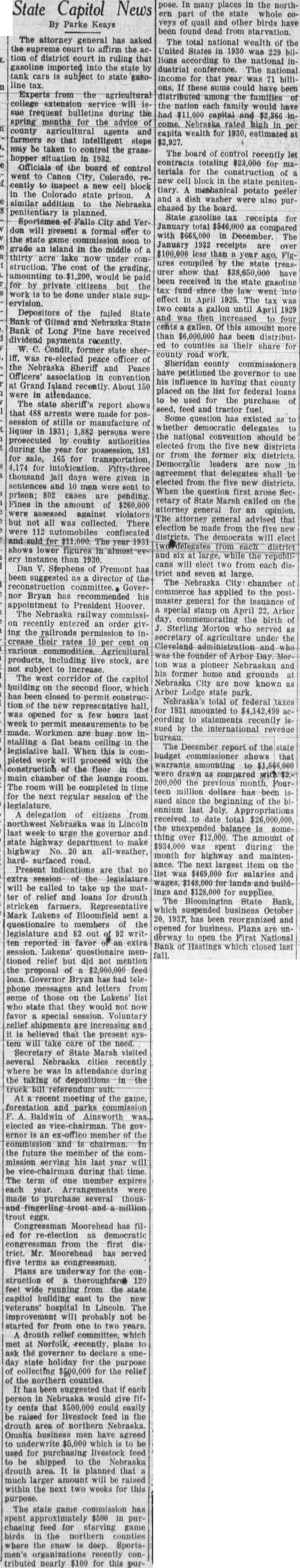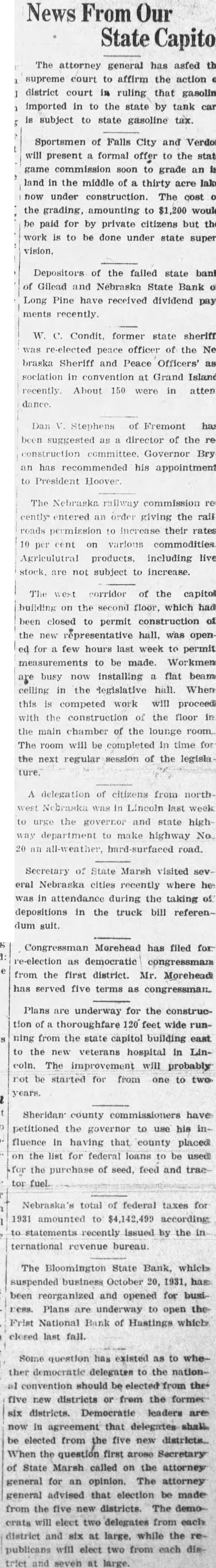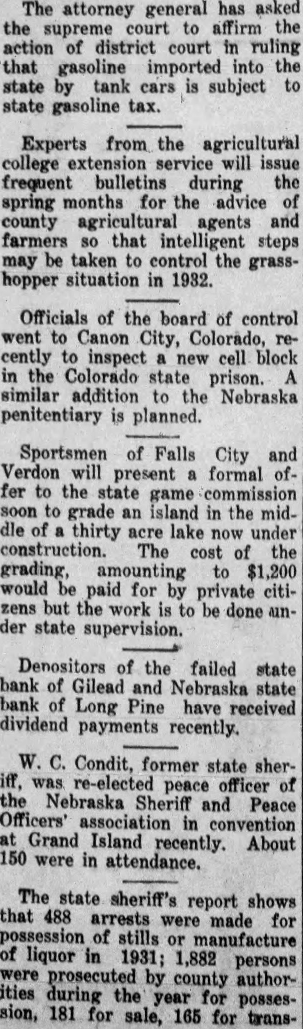 COURT HOUSE ACTIVITIES petition was filed in the District Court last week, asking for the appointment of H. Luikart as receiver of the Bank of Lynch. The petition was sent by Attorney General Sorensen. Hill, former county survey. of Boyd county, was visiting about the court house Wednesday. He is here from Indiana Harbor, Ind., for short visit. William H. Robinson, receiver of the First Bank of Naper, has filed an action in foreclosure, asking for judgment mortgage of $460, given by Robert A. Sotltenberg and wife, covering lots thirteen and fourteen in block twenNaper Jakob Zimbleman filed foreclosure proceedings last Friday against Sarah Thornburg and others, asking for the payment of mortgage of $1000, which covers lots nine, ten, eleven and twelve in block six, west addition to Butte. Frank Gustin is the plaintiff in suit filed in the District against Stasia Taylor, in which he seeks to collect $4000 and interest claimed due on two notes given by une defendant. The southeast quarter of the southwest quarter and the southwest quarter of the southeast quarter of section 2, and the northeast quarter of section 11, 33, 12, was attached. H. Luikart, receiver of the Nebraska State Bank of Long Pine, has filed an action in the County Court asking for judgment of $321.33 and interest against Harlan Reber. The amount is claimed due on note given by the defendant. The matter will come up for hearing Septemon ber 7th. Charles Putnam has filed petition in probate court, asking for the probate of his brother, Wayne Putnam, deceased, and also asks that the Court appoint his father, Putnam as administrator. Hearing has been set for August 22, at o'clock. Four judgments were entered in County Court during the past week by Judge Adamson. They were in the following cases, and in each instance the judgment was entered as against the defendant: Sell vs. Farmers Poultry Co., Louis Tanner Farmers Poultry Co., $86.66; William H. Robinson, Receiver of the First National Bank of Naper, vs. Ivan Hanson, $79.87; N. Sieler vs. George W. Dawson $199.93. In the semi-annual division of the state appropriation money received from the state, only two school districts in Boyd county failed participate in the cut. These two districts did not hold the required number months of school during the past year. Part of the fund is divided equally among the different distriets, which gives the small school an advantage, and the balance is divided according the number of pupils, giving an advantage to the schools with the larger enrollment. Deputy Treasurer Lyman Wills this short tion trip to Illinois. Forrest Lear, special master, was here Tuesday from Norfolk, to conduct sale of land which had been foreclosed in the District Court of the United States in the District of Nebraska, Norfolk division. The land was the west half of section 51, 34, 14, and was foreclosed in the case of the Aetna Life Insurance Co. vs. Robert C. Hawkins and others. The plaintiff was the purchaser, bidding $14,000. The Citizens National Bank of Norfolk was the final owner of the land. CHURCH NOTES Services for Sunday: 10 Sunday School. 11 m., Morning Worship. m., Sunday School, followed preaching service at 3'o'clock at the Twin Buttes church. Evening Worship at CONGREGATIONAL CHURCH Sunday, August 10 Sunday Bible School. la. Mornnig Worship. 2:30 Children's Church School. 7:15 Christian Endeavor. Christian Fellowship Hour. Howell, Pastor.