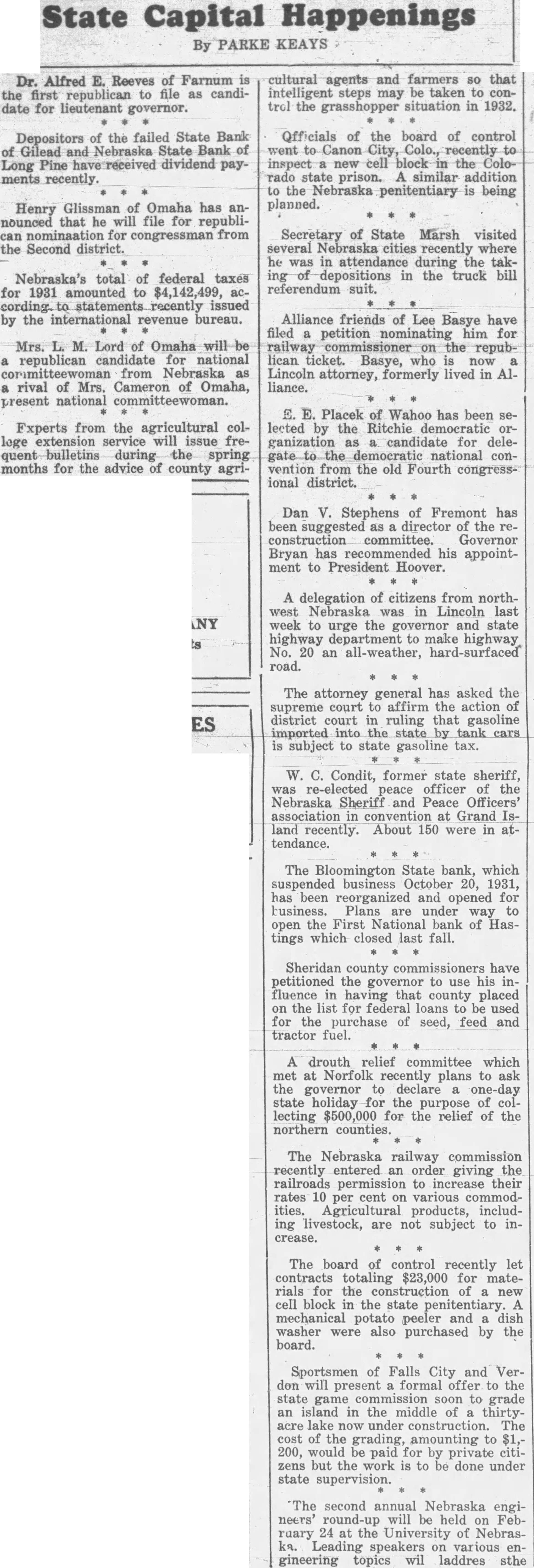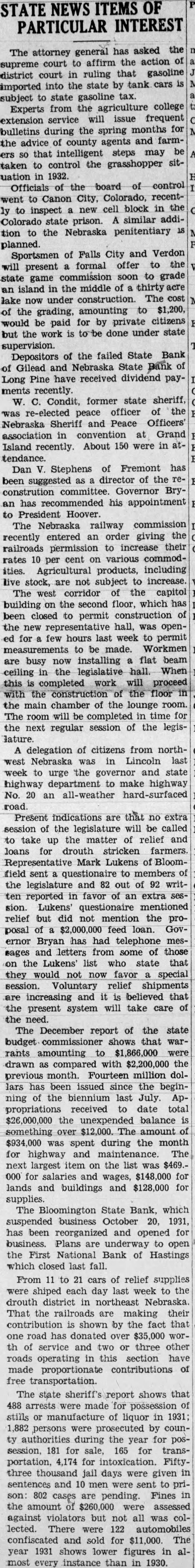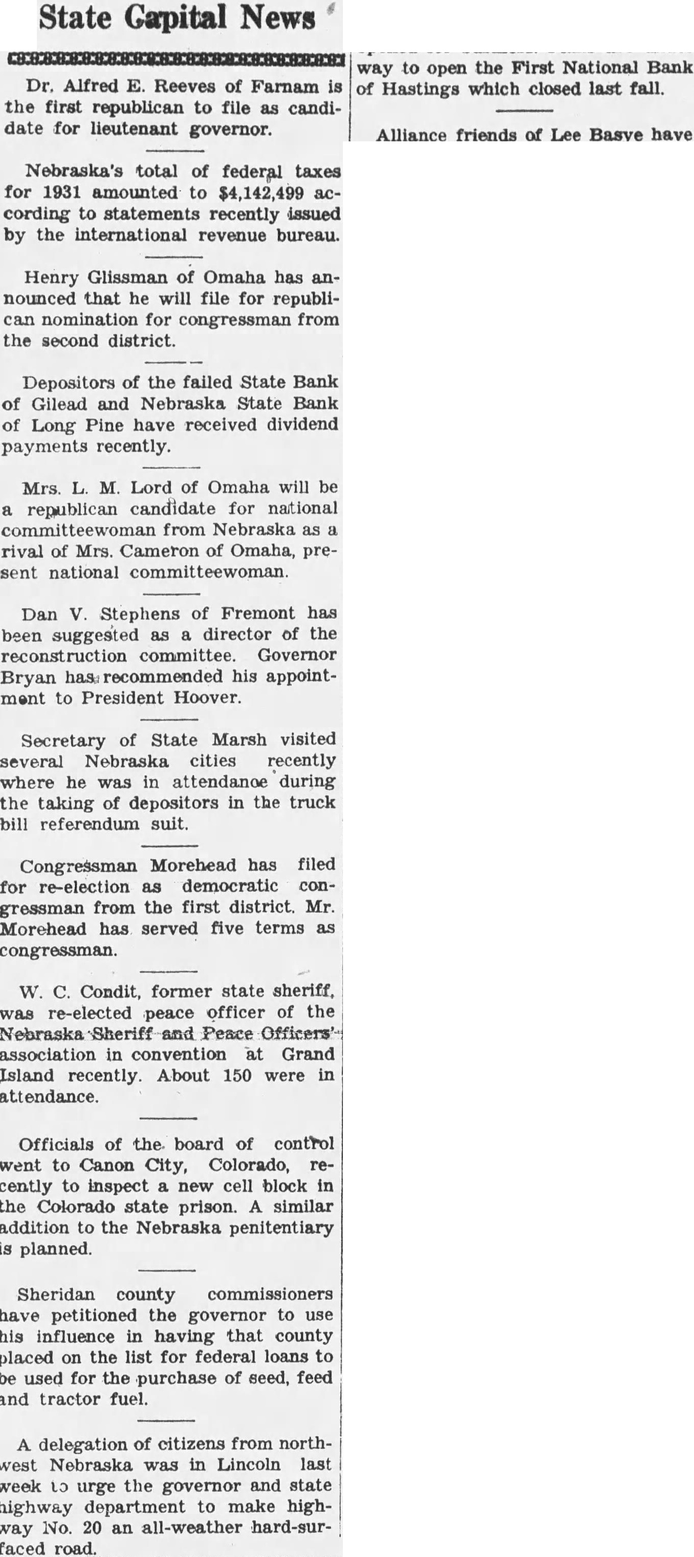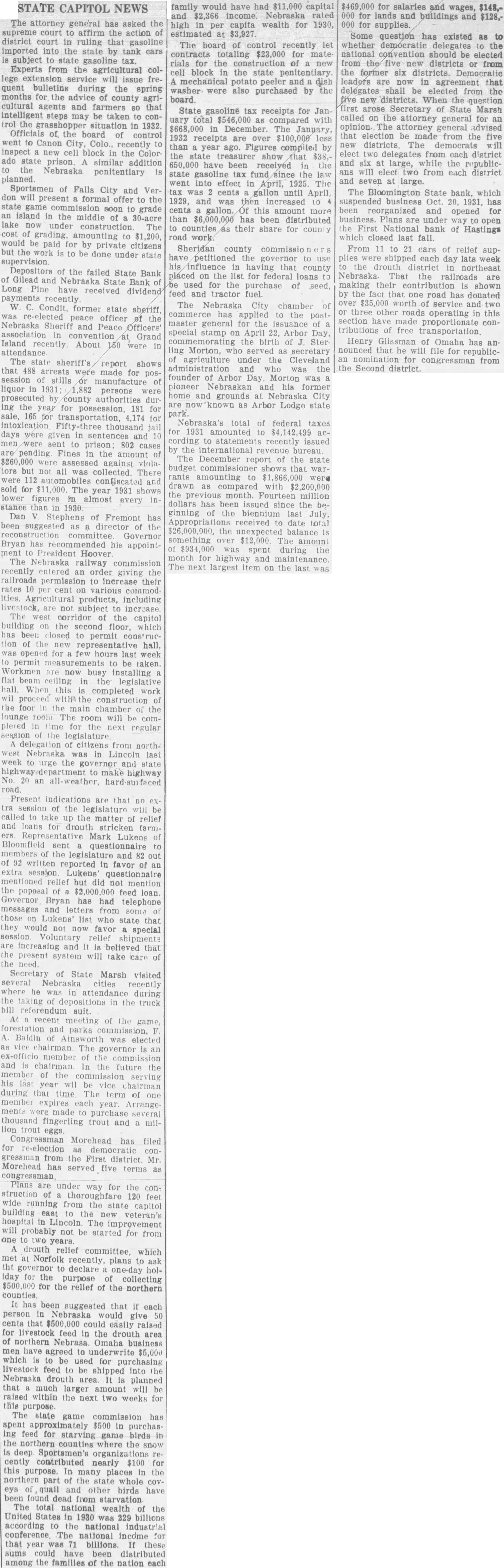 COURT HOUSE ACTIVITIES petition was filed in the District Court last week, asking for the appointment of H. Luikart as receiver of the Bank of Lynch. The petition was sent by Attorney General Sorensen. Hill, former county survey. of Boyd county, was visiting about the court house Wednesday. He is here from Indiana Harbor, Ind., for short visit. William H. Robinson, receiver of the First Bank of Naper, has filed an action in foreclosure, asking for judgment mortgage of $460, given by Robert A. Sotltenberg and wife, covering lots thirteen and fourteen in block twenNaper Jakob Zimbleman filed foreclosure proceedings last Friday against Sarah Thornburg and others, asking for the payment of mortgage of $1000, which covers lots nine, ten, eleven and twelve in block six, west addition to Butte. Frank Gustin is the plaintiff in suit filed in the District against Stasia Taylor, in which he seeks to collect $4000 and interest claimed due on two notes given by une defendant. The southeast quarter of the southwest quarter and the southwest quarter of the southeast quarter of section 2, and the northeast quarter of section 11, 33, 12, was attached. H. Luikart, receiver of the Nebraska State Bank of Long Pine, has filed an action in the County Court asking for judgment of $321.33 and interest against Harlan Reber. The amount is claimed due on note given by the defendant. The matter will come up for hearing Septemon ber 7th. Charles Putnam has filed petition in probate court, asking for the probate of his brother, Wayne Putnam, deceased, and also asks that the Court appoint his father, Putnam as administrator. Hearing has been set for August 22, at o'clock. Four judgments were entered in County Court during the past week by Judge Adamson. They were in the following cases, and in each instance the judgment was entered as against the defendant: Sell vs. Farmers Poultry Co., Louis Tanner Farmers Poultry Co., $86.66; William H. Robinson, Receiver of the First National Bank of Naper, vs. Ivan Hanson, $79.87; N. Sieler vs. George W. Dawson $199.93. In the semi-annual division of the state appropriation money received from the state, only two school districts in Boyd county failed participate in the cut. These two districts did not hold the required number months of school during the past year. Part of the fund is divided equally among the different distriets, which gives the small school an advantage, and the balance is divided according the number of pupils, giving an advantage to the schools with the larger enrollment. Deputy Treasurer Lyman Wills this short tion trip to Illinois. Forrest Lear, special master, was here Tuesday from Norfolk, to conduct sale of land which had been foreclosed in the District Court of the United States in the District of Nebraska, Norfolk division. The land was the west half of section 51, 34, 14, and was foreclosed in the case of the Aetna Life Insurance Co. vs. Robert C. Hawkins and others. The plaintiff was the purchaser, bidding $14,000. The Citizens National Bank of Norfolk was the final owner of the land. CHURCH NOTES Services for Sunday: 10 Sunday School. 11 m., Morning Worship. m., Sunday School, followed preaching service at 3'o'clock at the Twin Buttes church. Evening Worship at CONGREGATIONAL CHURCH Sunday, August 10 Sunday Bible School. la. Mornnig Worship. 2:30 Children's Church School. 7:15 Christian Endeavor. Christian Fellowship Hour. Howell, Pastor.