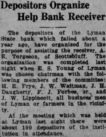 Depositors Organize Help Bank Receiver The depositors of the Lyman State bank which failed about year ago, have organized for the purpose of assisting the receiver, Torgeson, of The organization was completed last night when E. S. Young of Lyman was chosen chairman with the following members of the committee: Frye, W. Waitman, H. Daugherty, Forbes, and Lippincott, all business of Lyman or farmers in the vicinity. At the meeting which was held at Lyman last night there were about 100 depositors of the institution in attendance.