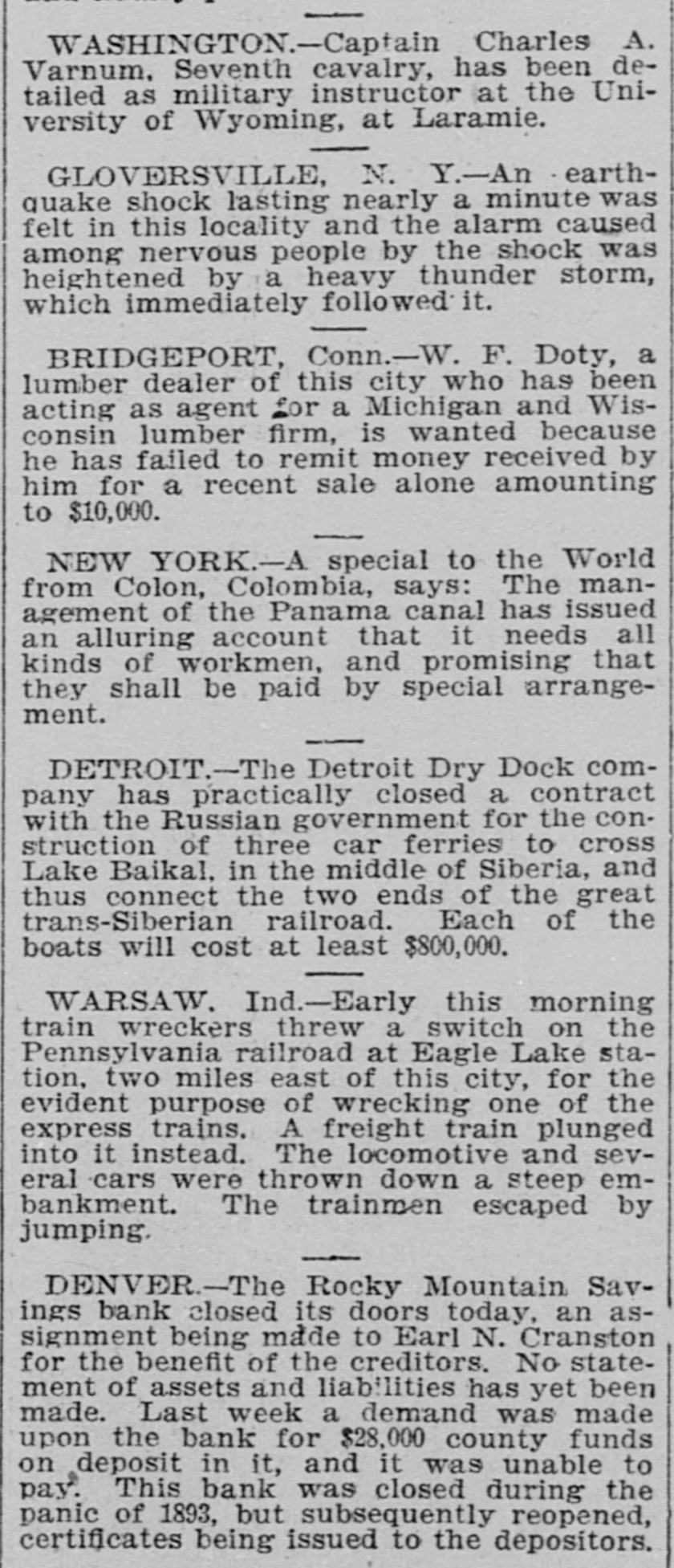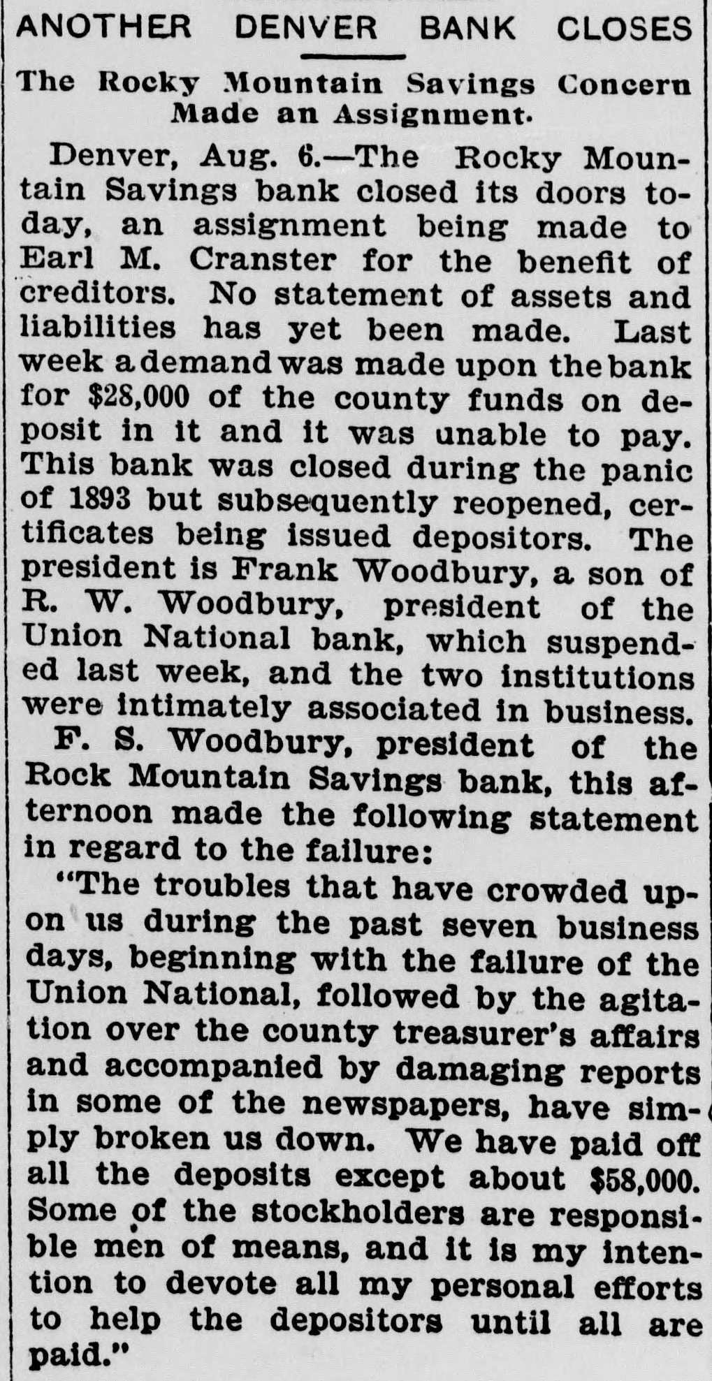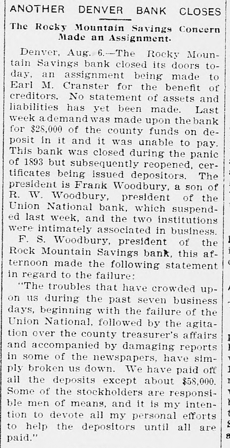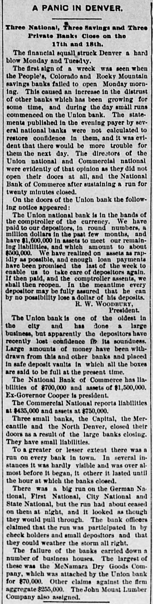 PANIC IN DENVER. Three National, Three Savings and Three Private Banks Close on the 17th and 18th. The financial squall struck Denver a hard blow Monday and Tuesday. The first sign of a wreck was seen when the People's, Colorado and Rocky Mountain savings banks failed to open Monday mornIng. This caused an increase in the distrust of other banks which has been growing for some time, and during the day small runs commenced on the Union bank. The statemente published in the evening payer by several national banks were not calculated to restore confidence in them, and it was evident that there would be more trouble for them the next day. The directors of the Union national and Commercial nati onal were evidently of that opinion as they did not open their doors at all, and the National Bank of Commerce after sustaining a run for twenty minutes closed. On the doors of the Union bank the following notice appeared The Union national bank is In the hands of the comptroller of the currency. We have paid to our depositors, in round numbers, a million dollars in the past few months, and have $1,600,000 in assets to meet our remaining liabilities, and which amount to about $500,000. We have realized on assets as rapidly as possible, and enough loan payments have been promised the last of the week to enable us to take care of depositors again. If then paid. and the comptroller assents, we shall then reopen. In the meantime every depositor may be fully assured that be can by no possibility lose a dollar of his deposits. R. W. WOODBURY, President. The Union bank is one of the oldest in the city and has done a large business, but apparently the depositors have recently lost confidence in its soundness. Large amounts of money have been withdrawn from this and other banks and placed in safe deposit vaults in which all the boxes are said to be full at the present time. The National Bank of Commerce has liabilities of $700,000 and assets of $1,500,000. Ex-Governor Cooper is president. The Commercial National reports liabilities at $435,000 and assets at $750,000. Three small banks. the Capital, the Mercantile and the North Denver, closed their doors as a result of the large banks closing. They have small liabilities. To a greater or lesser extent there was a run on every bank in town. In several instances it was hardly visible and was over almost before it began. it otherr it lasted until the hour at which the banks closed. There was a big run on the German National. First National, City National and State National, but the run had about ceased on them at night, and it looked as though they would pull through. The bank officers claimed that the run was participated in by check holders and small depositors and that they could weather the storm all right. The failure of the banks carried down a number of business houses. The largest of these was the McNamara Dry Goods Company, which was attached by the Union bank for $70,000. Other claims against the firm aggregate $255,000. The John Mouat Lumber Company also assigned