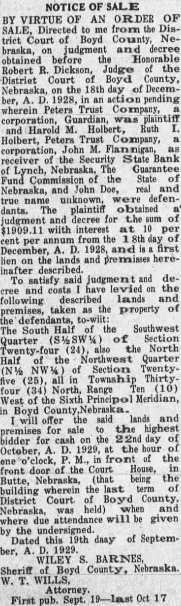 NOTICE OF SALE BY VIRTUE OF AN ORDER OF SALE, Directed to me from the District Court of Boyd County, Nebraska, on judgment and decree obtained before the Honorable Robert R. Dickson, Judge of the District Court of Boyd County, Nebraska, on the 18th day of December, A. D. 1928, in an action pending wherein Peters Trust Company, a corporation, Guardian, was plaintiff and Harold M. Holbert, Ruth I. Holbert, Peters Trust Company, a corporation, John M. Flannigan, as receiver of the Security State Bank of Lynch, Nebraska, The Guarantee Fund Commission of the State of Nebraska, and John Doe, real and true name unknown, were defendants. The plaintiff obtained judgment and decree for the sum of $1909. wiith interest at 10 per cent per annum from the 8th day of December, A. D. 1928, and is first lien on the lands and premisses hereinafter described. To satisfy said judgment and decree and costs I have levied on the following described lands and premises, taken as the property of the defendants, to-wiit: The South Half of the Southwest Quarter (S%SW%) of Section Twenty-four (24), also the North Half of the Northwest Quarter (N½ NW%) of Section Twentyfive (25), all in Township Thirtyfour (34) North, Range Ten (10) West of the Sixth Principol Meridian, in Boyd County,Nebraska. I will offer the said lands and premises for sale to the highest bidder for cash on the 22nd day of October, A. D. 1929, at the hour of one o'clock, P. M., in front of the front door of the Court House, in Butte, Nebraska, (that being the building wherein the last term of District Court of Boyd County, Nebraska, was held) when and where due attendance will be given by the undersigned. Dated this 19th daay of September, A. D. 1929. WILEY S. BARNES, Sheriff of Boyd County, Nebraska. W. T. WILLS. Attorney. First pub. Sept. 19-last 17