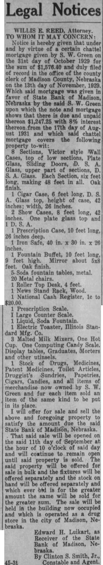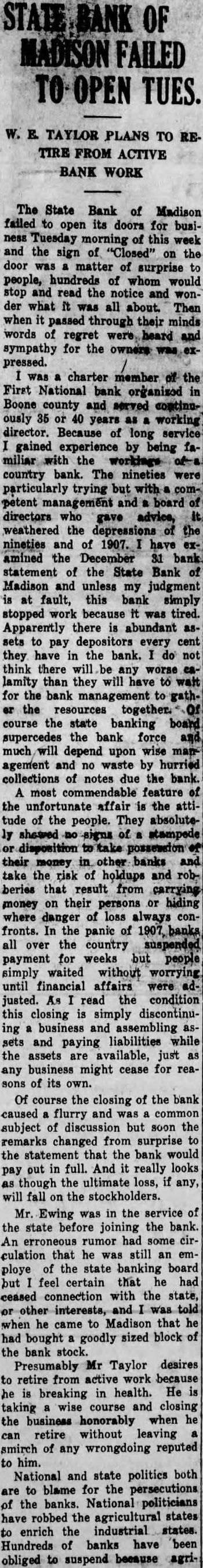 PLANS TO TIRE FROM ACTIVE BANK WORK The State Bank of Madison failed to its doors open for busiTuesday morning of this week and the sign of "Closed" on door was matter of surprise to people, hundreds of whom would stop and read the notice and der what was all about. Then when passed through their minds words of regret sympathy for the owners pressed. charter member the First National bank organized Boone county and served ously or 40 years working director. Because of long service gained experience by being miliar with the workings country bank. The nineties were particularly trying but petent management and board of directors who gave advice, weathered the depressions nineties and of 1907. have amined the December 31 statement of the State Bank Madison and unless my judgment at fault, this bank simply stopped work because was tired. Apparently there is abundant sets to pay depositors every cent they have in the bank. do not think there will be any worse lamity than they will have to wait for the bank management to gaththe resources together. course the state banking board supercedes the bank force and much depend upon wise agement and no waste by hurried collections of notes due the bank. A most commendable feature the unfortunate affair is the attitude of the people. They absoluteshowed signs of stampede disposition to possession their money banks take the risk of holdups and robberies that result from carrying money on their persons or hiding where danger of loss always fronts. In the panic of all over the country suspended payment for weeks but people simply waited without worrying until financial affairs were justed. As read the condition this closing simply discontinuing business and assembling sets and liabilities while paying the assets are available, just as any business might cease for sons of its own. Of course the closing of the bank caused flurry and common subject of discussion but soon the remarks changed from surprise the statement that the bank would out in full. And really looks pay though the ultimate loss, if any, will fall on the stockholders. Mr. Ewing was in the service of the state before joining the bank. erroneous rumor had some circulation that he was still an of the state banking board ploye but feel certain that he had ceased connection with the state, and when he came to Madison that he had bought goodly sized block of the bank stock. Presumably Mr Taylor desires to retire from active work is in health. He breaking wise course and closing taking the business honorably when can retire without leaving smirch of any wrongdoing reputed him. National and state politics both to blame for the persecutions of the banks. National politicians have robbed the agricultural states enrich the industrial states. Hundreds of banks have been obliged to suspend because