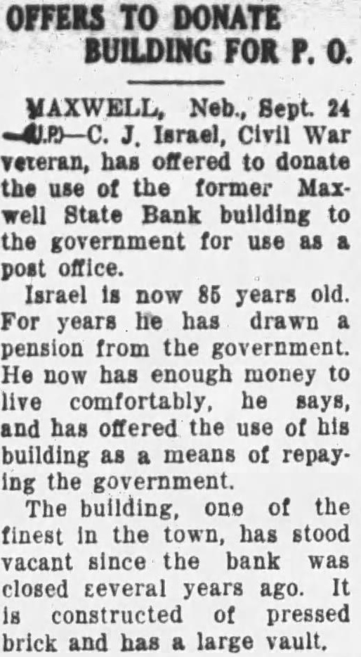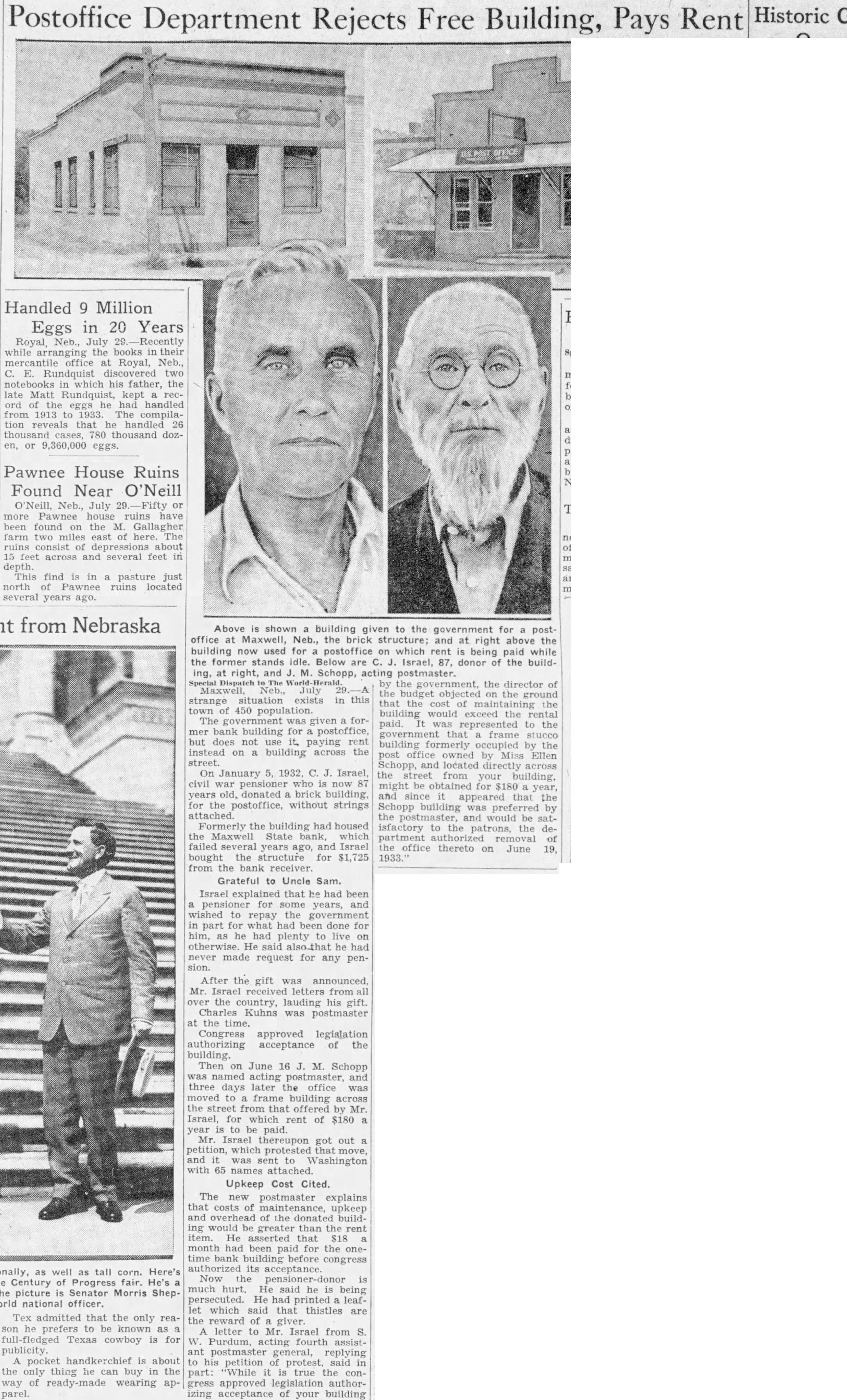 Above shown building given to the government postoffice at Maxwell, Neb., the brick structure; and at right above the building now used for postoffice on which rent being paid while the former stands idle. Below are Israel, 87, donor of the building, at right, and Schopp, acting postmaster. the the director of Maxwell, July objected on the ground strange situation exists in this that the cost the town 450 population. building would exceed the rental The government was given forpaid. was the bank building for postoffice, that frame but does not it. paying rent building by the instead on building across the post office owned by Miss Ellen street. Schopp, and located directly across On January 5. 1932, Israel, the street from your building, civil war pensioner who now 87 might be for $180 year, years old, donated brick building, and since appeared that the for the postoffice, without strings Schopp building was preferred by attached. the and would be Formerly the building had housed isfactory to the patrons, the dethe Maxwell State which partment removal of failed several years ago, and Israel the office thereto June bought the structure for $1,725 from the bank receiver.