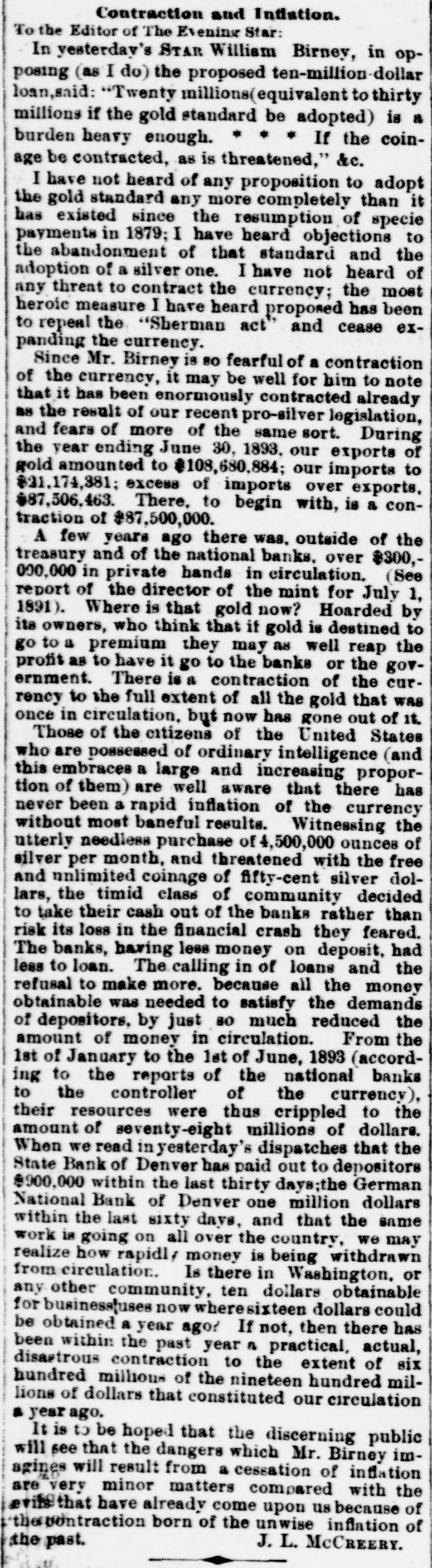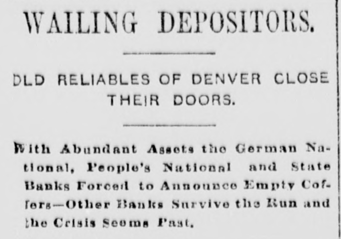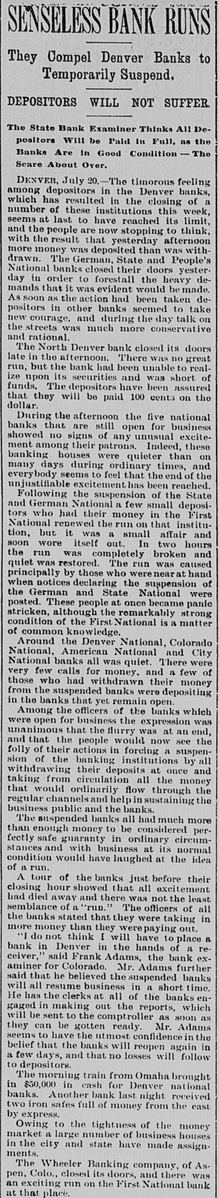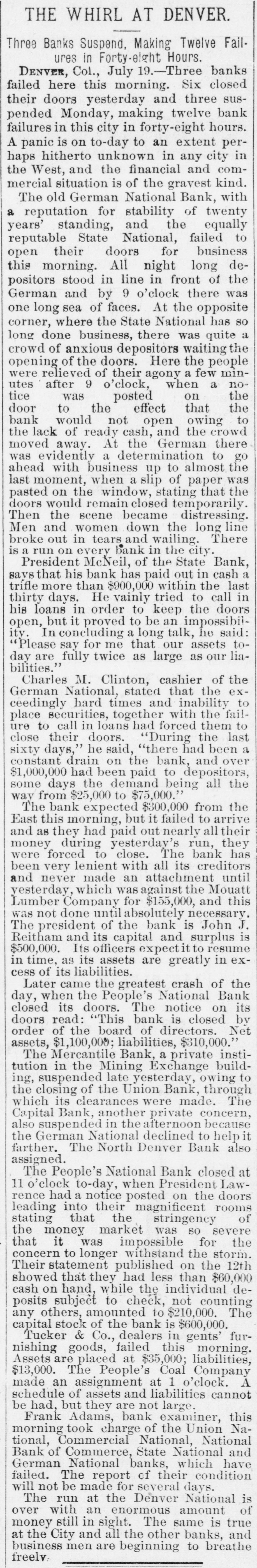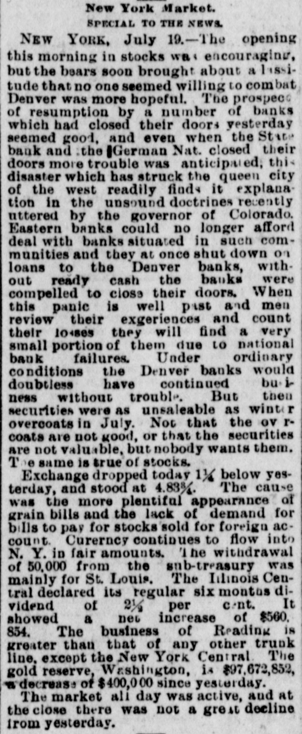 New York Market. SPECIAL TO THE NEWS. NEW YORK, July 19.-The opening this morning in stocks wa encouraginr. but the bears soon brought about a lissitude that no one seemed willing to combat Denver was more hopeful. The prospect of resumption by a number of banks which had closed their doors yesterday seemed good, and even when the State bank and the German Nat. closed their doors more trouble was anticipated, this disaster which has struck the queen city of the west readily finds it explanation in the unsound doctrines recently uttered by the governor of Colorado. Eastern banks could no longer afford deal with banks situated in such communities and they at once shut down on loans to the Denver banks, without ready cash the banks were compelled to close their doors. When this panic is well past and men review their exgeriences and count their 104865 they will find a very small portion of them due to national bank failures. Under ordinary conditions the Denver banks would doubtless have continued busi ness without trouble. But then securities were as unsaleable as wint overcoats in July. Not that the ov rcoats are not good, or that the securities are not valuable, but nobody wants them. e same is true of stocks. Exchange dropped today 11/4 below yesterday, and stood at 4.83% The cause was the more plentiful appearance of grain bills and the lack of demand for bills to pay for stocks sold for foreign account. Curerncy continues to flow into N. Y. in fair amounts. The withdrawal of 50,000 from the sub-treasury was mainly for St. Louis. The Illinois Central declared its regular six months diIt vidend of 21/1 per cent. showed a net increase of $560. 854. The business of Reading is greater than that of any other trunk line, except the New York Central The gold reserve, Washington, is $97,672,852, n decrease of $400,000 since yesterday. The market ali day was active, and at the close there was not a great decline from yesterday.