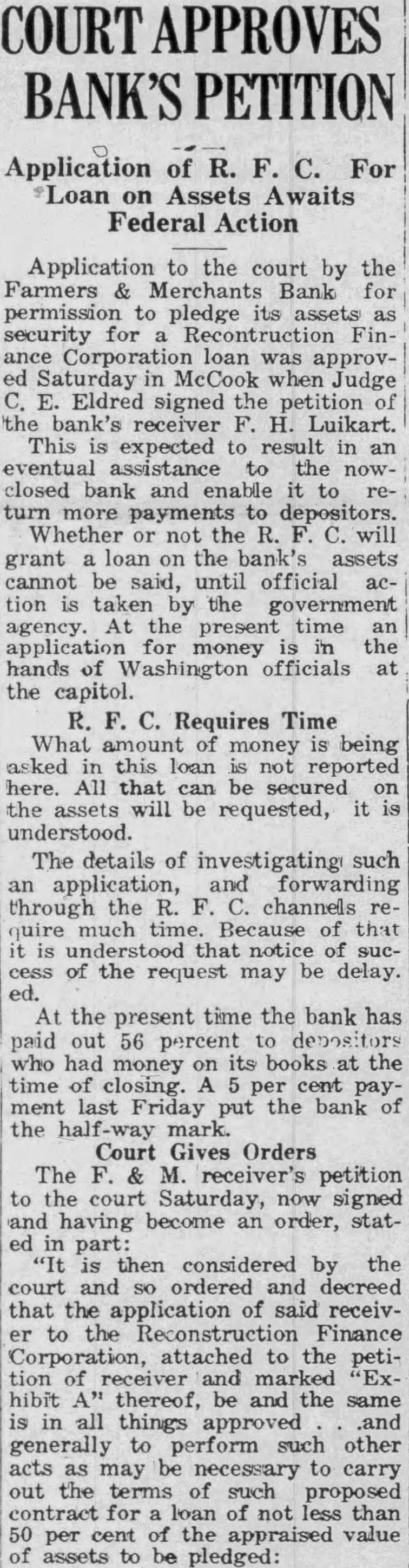 Application of For on Assets Awaits Federal Action Application to the court by the Farmers Merchants Bank permission to pledge its assets security FinCorporation loan was approvMcCook when Judge E. Eldred signed the petition bank's receiver H. Luikart. This expected to result in an eventual assistance the closed bank and enable it to turn more payments to depositors. Whether or not the R. will grant loan the bank's assets cannot be said, until official tion is taken by the government agency. the present time application for money in the hands of Washington officials the capitol. R. Requires Time What amount money being asked this loan not reported here. All that can be secured on the assets will be requested, it understood. The details of investigating such and forwarding through the channels much time. Because that that notice of of the request may be delay. At the present time the bank has paid out 56 percent to who had on its books at the money time of closing. per cent ment last Friday put the bank of the mark. Court Gives Orders The receiver's petition to the court Saturday, signed and having become an order, statpart: then considered by the court and ordered and decreed that the application said to the Reconstruction Finance Corporation, attached to the petition receiver marked hibit thereof, be and the in all things approved generally to perform such other acts as may be necessary to carry the terms of such proposed contract for loan not than per cent of the appraised value assets be pledged: