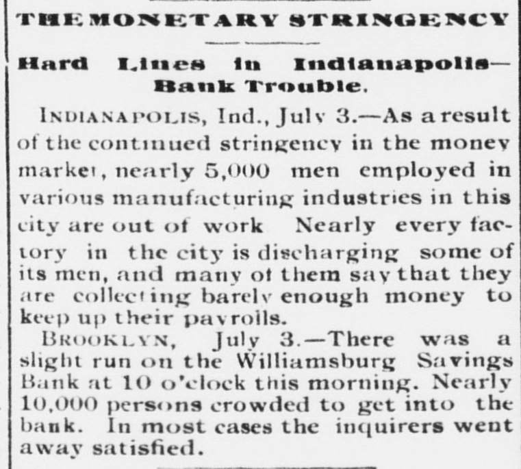 BANK FAILURE. The Albuquerqne National Temporarily Suspends Business. ALBUQUERQUE (N. M.), July 3.-The following note was posted on the door of the Albuquerque National Bank this morning: The Albuquerque National Bank is compelled temporarily to suspend business. This is brought about by the unusual demands of depositors since the suspension of the California banks about ten days ago, and the absolute impossibility during the present business depression to call in our loans. It is confidently hoped that we can soon resuine business and that every creditor will be paid in full, as the assets greatly exceed the liabilities. JOHN A. LEE, Vice-President. The suspension will cause no loss to depositors, as the bank has a surplus of $40,000. Other banks are exceptionally strong, and have large cash reserves. Full confidence is expressed by citizens, and no runs whatever are being made. The liabilities of the Albuquerque National Bank are $270,000, and the assets $420,000. The New Mexico Savings Bank and Trust Company is also closed, but they say the depositors will be paid in full. RESUMING BUSINESS. WASHINGTON, July 3. - Comptroller Eckels is advised that the First National Bank at San Diego, Cal., which failed one month ago, will resume business Wednesday, having complied with the conditions imposed by the Comptroller. It is probable, also, that the failed Washington National Bank of Spokane, Wash., will resume business in ten days. A RUN AT LEADVILLE. LEADVILLE (Col.), July 3.-A run was made on the California, Carbondale and American Banks to-day, but all demands of depositors were promptly met with cash, and at the closing hour the run had ceased. The American National Bank closed its doors this morning, but the directors say the depositors will be paid in full. The statement shows the resources to be $536,134 and the liabilities $347,625. RUN ON A BROOKLYN BANK. BROOKLYN, July 3.-There was a slight run on the Williamsburg Savings Bank this morning. Nearly 1,000 persons crowded into the bank as it opened, and until noon, anxious inquiries made show the proportion of those withdrawing deposits as to five to one of those depositing. General A. V. Meserole, President of the bank, said: "We paid out $230,000 on Saturday and took in $140,000, mostly from new depositors. We are doing business fast, and preparing for a run should it come." HAS PLENTY OF FUNDS. Cisco (Tex.), July 3.-The doors of the National Bank of Cisco were closed by the Inspector to-day, while the inspections of the bank's condition are being made, to prevent a run. The Cashier stated that the bank had two and a half dollars for every dollar of liabilities. DECLARED INSOLVENT. WINNIPEG (Man.), July 3.-The Commercial Bank of Manitoba has been declared insolvent and liquidators appointed to wind up its business. Bills of the bank are as good as gold under the Dominion law.