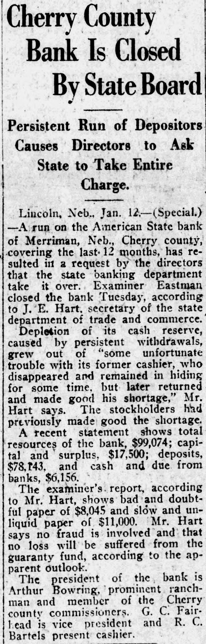 Cherry County Bank Is Closed By State Board Persistent Run of Depositors Causes Directors to Ask State to Take Entire Charge. Lincoln, Neb., Jan. 12:-(Special.) -A run on the American State bank of Merriman, Neb., Cherry county, covering the last 12 months, has resulted in a request by the directors that the state banking department take it over. Examiner Eastman closed the bank Tuesday, according to J. E. Hart. secretary of the state department of trade and commerce. Depletion of its cash reserve, caused by persistent withdrawals, grew out of "some unfortunate trouble with its former cashier, who disappeared and remained in hiding for some time, but later returned and made good his shortage," Mr. Hart says. The stockholders had previously made good the shortage. A recent statement shows total resources of the bank, $99,074; capital and surplus, $17,500; deposits, $78,143, and cash and due from banks, $6,156. The examiner's report, according to Mr. Hart, shows bad and doubtful paper of $8,045 and slow and unliquid paper of $11,000. Mr. Hart says no fraud is involved and that no loss will be suffered from the guaranty fund, according to the apparent outlook. The president of the bank is Arthur Bowring, prominent ranchman and member of the Cherry county commissioners. G. C. Fairhead is vice president and R. C. Bartels present cashier.