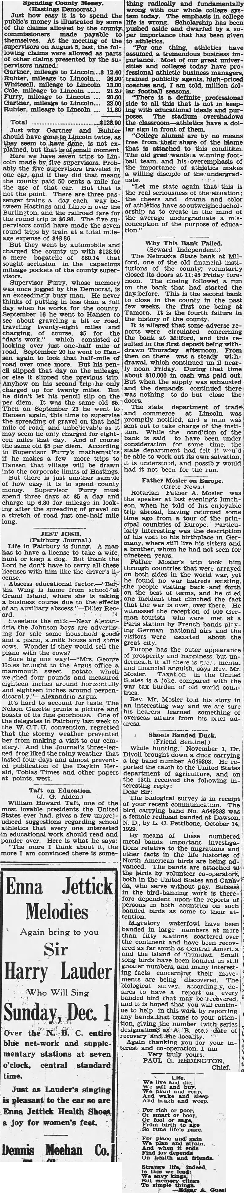 Total Just why Gartner and Ruhter should Lincoln twice, they seem have done, not but that Here we seven trips to Linby five Probably the five in and they did that the county paid cents mile for the use that car. But that the point. There trains way tween the railroad fare round trip pervisors could have the seven round trips by train at total mileexpense of But they went automobile and charged county up with mere bagatelle that sought seclusion in the capacious mileage pockets of the county supervisors. Supervisor Furry, whose memory once jogged the Democrat, exceedingly busy man. He never thinks of putting less than when he works for the county September he went Hansen about graveling bit road, traveling miles charging, course, 'day's which road. again that But his cil slipped that day on the mileage, slipped the Anyhow his charged twenty But he didn't his pencil on the diem. the old Then September he this time to supervise the spreading of gravel that half of road, and seem he charged for eightmiles course the per diem. According Supervisor Furry's mathemat he makes few more trips Hansen that village drawn limits Hastings But there just another sample spend county money. Supervisor Furry must spend $5 day charge for in looking the gravel on stretch of road just mile long.