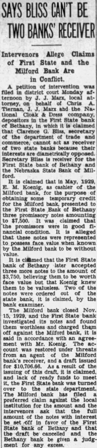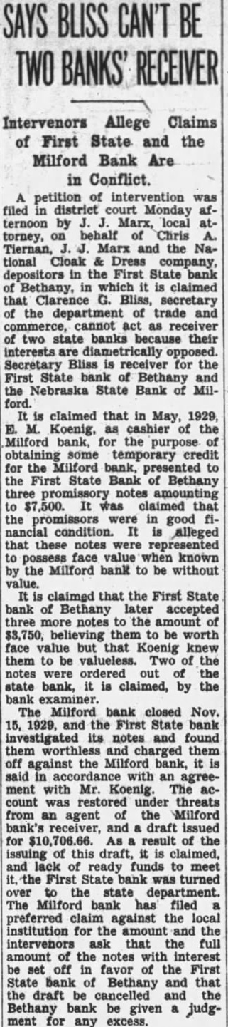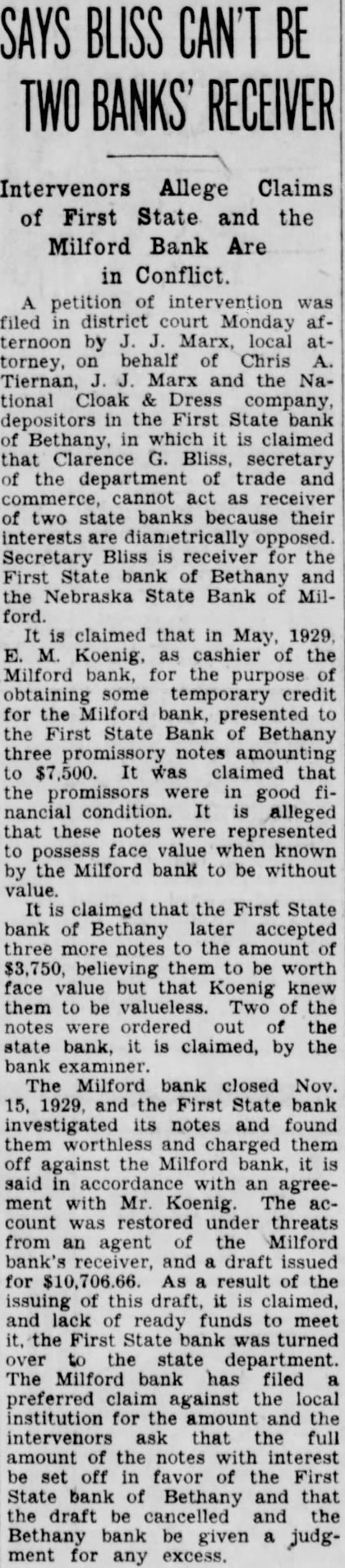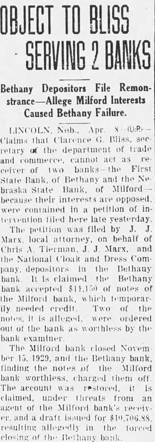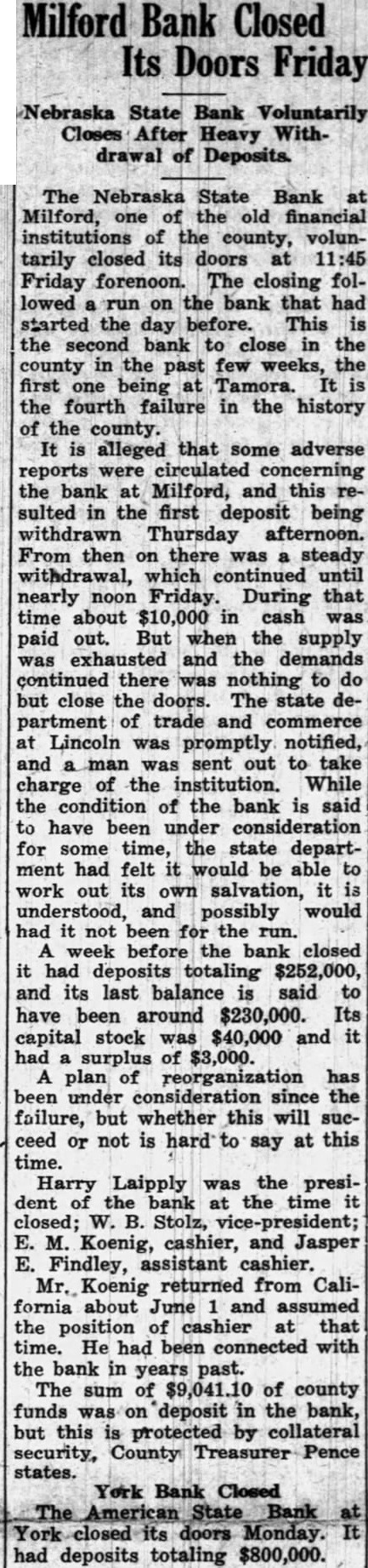 Why This Bank Failed. (Seward Independent.) The Nebraska State bank at Milford, one the old institutions county: voluntarily closed doors Friday forenoon. closing followed the bank that started This the second bank close the in the past first the fourth failure history of the county. that some adverse the at this sulted drawn Thursday afternoon. From then steady drawal, continued nearnoon During that time about in cash paid But when the supply exhausted the there nothing to do but close the doors. The state department of trade commerce at Lincoln promptly notified, and take charge of the While condition of the bank have been under for some state felt work out and possib would had it not been for the run.