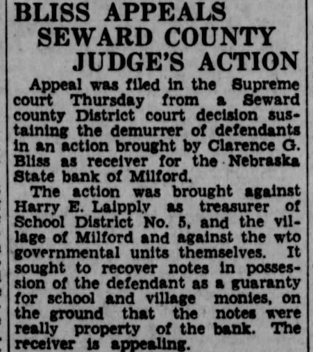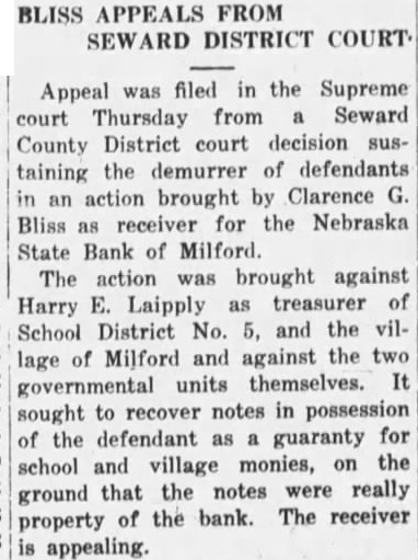 Appeal was filed in the Supreme court Thursday from a Seward County District court decision sustaining the demurrer of defendants in an action brought by Clarence G. Bliss as receiver for the Nebraska State Bank of Milford. The action was brought against Harry E. Laipply as treasurer of School District No. 5, and the village of Milford and against the two governmental units themselves. It sought to recover notes in possession of the defendant as a guaranty for school and village monies, on the ground that the notes were really property of the bank. The receiver is appealing.