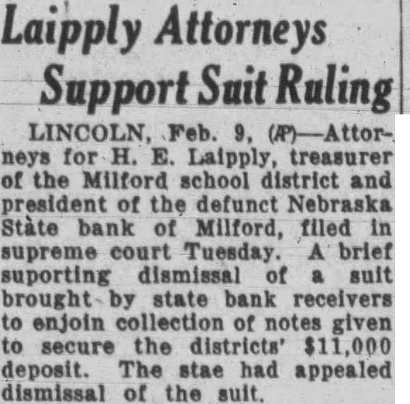 LINCOLN. Feb. 9, neys for Laipply, treasurer of the Milford school district and president of the defunct Nebraska State bank of Milford, filed supreme court Tuesday. A brief suporting dismissal of suit brought by state bank receivers enjoin of notes given to secure the districts' deposit The stae had appealed dismissal of the suit.