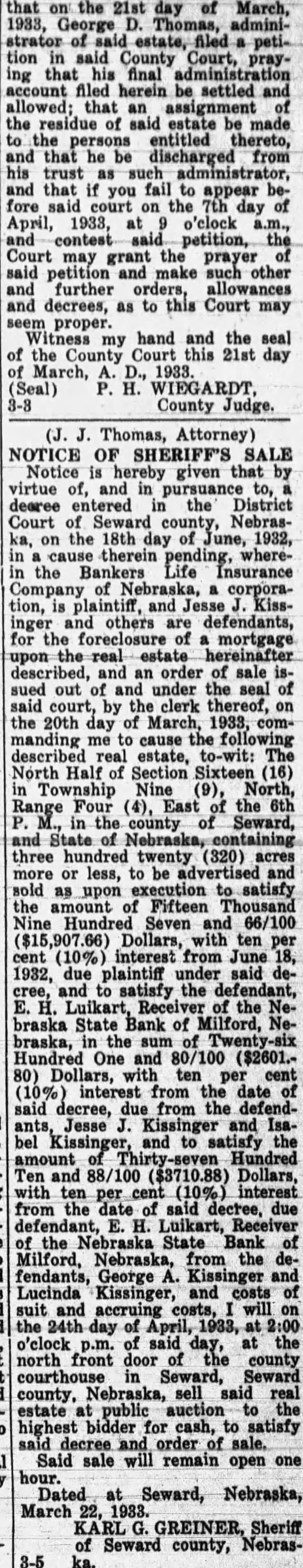 the day of March, 1933, George Thomas, strator of tion said County Court, that his final account filed herein settled allowed; that assignment the residue estate made the persons entitled thereto, that he from trust such and that fail appear you fore said court the day April, 1933, o'clock petition, Court may grant the and make such other and further orders, and decrees, as to this Court may proper. hand and the my the County Court this day March, 1933. (Seal) 3-3 County Thomas, Attorney) OF SHERIFF'S SALE Notice is hereby given that virtue and in pursuance decree entered the District Court Seward county, Nebrasthe 18th day therein pending, the Insurance Company Nebraska, corporaplaintiff, and Jesse Kissinger others defendants, the foreclosure mortgage and an order of sued under the said court, by the clerk the day of March, manding cause the described estate, to-wit: North of Sixteen Township Nine North, Range Four (4), East the in the county Seward, and State three hundred twenty (320) acres more less, to be advertised sold upon execution satisfy the amount Fifteen Thousand Hundred Seven and Dollars, with ten cent interest from due plaintiff under said and satisfy the Luikart, Receiver of the braska State Bank of Milford, braska, the of Hundred One and with ten interest from the date said decree, due from the Jesse and Isabel Kissinger, and to satisfy amount Hundred and Dollars, cent interest from date of said decree, due defendant, Luikart, Receiver the Nebraska State Bank Milford, Nebraska, the fendants, George Kissinger Lucinda Kissinger, and suit and accruing costs, o'clock said at north front door of county courthouse Seward, Seward county, Nebraska, sell said real estate public auction to the highest bidder for cash, to satisfy order Said sale will remain open one hour. Seward, March KARL Seward county, Nebras3-5 ka.