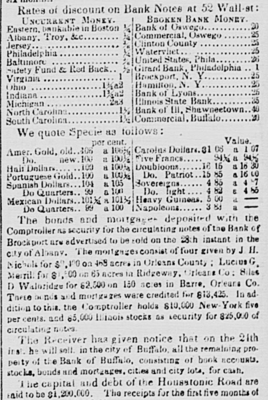 tained, but State 51's declined. The sales were 83 4,000 State 5's 1-51 82 2,300 do de 45 5,000 do 51 85 16,000 do do 413 1,000 Illinois Sixes, 1870 413 15 1,000 do do 414 660 1.000 do do 441 bow 2,000 Indiana Bonds 433 1,000 do do 431 8,000 do do No transactions of importance in Foreign Exchanges. We quote Domestic bills 8 a 8 Interior of Ala 34 a 33 Philadelphia 23 a 3 New Orleans 21 a 23 Baltimore 10gall Naskville 4 a 5 Virginia. a 7 Louisville - 4 North Carolina - a 10 Cincinnati 11 a 1) Charleston 8} I Indiana 2f 3 Savannah 10 all Illinois 23 3 Augusta - a Natchez 12 a12) Columbus - a 10 St. Louis 13 a 14 Macon 74 a 8 Mobile There was a sale of Massachusetts Fives; 1842, at Bos108, at 983 and 1859 at 95 a 961. In addition to those noticed yesterday the following Philadelphia Bauks have declared dividends Manufacturers and Mechanics 21 per cent, Western 3, Mayamensing21, Mechanics 21, Farmers and Mechanics 21, Bank Penn Township 21. Last Monday, according to the Buffalo Commercial, there was a run on the Bank of Buffalo for specie which continued until about 11 A. M., when having paid out a considerable amount, the Bank >topped payment. A meeting of the stockholders of the Schuylkill Bank W&R held at Philadelphia on Tuesday. It was stated that it had discharged all its liabilities excepting the claim against it for the Levis frauds. The report shows an excess of $360 000 of assets over liabilities. The amount of duties collected at Philadelphia during 1,517,206 40 the year 1840 was 1,507,778 99 For the first three quarters of 1841 9,435 71 Difference only The Bank of the United States has moved for a rule to show cause why a new trial should not be granted in the case of the United States Vs. Bank of the United States, and has filed reasons. New-York Markets. ASHES-The market is dal and some lots of Pots have been sold at 6,00, which is 123c. decline. Sales Pearls at 5,75. COTTON- sales to-day have been about 700 bales at previous. FLOUR.- Ther is no change to notice. The market is dull at 6,00 for Western, but there is NO Genessee or Ohio to be had lower. Michigan and Troy are scarce at 5,87 5,95. The arrivals are to fair extent, and the demand moderate. Southern is selling in small lote at 6 a 6,12 for Georgetown and Howard Street and 6,26 for Braudywine. GRAIN- About 1000 bushels good Illinois Wheat sold at 1 35c for milling. Sales 1000 bushels Jersey Corn at 59c.; 1200 do. Northern at 67c. weight; 2300 do. at 70c. measure; 1500 do. Southern at 65, measure, all delivered. Sales 2208 bushels Kye a 67c to go East 1000 do. at 70. Oats are in fair demand at 49 a 50c. The quantity of Flour and Wheat delivered from the Eric Canal during the last week in October, at the places named below is as follows, viz Bush. Wheat. Bbls. Flour 2.890 532 Schewectudy 63 775 25,661 West Troy 52.376 13,812 Albany 30,497 Total 78,469 The following is the aggregate of Flour and Wheat delivered from the Eric Canal during the month of October at the same places Bush. Wheat Bbls. Flour. 2969 2,:96 Schenectady 201.654 88.060 West Troy 47515 180,848 Albany $90,138 Total 271,701