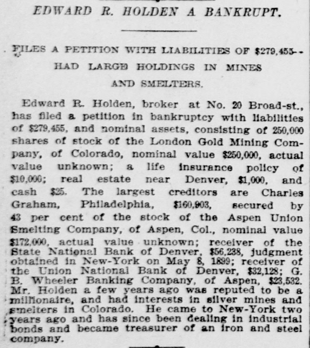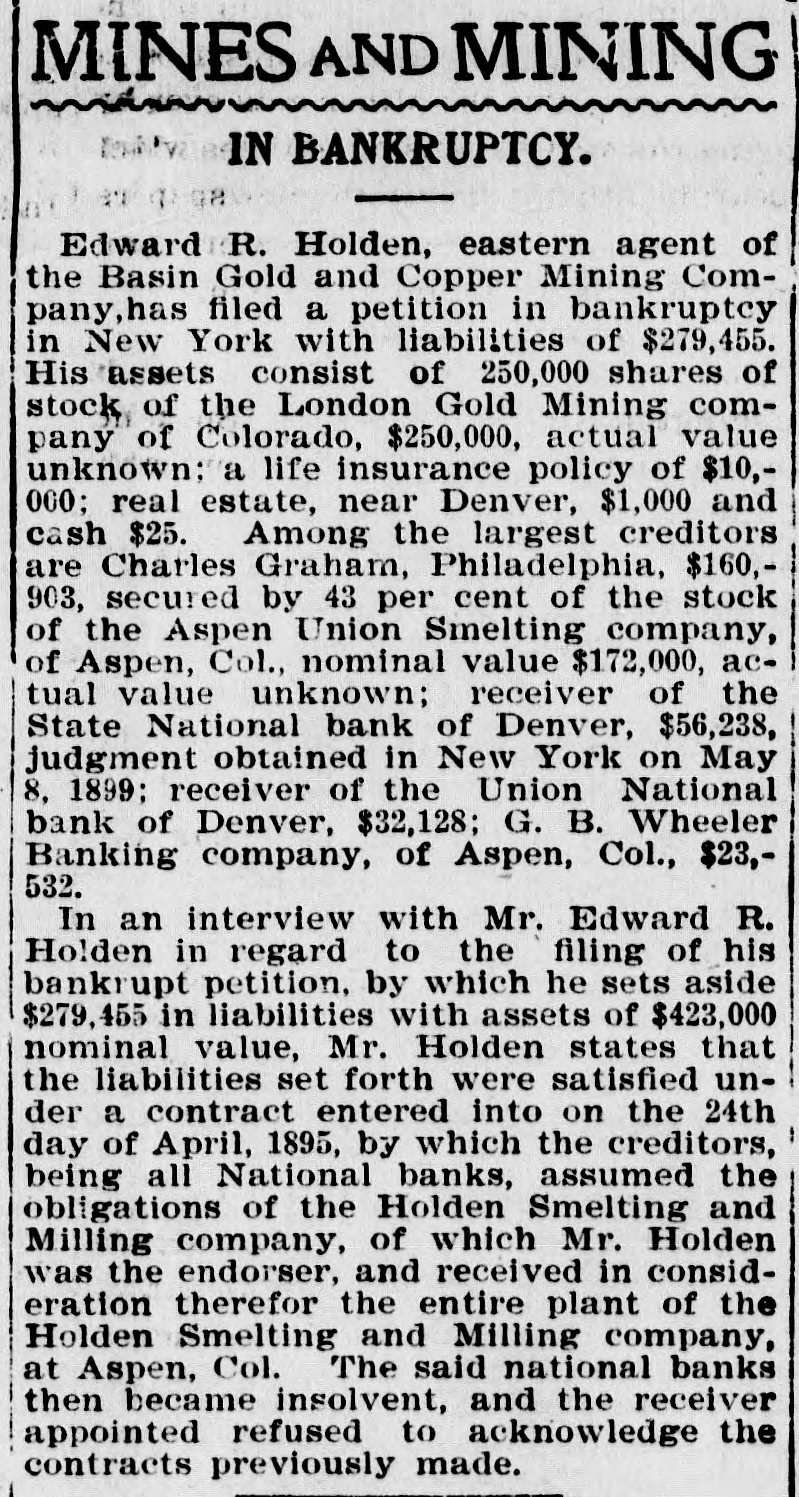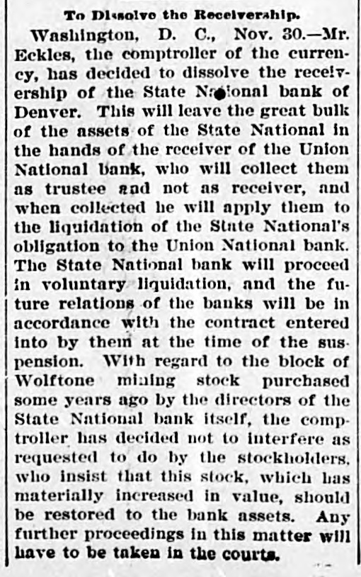 To Dissolve the Receivership. Washington, D. C., Nov. 30.-Mr. Eckles, the comptroller of the currency, has decided to dissolve the receivership of the State National bank of Denver. This will leave the great bulk of the assets of the State National in the hands of the receiver of the Union National bank, who will collect them as trustee and not as receiver, and when collected he will apply them to the liquidation of the State National's obligation to the Union National bank. The State National bank will proceed in voluntary liquidation, and the future relations of the banks will be in accordance with the contract entered into by them at the time of the sus. pension. With regard to the block of Wolftone mining stock purchased some years ago by the directors of the State National bank itself, the comptroller has decided not to interfere as requested to do by the stockholders. who insist that this stock, which has materially increased in value, should be restored to the bank assets. Any further proceedings in this matter will have to be taken in the courts.