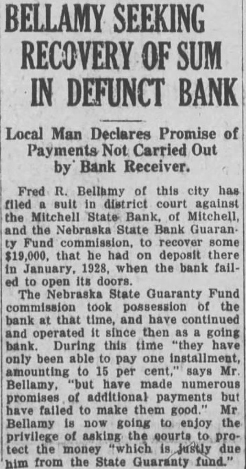 BELLAMY SEEKING RECOVERY OF SUM IN DEFUNCT BANK Local Man Declares Promise of Payments Not Carried Out by Bank Receiver. Fred Bellamy of this city has filed suit district court against the Mitchell State of Mitchell, the Nebraska State Bank GuaranFund commission, to recover some that he had deposit there January, 1928, when the bank failto open its doors. The Nebraska State Guaranty Fund commission took possession the bank that time, have continued and operated since then as going bank. During this time "they only been able to pay one installment, amounting to per cent,' Mr Bellamy, have made numerous promises of additional payments but failed to make them good.' Mr Bellamy now going enjoy the privilege asking the money justly due him from the State Guaranty
