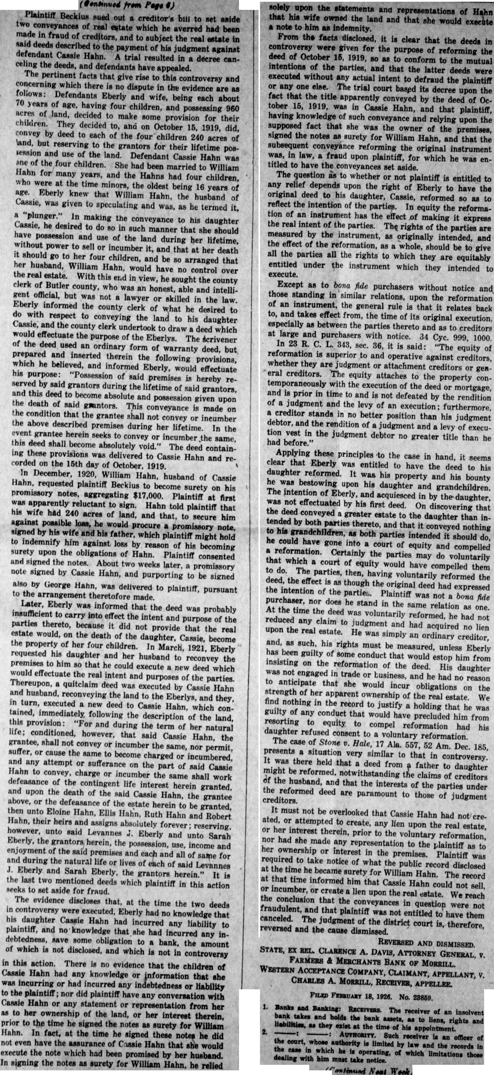 Plaintiff Beckius sued out a creditor's bill to set aside two conveyances of real estate which he averred had been made in fraud of creditors, and to subject the real estate in said deeds described to the payment of his judgment against defendant Cassie Hahn. A trial resulted in a decree canceling the deeds, and defendants have appealed. The pertinent facts that give rise to this controversy and concerning which there is no dispute in the evidence are as follows: Defendants Eberly and wife, being each about 70 years of age, having four children, and possessing 960 acres of land, decided to make some provision for their children. They decided to, and on October 15, 1919, did, convey by deed to each of the four children 240 acres of land, but reserving to the grantors for their lifetime possession and use of the land. Defendant Cassie Hahn was one of the four children. She had been married to William Hahn for many years, and the Hahns had four children, who were at the time minors, the oldest being 16 years of age. Eberly knew that William Hahn, the husband of Cassie, was given to speculating and was, as he termed it, a "plunger." In making the conveyance to his daughter Cassie, he desired to do so in such manner that she should have possession and use of the land during her lifetime, without power to sell or incumber it, and that at her death it should go to her four children, and be so arranged that her husband, William Hahn, would have no control over the real estate. With this end in view, he sought the county clerk of Butler county, who was an honest, able and intelligent official, but was not a lawyer or skilled in the law. Eberly informed the county clerk of what he desired to do with respect to conveying the land to his daughter Cassie, and the county clerk undertook to draw a deed which would effectuate the purpose of the Eberlys. The scrivener of the deed used an ordinary form of warranty deed, but prepared and inserted therein the following provisions, which he believed, and informed Eberly, would effectuate his purpose: "Possession of said premises is hereby reserved by said grantors during the lifetime of said grantors, and this deed to become absolute and possession given upon the death of said grantors. This conveyance is made on the condition that the grantee shall not convey or incumber the above described premises during her lifetime. In the event grantee herein seeks to convey or incumber the same, this deed shall become absolutely void." The deed containing these provisions was delivered to Cassie Hahn and recorded on the 15th day of October, 1919. In December, 1920, William Hahn, husband of Cassie Hahn, requested plaintiff Beckius to become surety on his promissory notes, aggregating $17,000. Plaintiff at first was apparently reluctant to sign. Hahn told plaintiff that his wife had 240 acres of land, and that, to secure him against possible loss, he would procure a promissory note, signed by his wife and his father, which plaintiff might hold to indemnify him against loss by reason of his becoming surety upon the obligations of Hahn. Plaintiff consented and signed the notes. About two weeks later, a promissory note signed by Cassie Hahn, and purporting to be signed also by George Hahn, was delivered to plaintiff, pursuant to the arrangement theretofore made. Later, Eberly was informed that the deed was probably insufficient to carry into effect the intent and purpose of the parties thereto, because it did not provide that the real estate would, on the death of the daughter, Cassie, become the property of her four children. In March, 1921, Eberly requested his daughter and her husband to reconvey the premises to him so that he could execute a new deed which would effectuate the real intent and purposes of the parties. Thereupon, a quitclaim deed was executed by Cassie Hahn and husband, reconveying the land to the Eberlys, and they, in turn, executed a new deed to Cassie Hahn, which contained, immediately following the description of the land, this provision: "For and during the term of her natural life; conditioned, however, that said Cassie Hahn, the grantee, shall not convey or incumber the same, nor permit, suffer, or cause the same to become charged or incumbered, and any attempt or sufferance on the part of said Cassie Hahn to convey, charge or incumber the same shall work defeasance of the contingent life interest herein granted, and upon the death of the said Cassie Hahn, the grantee above, or the defeasance of the estate herein to be granted, then unto Eloine Hahn, Ellis Hahn, Ruth Hahn and Robert Hahn, their heirs and assigns absolutely forever; reserving. however, unto said Levannes J. Eberly and unto Sarah Eberly, the grantors herein, the possession, use, income and enjoyment of the said premises and each and all of same for and during the natural life or lives of each of said Levannes J. Eberly and Sarah Eberly, the grantors herein." It is the last two mentioned deeds which plaintiff in this action seeks to set aside for fraud. The evidence discloses that, at the time the two deeds in controversy were executed, Eberly had no knowledge that his daughter Cassie Hahn had incurred any liability to plaintiff, and no knowledge that she had incurred any indebtedness, save some obligation to a bank, the amount of which is not disclosed, and which is not in controversy in this action. There is no evidence that the children of Cassie Hahn had any knowledge or information that she was incurring or had incurred any indebtedness or liability to the plaintiff; nor did plaintiff have any conversation with Cassie Hahn or any statement or representation from her as to her ownership of the land, or her interest therein, prior to the time he signed the notes as surety for William Hahn. In fact, at the time he signed these notes he did not even have the assurance of Cassie Hahn that she would execute the note which had been promised by her husband. In signing the notes as suret