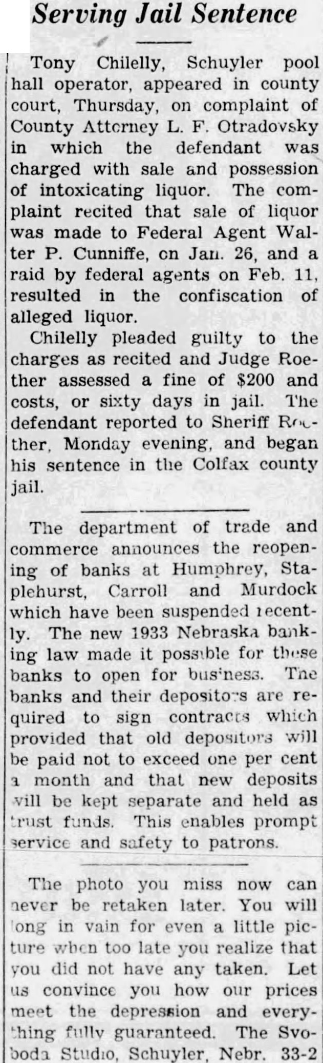 Serving Jail Sentence Tony Chilelly, Schuyler pool hall operator, appeared in county Thursday, on complaint of County Attorney Otradovsky which defendant was charged with sale and possession intoxicating liquor. The complaint recited that sale of liquor made to Federal Agent Walter Cunniffe, Jan. and raid by federal agents on Feb. in the confiscation alleged liquor. Chilelly pleaded guilty to the charges as recited and Judge Roether assessed fine of $200 and costs, or sixty days in jail. The defendant reported to Sheriff ther, Monday evening, and began his sentence in the Colfax county jail. The department of trade and announces the reopening of banks at Humphrey, StaCarroll and Murdock plehurst, which have been suspended recentnew 1933 Nebraska banklaw made possible for these banks to open for business. The banks and their depositors are quired sign contracts which provided that old depositors will paid exceed per cent month that new deposits will be kept separate and held trust This enables prompt and safety to patrons. The photo you miss now be retaken later. You will ong in vain for even little picwhen too late you realize that did not have any taken. Let convince you how our prices meet the depression and fully guaranteed. The Studio, Schuyler, Nebr.