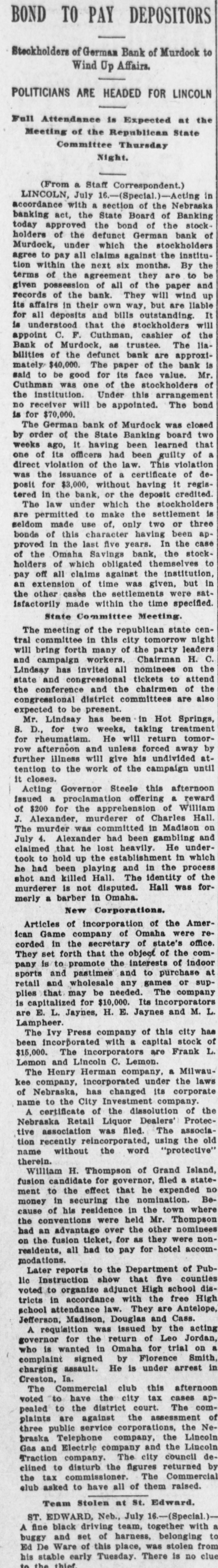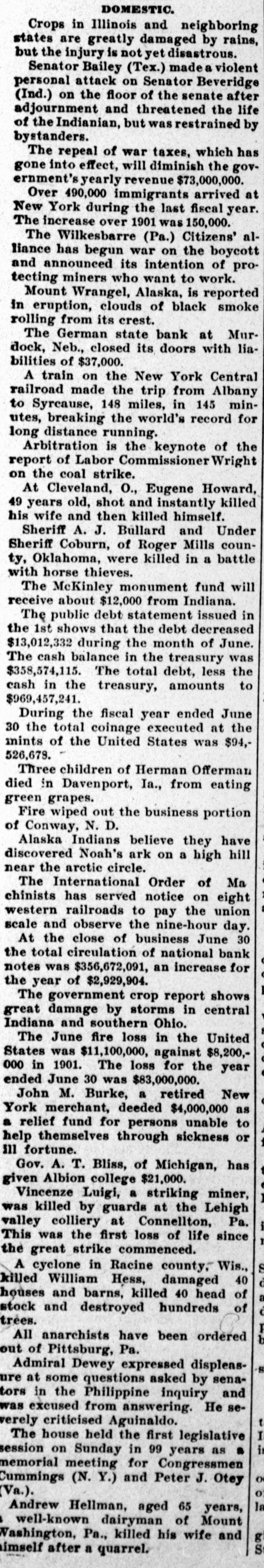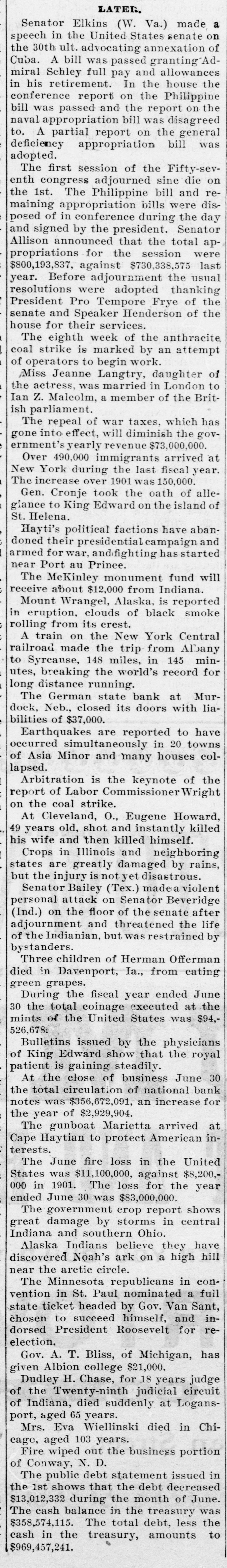 # LATER. Senator Elkins (W. Va.) made a speech in the United States senate on the 30th ult. advocating annexation of Cuba. A bill was passed granting Admiral Schley full pay and allowances in his retirement. In the house the conference report on the Philippine bill was passed and the report on the naval appropriation bill was disagreed to. A partial report on the general deficiency appropriation bill was adopted. The first session of the Fifty-seventh congress adjourned sine die on the 1st. The Philippine bill and remaining appropriation bills were disposed of in conference during the day and signed by the president. Senator Allison announced that the total appropriations for the session were $800,193,837, against $730,338,575 last year. Before adjournment the usual resolutions were adopted thanking President Pro Tempore Frye of the senate and Speaker Henderson of the house for their services. The eighth week of the anthracite coal strike is marked by an attempt of operators to begin work. Miss Jeanne Langtry, daughter of the actress, was married in London to Ian Z. Malcolm, a member of the British parliament. The repeal of war taxes, which has gone into effect, will diminish the government's yearly revenue $73,000,000. Over 490,000 immigrants arrived at New York during the last fiscal year. The increase over 1901 was 150,000. Gen. Cronje took the oath of allegiance to King Edward on the island of St. Helena. Hayti's political factions have abandoned their presidential campaign and armed for war, and fighting has started near Port au Prince. The McKinley monument fund will receive about $12,000 from Indiana. Mount Wrangel, Alaska, is reported in eruption, clouds of black smoke rolling from its crest. A train on the New York Central railroad made the trip from Albany to Syrcause, 148 miles, in 145 minutes, breaking the world's record for long distance running. The German state bank at Murdock, Neb., closed its doors with liabilities of $37,000. Earthquakes are reported to have occurred simultaneously in 20 towns of Asia Minor and many houses collapsed. Arbitration is the keynote of the report of Labor Commissioner Wright on the coal strike. At Cleveland, O., Eugene Howard, 49 years old, shot and instantly killed his wife and then killed himself. Crops in Illinois and neighboring states are greatly damaged by rains, but the injury is not yet disastrous. Senator Bailey (Tex.) made a violent personal attack on Senator Beveridge (Ind.) on the floor of the senate after adjournment and threatened the life of the Indianian, but was restrained by bystanders. Three children of Herman Offerman died in Davenport, Ia., from eating green grapes. During the fiscal year ended June 30 the total coinage executed at the mints of the United States was $94,526,678. Bulletins issued by the physicians of King Edward show that the royal patient is gaining steadily. At the close of business June 30 the total circulation of national bank notes was $356,672,091, an increase for the year of $2,929,904. The gunboat Marietta arrived at Cape Haytian to protect American interests. The June fire loss in the United States was $11,100,000, against $8,200,000 in 1901. The loss for the year ended June 30 was $83,000,000. The government crop report shows great damage by storms in central Indiana and southern Ohio. Alaska Indians believe they have discovered Noah's ark on a high hill near the arctic circle. The Minnesota republicans in convention in St. Paul nominated a full state ticket headed by Gov. Van Sant, chosen to succeed himself, and indorsed President Roosevelt for re-election. Gov. A. T. Bliss, of Michigan, has given Albion college $21,000. Dudley H. Chase, for 18 years judge of the Twenty-ninth judicial circuit of Indiana, died suddenly at Logansport, aged 65 years. Mrs. Eva Wiellinski died in Chicago, aged 103 years. Fire wiped out the business portion of Conway, N. D. The public debt statement issued in the 1st shows that the debt decreased $13,012,332 during the month of June. The cash balance in the treasury was $358,574,115. The total debt, less the cash in the treasury, amounts to $969,457,241.