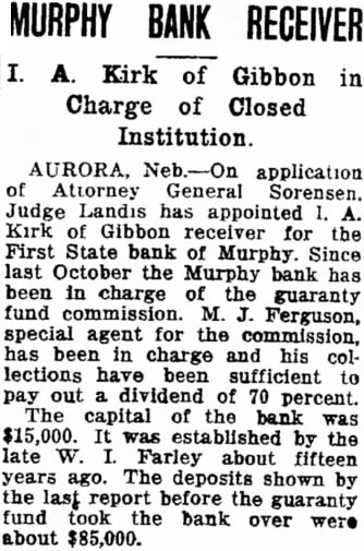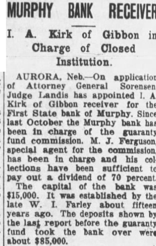 AURORA, Neb-On application of Attorney General Sorensen. Judge Landis has appointed 1. A. Kirk of Gibbon receiver for the First State bank of Murphy. Since last October the Murphy bank has been in charge of the guaranty fund commission. M. J. Ferguson, special agent for the commission, has been in charge and his collections have been sufficient to pay out a dividend of 70 percent. The capital of the bank was $15,000. It was established by the late W. I. Farley about fifteen years ago. The deposits shown by the last report before the guaranty fund took the bank over were about $85,000.