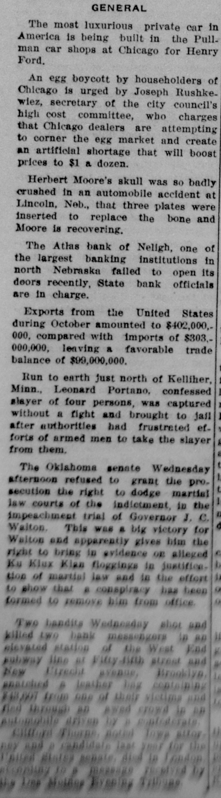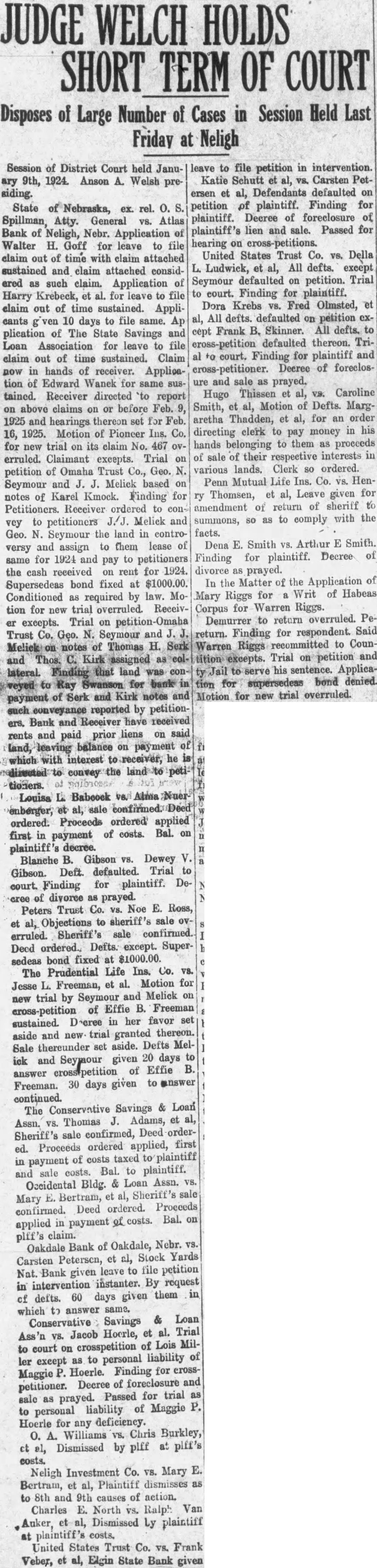 Session of District Court held January 9th, 1924. Anson A. Welsh presiding. State Nebraska, ex. rel. Spillman, Atty. General Atlas Bank of Neligh, Nebr. Application of Walter H. Goff for leave to file claim out of time with claim attached sustained and claim attached considered as such claim. Application of Harry Krebeck, et al. for leave to file claim out of time sustained. Applicants 10 days to file same. Ap plication of The State Savings and Loan Association for leave to file claim out of time sustained. Claim now in hands of receiver. Application of Edward Wanek for same sustained. Receiver directed 'to report on above claims on or before Feb. 1925 and hearings thereon set for Feb. 16, 1925. Motion of Pioncer Ins. Co. for new trial on its claim No. 467 erruled. Claimant excepts. Trial on petition of Omaha Trust Co., Geo. Seymour and J. Melick based on notes of Karel Kmock. Finding for Petitioners. Receiver ordered to vey to petitioners J.J. Melick and Geo. N. Seymour the land in controversy and assign to them lease of same for 1924 and pay to petitioners the cash received on rent for 1924. Supersedeas bond fixed at $1000.00. Conditioned as required by law. Motion for new trial overruled. Receiver excepts. Trial on Trust Co. Geo. N. Seymour and Melick notes of Thomas H. Serk and Thos. C. assigned lateral. Finding that land was veyed Ray Swanson for bank in payment of Serk and Kirk notes and such conveyance reported by petitioners. Bank and Receiver have received rents and paid prior liens on said land, balance on payment of which with interest receiver, he is edirected to convey the petitioners. L. Baboock Alma Nuer Louisa enberger, et al, sale ordered. Proceeds ordered applied first in payment of costs. Bal. on plaintiff's decree. Blanche B. Gibson VS. Dewey V. Gibson. Deft. defaulted. Trial to court. Finding for plaintiff. Decree of divorce as prayed. Peters Trust Co. vs. Noe E. Ross, et al, Objections to sheriff's sale ovSheriff's sale confirmed. erruled. Decd ordered., Defts. except. Supersedeas bond fixed at $1000.00. The Prudential Life Ins. Co. vs. Jesse L. Freeman, et al. Motion for new trial by Seymour and Melick on of Effie B. Freeman eross-petition in her favor set sustained. aside and new trial granted thereon. Sale thereunder set aside. Defts Melick and Seymour given 20 days to answer cross-petition of Effie B. 30 given to answer Freeman. days continued. The Conservative Savings & Loan J. Adams, et al, Assn. vs. Thomas Sheriff's sale confirmed, Deed ordered. Proceeds ordered applied, first in payment of costs taxed to plaintiff and sale costs. Bal. to plaintiff. Occidental Bldg. & Loan Assn. vs. al, Sheriff's sale Bertram, et Mary ordered. Proceeds Deed confirmed. costs. Bal. on applied in payment plff's claim. Oakdale Bank of Oakdale, Nebr. vs. Stock Yards Petersen, et al, Carsten Nat. Bank given leave to file petition in intervention instanter. By request of defts. 60 days given them in which to answer same. & Loan Conservative Savings Ass'n vs. Jacob Hocrle, et al. Trial to court on crosspetition of Lois Miller except as to personal liability of Maggie P. Hoerle. Finding for crossof foreclosure and Decree petitioner. Passed for trial sale as prayed. P. liability of Maggie to personal Hoerle for any deficiency. O. Д. Williams vs. Chris Burkley, ct Dismissed by plff at plff's costs. Neligh Investment Co. vs. Mary E. Bertram, et al, Plaintiff dismisses as to 8th and 9th causes of action. Charles E. North vs. Ralph Van Auker, Dismissed Ly plaintiff at plaintiff's costs, United States Trust Co. VS. Frank Veber, et al, Elgin State Bank given leave to file petition in intervention. Katie Schutt et vs. Carsten Petersen et al, Defendants defaulted on petition of plaintiff. Finding for plaintiff. Decree of foreclosure of plaintiff's lien and sale. Passed for hearing on United States Trust Co. VS. Della L. Ludwick, et al, All defts. except Seymour defaulted on petition. Trial to court. Finding for plaintiff. Dora Krebs vs. Fred Olmsted, al, All defts. defaulted on petition except Frank B. Skinner. All defts. to defaulted thereon. Trial to court. Finding for plaintiff and Decree of foreclosure and sale as prayed. Thissen et al, Caroline Hugo Smith, et al, Motion of Defts. Margaretha Thadden, et al, for an order directing clerk to pay money in his hands belonging to them as proceeds of sale of their respective interests in various lands. Clerk so ordered. Penn Mutual Life Ins. Co. vs. HenThomsen, et al, Leave given for amendment of return of sheriff summons, so as to comply with the facts. Dena E. Smith VS. Arthur E Smith. Finding for plaintiff. Decree of divorce as prayed. In the Matter of the Application of for Writ of Habeas Mary Riggs Corpus for Warren Riggs. Demurrer to return overruled. Pereturn. Finding for respondent. Said recommitted to CounTrial petition and on to serve his sentence. Applicabond denied. tion for supersedeas Motion for new trial overruled.