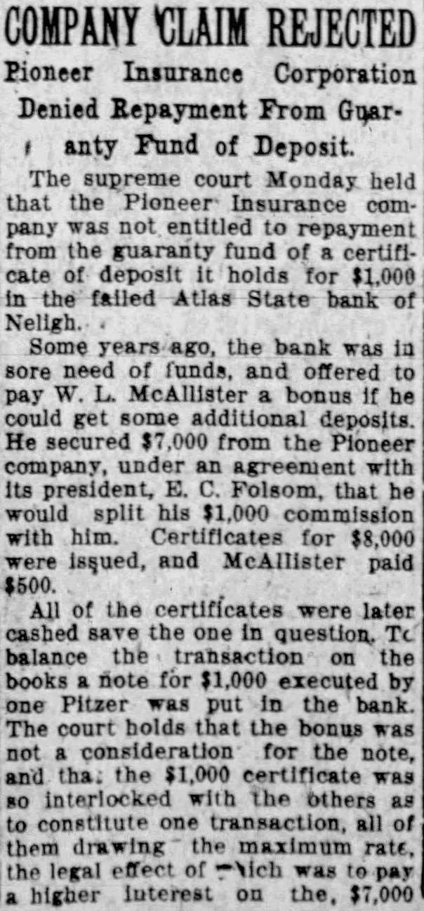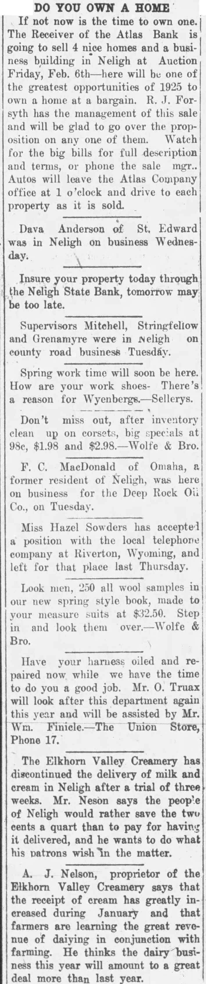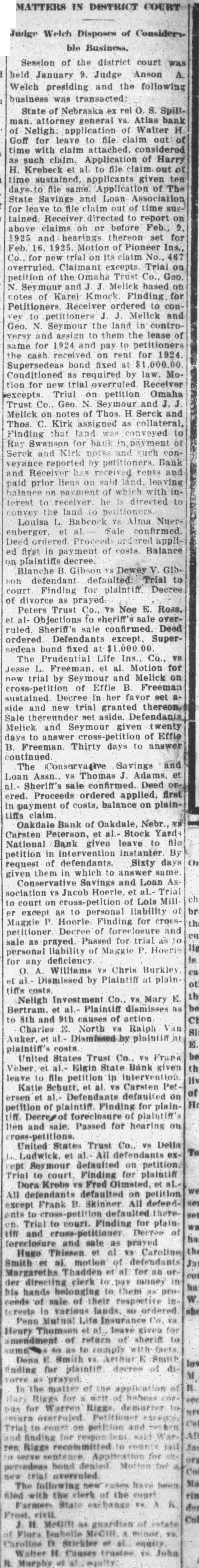 MATTERS IN DISTRICT COURT Judge Welch Disposes of Considers- ble Business. Session of the district court was held January 9. Judge Anson A. Welch presiding and the following business was transacted: State of Nebraska ex rel O. S. Spillman. attorney general vs. Atlas bank of Neligh: application of Walter H Goff for leave to file claim out of time with claim attached. considered such claim. Application of Harry H. Krebeck et al. to file claim out of time sustained, applicants given ten days. to file same. Application of The State Savings and Loan Association for leave to file claim out of time suetained. Receiver directed to report on above claims on or before Feb., 9. 1925 and hearings thereon set for Feb. 16. 1925. Motion of Pioneer Ins., Co., for new trial on its claim No., 467 overruled. Claimant excepts. Trial on petition of the Omaha Trust Co., Geo. N. Seymour and J Melick based on notes of Karel Kmock Finding. for Petitioners. Receiver ordered to convey to petitioners J. Melick and Geo. N. Seymour the land in controversy and assign to them the lease of same for 1924 and pay to petitioners the cash received on rent for 1924. Supersedeas bond fixed at 00. Conditioned as required by law. Motion for new trial overruled Receiver excepts. Trial on petition Omaha Trust Co. Geo. N. Seymour and J. J. Melick on notes of Thos. H Serck and Thos. C. Kirk assigned as collateral, Finding that land was conveyed to Ray Swanson for bank in payment of Serck and Kirk notes and such conveyance reported by petitioners. Bank and Receiver has received rents and paid prior Hens on said land. leaving balance on payment of which with interest to receiver he Is directed to convey the land to petitioners. Louisa L. Babcock VS Alma Nuerenberger. et Sale confirmed. Deed ordered Proceeds ordered applied first in payment of costs. Balance on plaintiffs decree. Blanche B. Gibson vs Dewey V. Gibson defendant defaulted: Trial to court Finding for plaintiff. Decree of divorce as prayed. Peters Trust Co., VS Noe E. Ross, et al- Objections to sheriff's sale overruled. Sheriff's sale confirmed. Deed ordered. Defendants except. Supersedeas bond fixed at 1.000 00. The Prudential Life Ins., Co., VS Jesse L. Freeman, et al. Motion for new trial by Seymour and Melick on cross-petition of Effie B. Freeman sustained. Decree in her favor set aside and new trial granted thereon. Sale thereunder set aside. Defendants Melick and Seymour given wenty days to answer cross-petition of Effie B. Freeman. Thirty days to answer continued. The Conservative Savings and Loan Assn., vs Thomas J. Adams, et al. Sheriff's sale confirmed. Deed OF-2 ered. Proceeds ordered applied, first in payment of costs, balance on plaintiffs claim. Oakdale Bank of Oakdale, Nebr. vs Carsten Peterson, et al.- Stock Yards National Bank given leave to file petition in intervention instanter. By request of defendants. Sixty days given them in which to answer same Conservative Savings and Loan As sociation VS Jacob Hoerle, et al. Trial to court on cross-petition of Lois Mill er except as to personal liability of Maggie P. Hoerle Finding for crosspetitioner Decree of foreclosure and sale as prayed. Passed for trial as to personal liability of Maggie P. Hoerie for any deficiency. O. Williams V8 Chris Burkley et al.- Dismissed by Plaintiff at plaintiffs costs. Neligh Investment Co., VS Mary E. Bertram. et al.- Plaintiff dismisses as to 8th and 9th causes of action Charles E. North VS Ralph Van Auker. et at- Dismissed by plaintiff at plaintiff's costs. United States Trust Co., vs Frank Veber et al.- Elgin State Bank given leave to file petition in intervention Katie Schutt. et al. vs Carsten Petersen et al.- Defendants defaulted on petition of plaintiff. Finding for plainlien and sale. Passed for hearing on United States Trust Co., V8 Della L. Ludwick. et at. All defendants exept Seymour defaulted on petition. Trial to court. Finding for plaintiff Dora Krebs vs Fred Olmsted, et al.All defendants defaulted on petition except Frank B. Skinner All defendents cross-petition defaulted thereon. Trial to court. Finding for plain. (iff and cross-petitioner Decree of foreclosure and sale as prayed Hugo Thissen et at vs Caroline Smith et al. motion of defendants Margaretha Thadden et at for an or. der directing clerk to pay money in his hands belonging to them as proceeds of sale of their respoctive in. terests in various lands. so ordered Penn Mastral Life Insurance Co. va Henry Thomsen et al leave given for mendment of return of sheriff to Anding for plaintiff decree of divoree as In the matter of the application of Trial to court on petition and return and finding for respon leat said Warpersodens bond denied Motion for new trial overruled. The following new cases have been filed with the clerk of the court J. H Medin as guardian of estate