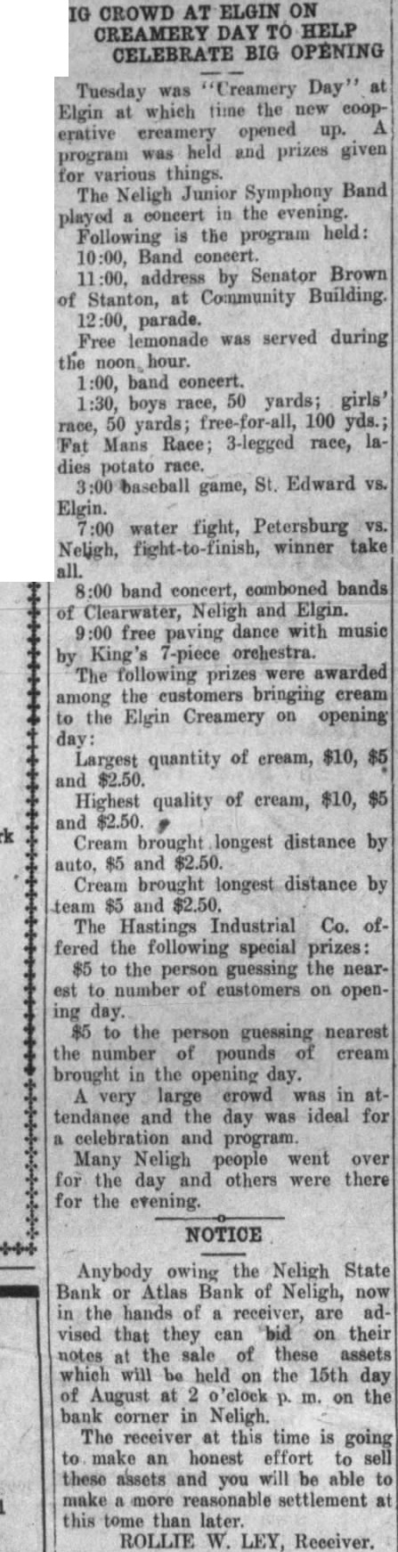 BIG CROWD AT ELGIN ON CREAMERY DAY TO HELP CELEBRATE BIG OPENING Tuesday was "Creamery Day' at Elgin at which time the new coopA erative ereamery opened up. program was held and prizes given for various things. The Neligh Junior Symphony Band played a concert in the evening. Following is the program held: 10:00, Band concert. 11:00, address by Senator Brown of Stanton, at Community Building. 12:00, parade. Free lemonade was served during the noon, hour. 1:00, band concert. 1:30, boys race, 50 yards; girls' race, 50 yards; free-for-all, 100 yds.; Fat Mans Race; 3-legged race, ladies potato race. 3:00 baseball game, St. Edward vs. Elgin. 7:00 water fight, Petersburg vs. Neligh, fight-to-finish, winner take all. 8:00 band concert, comboned bands of Clearwater, Neligh and Elgin. 9:00 free paving dance with music by King's 7-piece orchestra. The following prizes were awarded among the customers bringing cream to the Elgin Creamery on opening day: Largest quantity of cream, $10, $5 and $2.50. Highest quality of cream, $10, $5 and $2.50. , Cream brought longest distance by auto, $5 and $2.50. Cream brought longest distance by team $5 and $2.50. The Hastings Industrial Co. offered the following special prizes: $5 to the person guessing the nearest to number of customers on opening day. $5 to the person guessing nearest the number of pounds of cream brought in the opening day. A very large crowd was in attendance and the day was ideal for a celebration and program. Many Neligh people went over for the day and others were there for the evening. NOTICE Anybody owing the Neligh State Bank or Atlas Bank of Neligh, now in the hands of a receiver, are advised that they can bid on their notes at the sale of these assets which will be held on the 15th day of August at 2 'clock p. m. on the bank corner in Neligh. The receiver at this time is going to make an honest effort to sell these assets and you will be able to make a more reasonable settlement at this tome than later. ROLLIE W. LEY, Receiver.