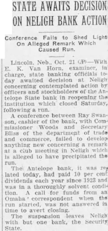 STATE AWAITS DECISION ON NELIGH BANK ACTION Conference Fails to Shed Light Alleged Which Caused Run. Lincoln. Oct. Van examiner, banking officials charge, decision Neligh concerning contemplated officers stockholders the telope State bank in institution which closed Saturday, conference Ray the bank, Bliss the of trade failed develop new alleged to have precipitated the bank, lated today, had paid 10 year since for funds from when Neligh one bank, the Security
