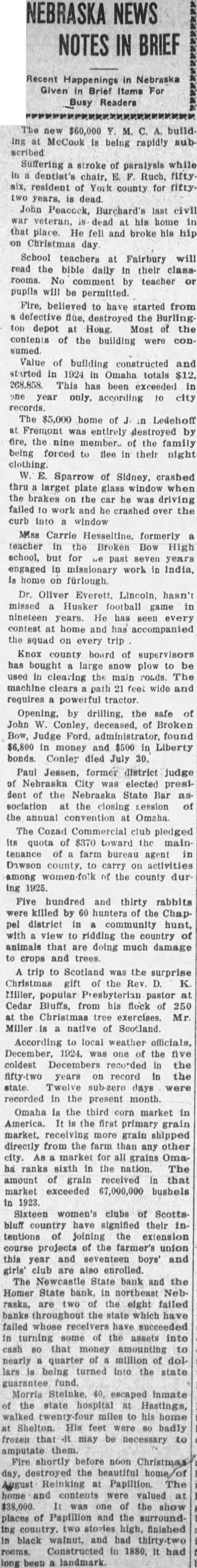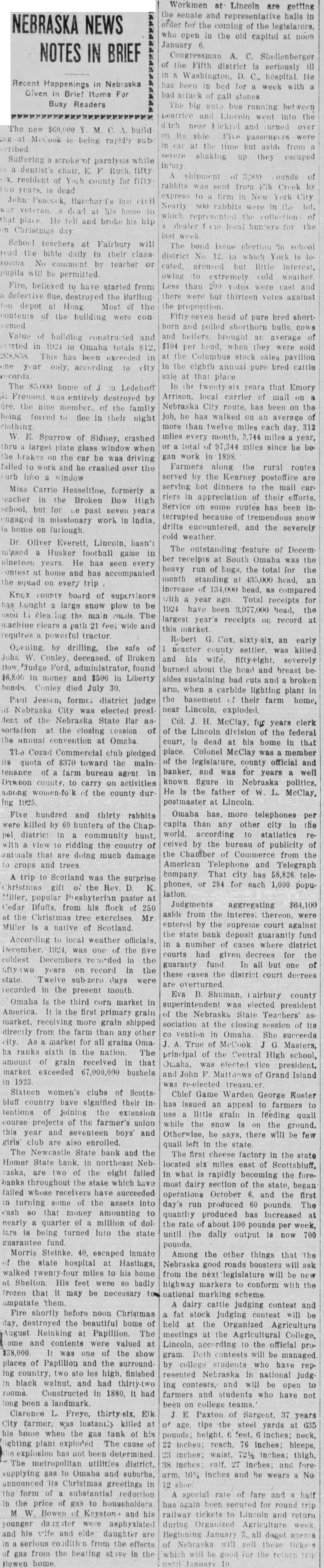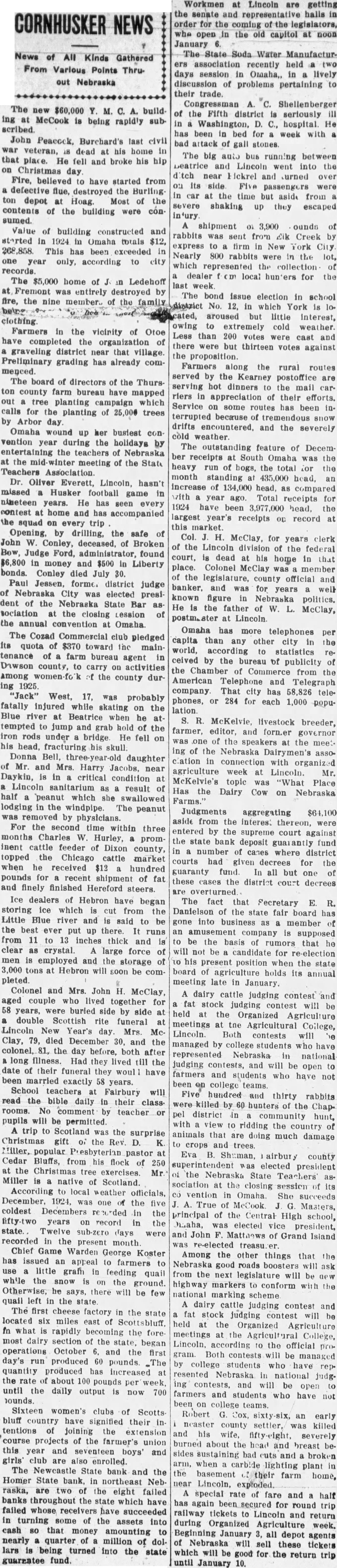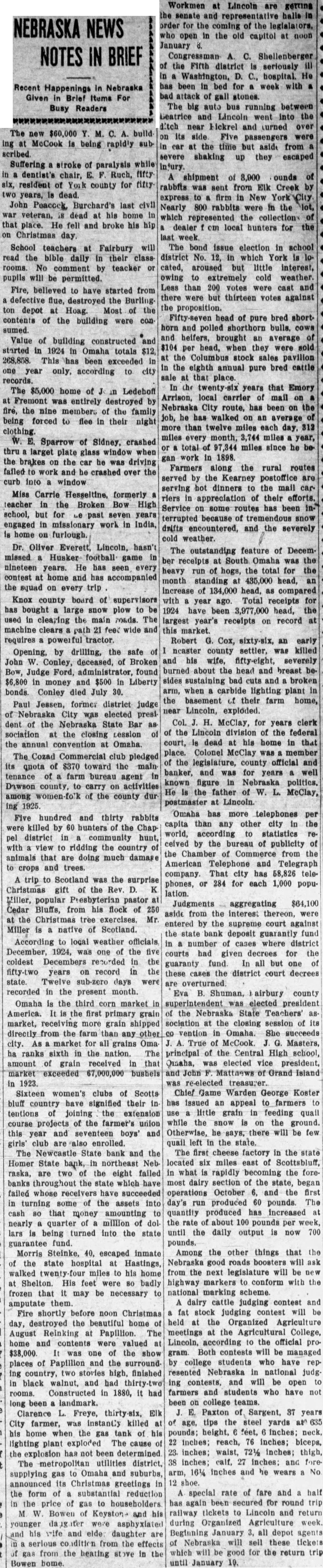 CONDENSED STATE NEWS The new $60,000 Y. M. C. A. build ing at McCook is being rapidly subSuffering a stroke of paralysis while in a dentist's chair, E. F. Ruch, fifty. six, resident of York county for fifty. two years, is dead. John Peacock, Burchard's last civil war veteran, is dead at his home in that place. He fell and broke his hip on Christmas day. School teachers at Fairbury will read the bible daily in their classrooms. No comment by teacher or pupils will be permitted. Fire, believed'to have started from a defective flue, destroyed the Burling ton depot at Hoag. Most of the contents of the building were con sumed. Value of building constructed and started in 1924 in Omaha totals $12, 268,858. This has been exceeded in one year only, according to city records. The $5,000 home of J in Ledehoff at Fremont was entirely destroyed by fire, the nine members of the family being forced to flee in their night clothing. W. E. Sparrow of Sidney, crashed thru larget plate glass window when the brakes on the car he was driving failed to work and he crashed over the curb into window Miss Carrie Hesseltine, formerly a teacher in the Broken Bow High school, but for Le past seven years engaged in missionary work in India, is home on furlough. Dr. Oliver Everett, Lincoln, hasn't missed a Husker football game in nineteen years. He has seen every contest at home and has accompanied the squad on every trip Knox county board of supervisors has bought a large snow plow to be used in clearing the main roads. The machine clears path 21 feet wide and requires a powerful tractor. Opening, by drilling, the safe of John W. Conley, deceased, of Broken Bow, Judge Ford, administrator, found $6,800 in money and $500 in Liberty bonds. Conley died July 30. Paul Jessen, former district judge of Nebraska City was elected president of the Nebraska State Bar as sociation at the closing Lession of the annual convention at Omaha. The Cozad Commercial club pledged its quota of $370 toward the maintenance of a farm bureau agent in Dawson county, to carry on activities among women-fo'k of the county dur ing 1925. Five hundred and thirty rabbits were killed by 60 hunters of the Chappel district in a community hunt, with a view to ridding the country of animals that are doing much damage to crops and trees. A trip to Scotland was the surprise Christmas gift of the Rev. D. K Miller, popular Presbyterian pastor at Cedar Bluffs, from his flock of 250 at the Christmas tree exercises. Mr. Miller is a native of Scotland. According to local weather officials December, 1924, was one of the five coldest Decembers recorded in the fifty-two years on record in the state. Twelve sub-zero days were recorded in the present month. Omaha is the third corn market in America. It is the first primary grain market, receiving more grain shipped directly from the farm than any other city. As a market for all grains Oma ha ranks sixth in the nation. The amount of grain received in that market exceeded 67,000,000 bushels in 1923. Sixteen women's clubs of Scotts bluff country have signified their in tentions of joining the extension course projects of the farmer's union this year and seventeen boys' and girls' club are also enrolled. The Newcastle State bank and the Homer State bank, in northeast Neb raska, are two of the eight failed banks throughout the state which have failed whose receivers have succeeded in turning some of the assets into cash 80 that money amounting to near'" a quarter of a million of dol lars id being turned into the state guarantee fund. Morris Steinke. 40, escaped inmate of the state hospital at Hastings walked twenty-four miles to his home at Shelton. His feet were 80 badly frozen that it may be necessary to amputate them. Fire shortly before noon Christmas day, destroyed the beautiful home 01 August Reinking at Papillion. The home and contents were valued a $38,000. It was one of the show places of Papillion and the surround ing country. two stories high, finished in black walnut, and had thirty-two rooms. Constructed in 1880. it had long been a landmark. Clarence L. Freye, thirty-six, Elk City farmer, was instantly killed at his home when the gas tank of his lighting plant exploded The cause of the explosion has not been determined The metropolitan utilities district, supplying gas to Omaha and suburbs, announced its Christmas greetings in the form of a substantial reduction in the price of gas to householders. M. W. Bowen of Keyston- and his younger daughter were asphyxiated and his wife and elde: daughter are in a serious condition from the effects of gas from the heating stove in the Bowen home. Workmen at Lincoln are getting the senate and representative halls in order for the coming of the legislators, who open in the old capitol at noon January 6. Congressman A. C. Shellenberger of the Fifth district is seriously III in a Washington, D. C., hospital. He has been in bed for a week with.a bad attack of gall stones. The big auto bus running between Beatrice and Lincoln went into the itch near Hickrel and turned over on its side. Five passengers were in car at the time but aside from a severe shaking up they escaped injury. A shipment of 3,900 ounds of rabbits was sent from Elk Creek by express to a firm in New York City. Nearly 800 rabbits were in the lot, which represented the collections of a dealer f om local hunters for the last week. The bond issue election in school district No. 12, in which York is located, aroused but little interest, owing to extremely cold weather. Less than. 200 votes were cast and there were but thirteen votes against the proposition. Fifty-seven head of pure bred shorthorn and polled shorthorn bulls, cows and helfers, brought an average of $104 per head, when they were sold at the Columbus stock sales pavilion in the eighth annual pure bred cattle sale at that place. In the twenty-six years that Emory Arrison, local carrier of mall on a Nebraska City route, has been on the job, he has walke