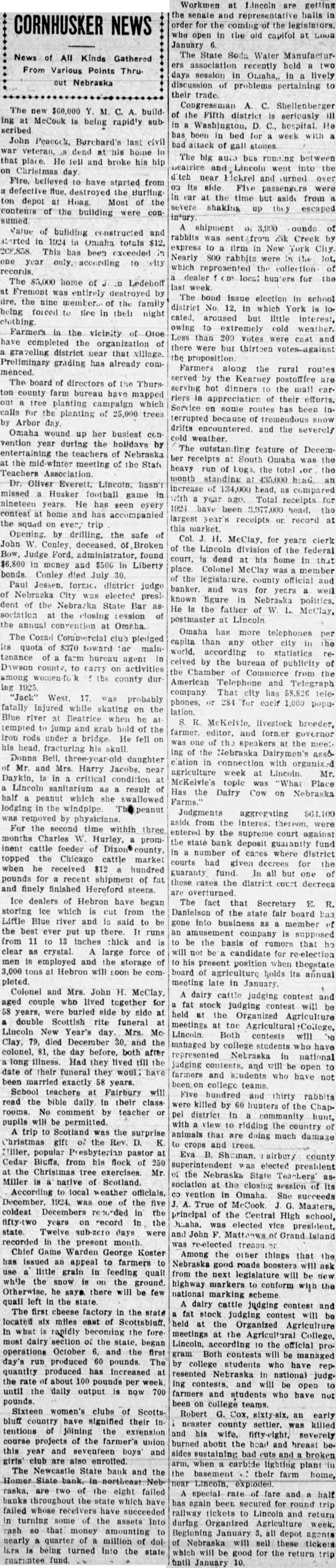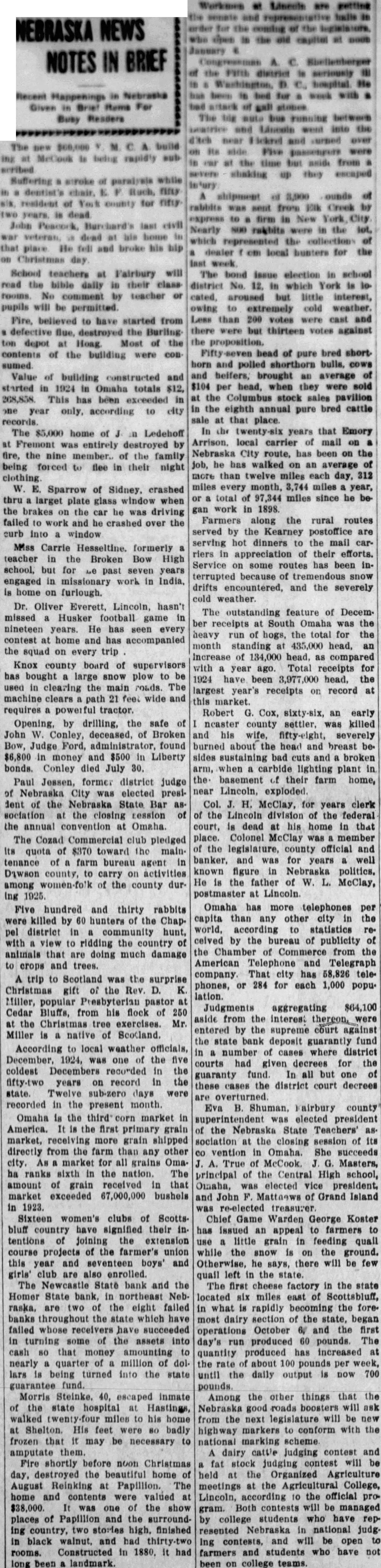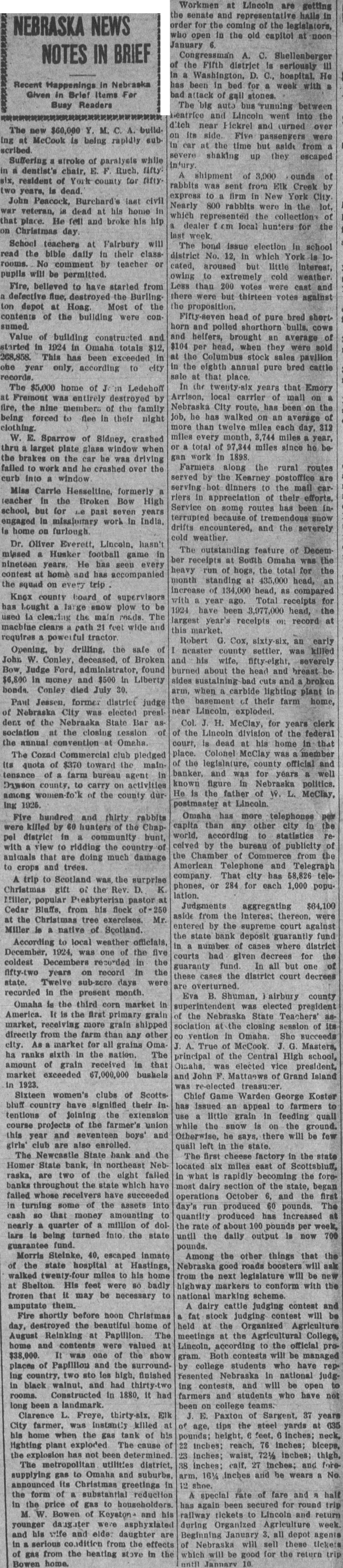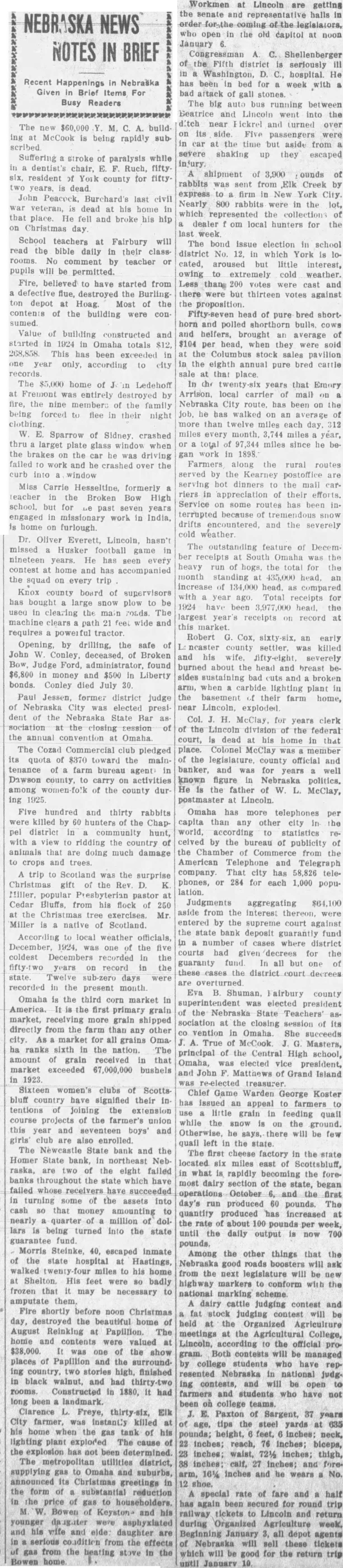CONDENSED STATE NEWS The new $60,000 Y. M. C. A. build ing at McCook is being rapidly subSuffering a stroke of paralysis while in a dentist's chair, E. F. Ruch, fifty. six, resident of York county for fifty. two years, is dead. John Peacock, Burchard's last civil war veteran, is dead at his home in that place. He fell and broke his hip on Christmas day. School teachers at Fairbury will read the bible daily in their classrooms. No comment by teacher or pupils will be permitted. Fire, believed'to have started from a defective flue, destroyed the Burling ton depot at Hoag. Most of the contents of the building were con sumed. Value of building constructed and started in 1924 in Omaha totals $12, 268,858. This has been exceeded in one year only, according to city records. The $5,000 home of J in Ledehoff at Fremont was entirely destroyed by fire, the nine members of the family being forced to flee in their night clothing. W. E. Sparrow of Sidney, crashed thru larget plate glass window when the brakes on the car he was driving failed to work and he crashed over the curb into window Miss Carrie Hesseltine, formerly a teacher in the Broken Bow High school, but for Le past seven years engaged in missionary work in India, is home on furlough. Dr. Oliver Everett, Lincoln, hasn't missed a Husker football game in nineteen years. He has seen every contest at home and has accompanied the squad on every trip Knox county board of supervisors has bought a large snow plow to be used in clearing the main roads. The machine clears path 21 feet wide and requires a powerful tractor. Opening, by drilling, the safe of John W. Conley, deceased, of Broken Bow, Judge Ford, administrator, found $6,800 in money and $500 in Liberty bonds. Conley died July 30. Paul Jessen, former district judge of Nebraska City was elected president of the Nebraska State Bar as sociation at the closing Lession of the annual convention at Omaha. The Cozad Commercial club pledged its quota of $370 toward the maintenance of a farm bureau agent in Dawson county, to carry on activities among women-fo'k of the county dur ing 1925. Five hundred and thirty rabbits were killed by 60 hunters of the Chappel district in a community hunt, with a view to ridding the country of animals that are doing much damage to crops and trees. A trip to Scotland was the surprise Christmas gift of the Rev. D. K Miller, popular Presbyterian pastor at Cedar Bluffs, from his flock of 250 at the Christmas tree exercises. Mr. Miller is a native of Scotland. According to local weather officials December, 1924, was one of the five coldest Decembers recorded in the fifty-two years on record in the state. Twelve sub-zero days were recorded in the present month. Omaha is the third corn market in America. It is the first primary grain market, receiving more grain shipped directly from the farm than any other city. As a market for all grains Oma ha ranks sixth in the nation. The amount of grain received in that market exceeded 67,000,000 bushels in 1923. Sixteen women's clubs of Scotts bluff country have signified their in tentions of joining the extension course projects of the farmer's union this year and seventeen boys' and girls' club are also enrolled. The Newcastle State bank and the Homer State bank, in northeast Neb raska, are two of the eight failed banks throughout the state which have failed whose receivers have succeeded in turning some of the assets into cash 80 that money amounting to near'" a quarter of a million of dol lars id being turned into the state guarantee fund. Morris Steinke. 40, escaped inmate of the state hospital at Hastings walked twenty-four miles to his home at Shelton. His feet were 80 badly frozen that it may be necessary to amputate them. Fire shortly before noon Christmas day, destroyed the beautiful home 01 August Reinking at Papillion. The home and contents were valued a $38,000. It was one of the show places of Papillion and the surround ing country. two stories high, finished in black walnut, and had thirty-two rooms. Constructed in 1880. it had long been a landmark. Clarence L. Freye, thirty-six, Elk City farmer, was instantly killed at his home when the gas tank of his lighting plant exploded The cause of the explosion has not been determined The metropolitan utilities district, supplying gas to Omaha and suburbs, announced its Christmas greetings in the form of a substantial reduction in the price of gas to householders. M. W. Bowen of Keyston- and his younger daughter were asphyxiated and his wife and elde: daughter are in a serious condition from the effects of gas from the heating stove in the Bowen home. Workmen at Lincoln are getting the senate and representative halls in order for the coming of the legislators, who open in the old capitol at noon January 6. Congressman A. C. Shellenberger of the Fifth district is seriously III in a Washington, D. C., hospital. He has been in bed for a week with.a bad attack of gall stones. The big auto bus running between Beatrice and Lincoln went into the itch near Hickrel and turned over on its side. Five passengers were in car at the time but aside from a severe shaking up they escaped injury. A shipment of 3,900 ounds of rabbits was sent from Elk Creek by express to a firm in New York City. Nearly 800 rabbits were in the lot, which represented the collections of a dealer f om local hunters for the last week. The bond issue election in school district No. 12, in which York is located, aroused but little interest, owing to extremely cold weather. Less than. 200 votes were cast and there were but thirteen votes against the proposition. Fifty-seven head of pure bred shorthorn and polled shorthorn bulls, cows and helfers, brought an average of $104 per head, when they were sold at the Columbus stock sales pavilion in the eighth annual pure bred cattle sale at that place. In the twenty-six years that Emory Arrison, local carrier of mall on a Nebraska City route, has been on the job, he has walke