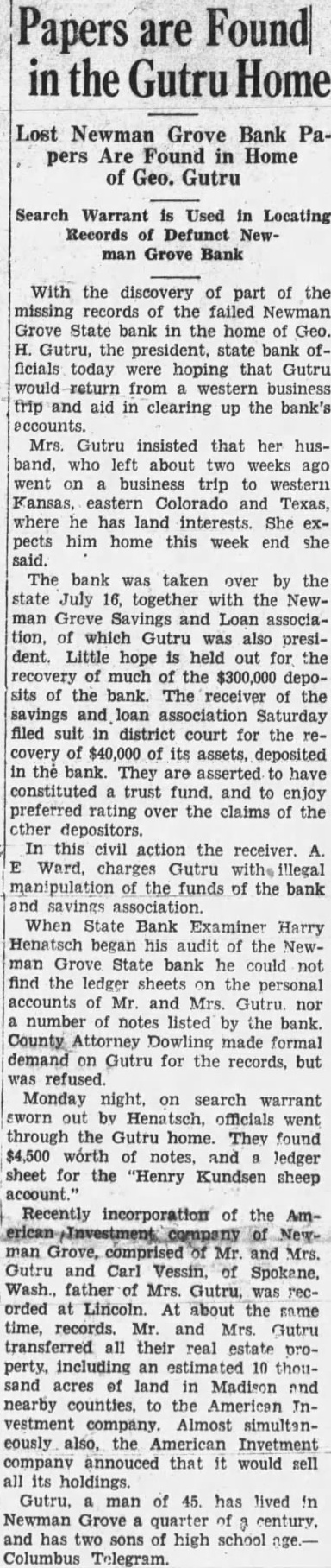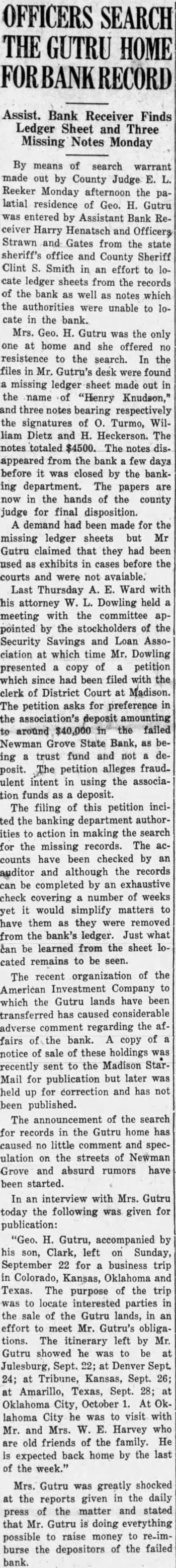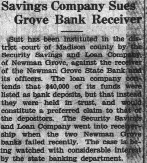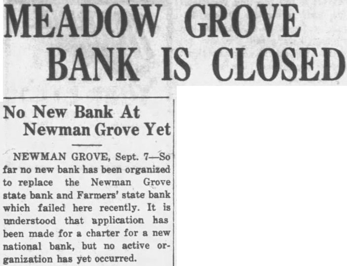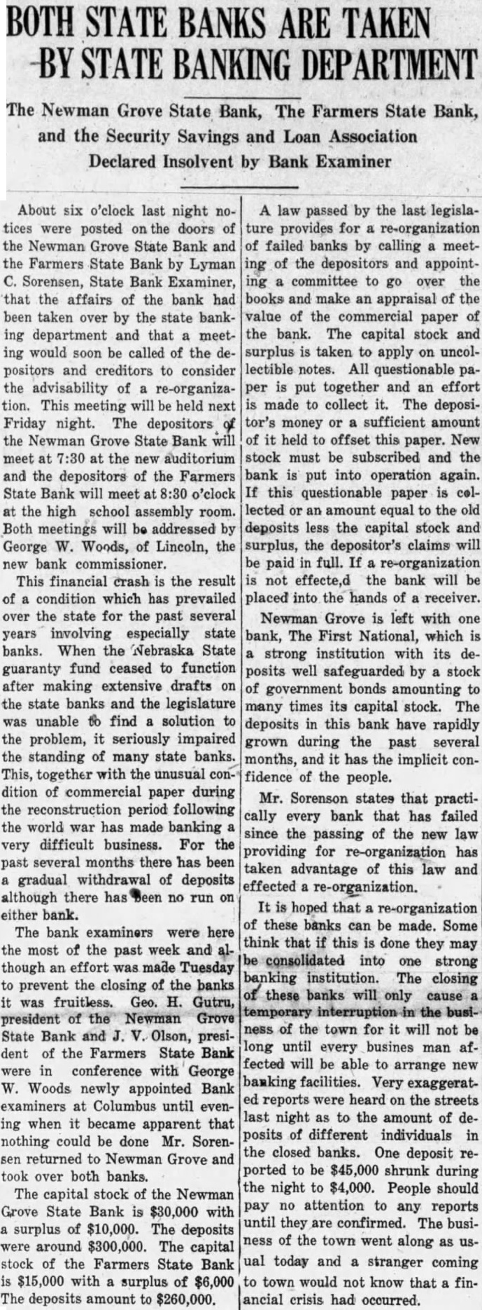 BOTH STATE BANKS ARE TAKEN BANKING DEPARTMENT The Newman Grove State Bank, The Farmers State Bank, and the Security Savings and Loan Association Declared Insolvent by Bank Examiner About six o'clock last night notices were posted the doors of the Newman Grove State Bank and the Farmers State Bank by Lyman C. Sorensen, State Bank Examiner, that the affairs of the bank had been taken over by the state banking department and that a meeting would soon be called of the positors and creditors to consider the advisability of re-organization. This meeting will be held next Friday night. The depositors the Newman Grove State Bank will meet at 7:30 at the new auditorium and the depositors of the Farmers State Bank will meet 8:30 o'clock at the high school assembly room. Both meetings will be addressed by George W. Woods, of Lincoln, the new bank commissioner. This financial crash is the result of condition which has prevailed over the state for the past several years involving especially state banks. When the Nebraska State guaranty fund ceased to function after making extensive drafts on the state banks and the legislature was unable to find solution to the problem, it seriously impaired the standing of many state banks. This, together with the unusual dition of commercial paper during the reconstruction period following the world war has made banking very difficult business. For the past several months there has been gradual withdrawal of deposits although there no run on either bank. The bank examiners were here the most of the past week and though an effort was made Tuesday to prevent the closing of the banks was fruitless. Geo. H. Gutru, president of the State Bank and Olson, president of the Farmers State Bank were in conference with George W. Woods newly appointed Bank examiners at Columbus until evening when it became apparent that nothing could be done Mr. Sorensen returned to Newman Grove and took over both banks. The capital stock of the Newman Grove State Bank is $30,000 with surplus of $10,000. The deposits were around $300,000. The capital stock of the Farmers State Bank is $15,000 with surplus of $6,000 The deposits amount to A law passed by the last legislature provides for re-organization of failed banks by calling meetof the depositors and appointing committee to go over the books and make an appraisal of the value of the commercial paper of the bank. The capital stock and surplus is taken to apply on uncollectible notes. All questionable is put together and an effort per made to collect it. The depositor's money or sufficient amount of it held to offset this paper. New stock must be subscribed and the bank is put into operation again. If this questionable paper is collected or an amount equal to the old deposits less the capital stock and surplus, the depositor's claims will be paid in full. If a re-organization not effecte,d the bank will be placed into the hands of receiver. Newman Grove is left with one bank, The First National, which is strong institution with its deposits well safeguarded by stock of government bonds amounting to many times its capital stock. The deposits in this bank have rapidly grown during the past several months, and it has the implicit confidence of the people. Mr. Sorenson states that practically every bank that has failed since the passing of the new law providing for re-organization has taken advantage of this law and effected re-organization. It is hoped that re-organization of these banks can be made. Some think that if this is done they may be consolidated into one strong banking institution. The closing these banks will only the ness of the town for it will not be long until every busines man affected will be able to arrange new banking facilities. Very exaggeratreports were heard on the streets last night as to the amount of deposits of different individuals the closed banks. One deposit ported to be $45,000 shrunk during the night to $4,000. People should pay no attention to any reports until they are confirmed. The business of the town went along as ual today and stranger coming to town would not know that financial crisis had occurred.